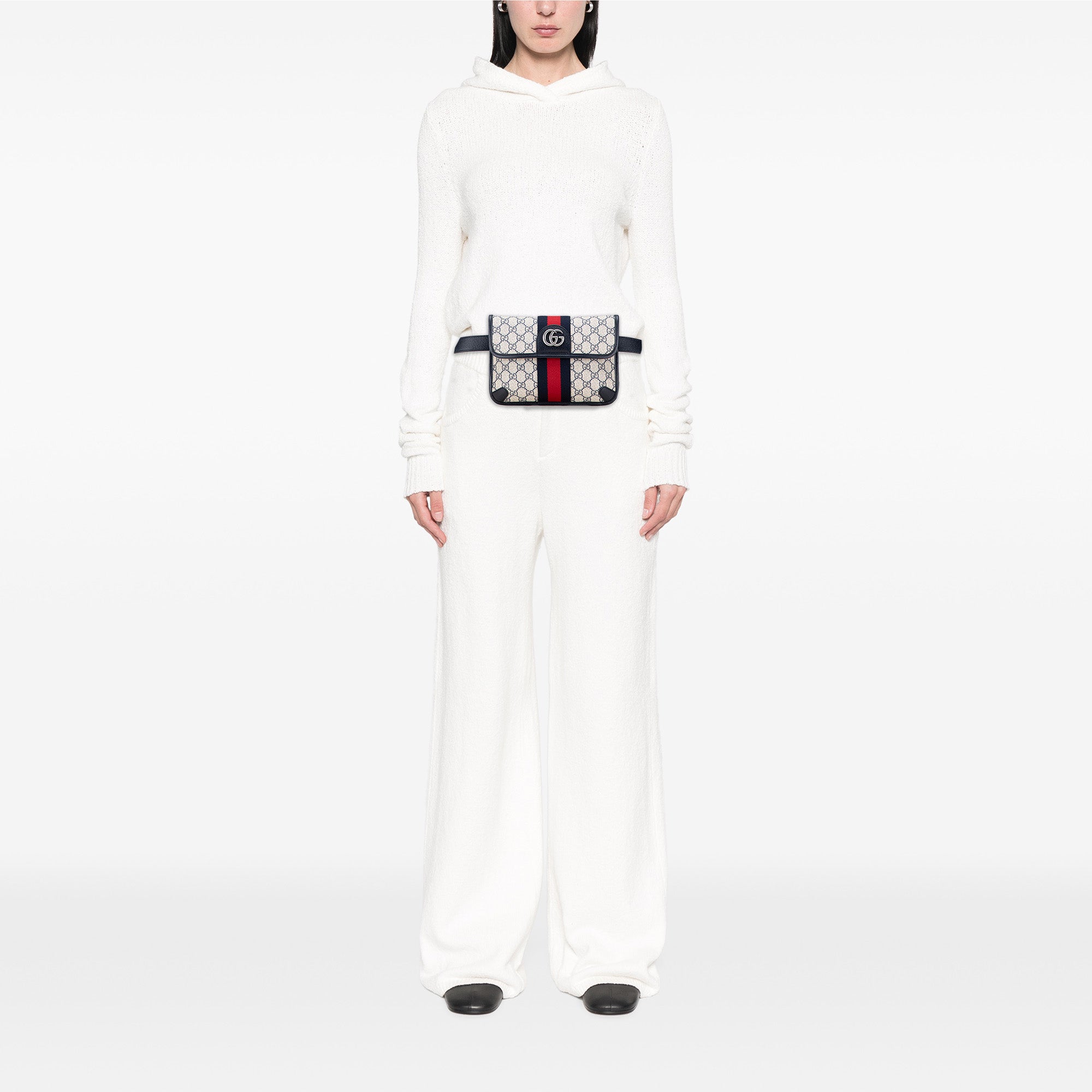 The Ophidia Belt Bag features a coated canvas body with leather trim and web detail, an adjustable flat canvas strap, and a front flap with magnetic snap closure. Inclusion: Dust bag. Retail Price: 1248.00