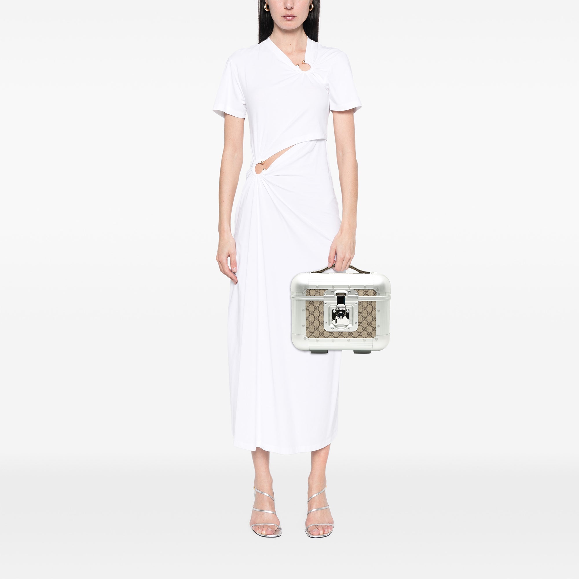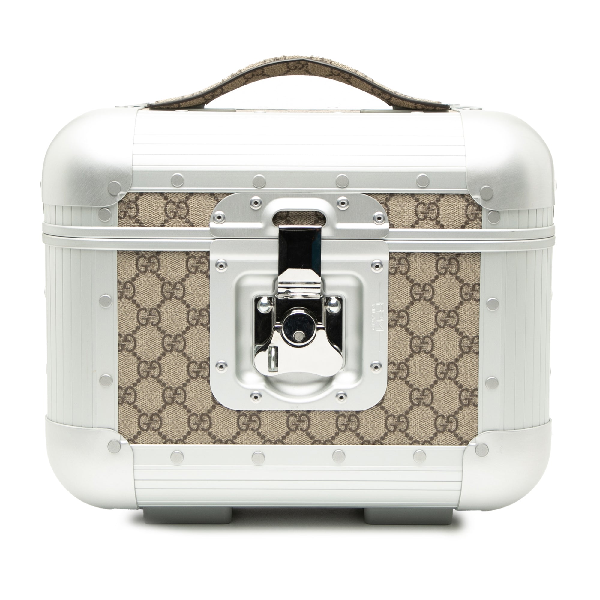 This vanity case features a coated canvas body with aluminum trim, a flat leather top handle, a front clasp closure, interior pockets and zip pouch inclusion. Inclusion: Dust bag. Retail Price: 3560.00