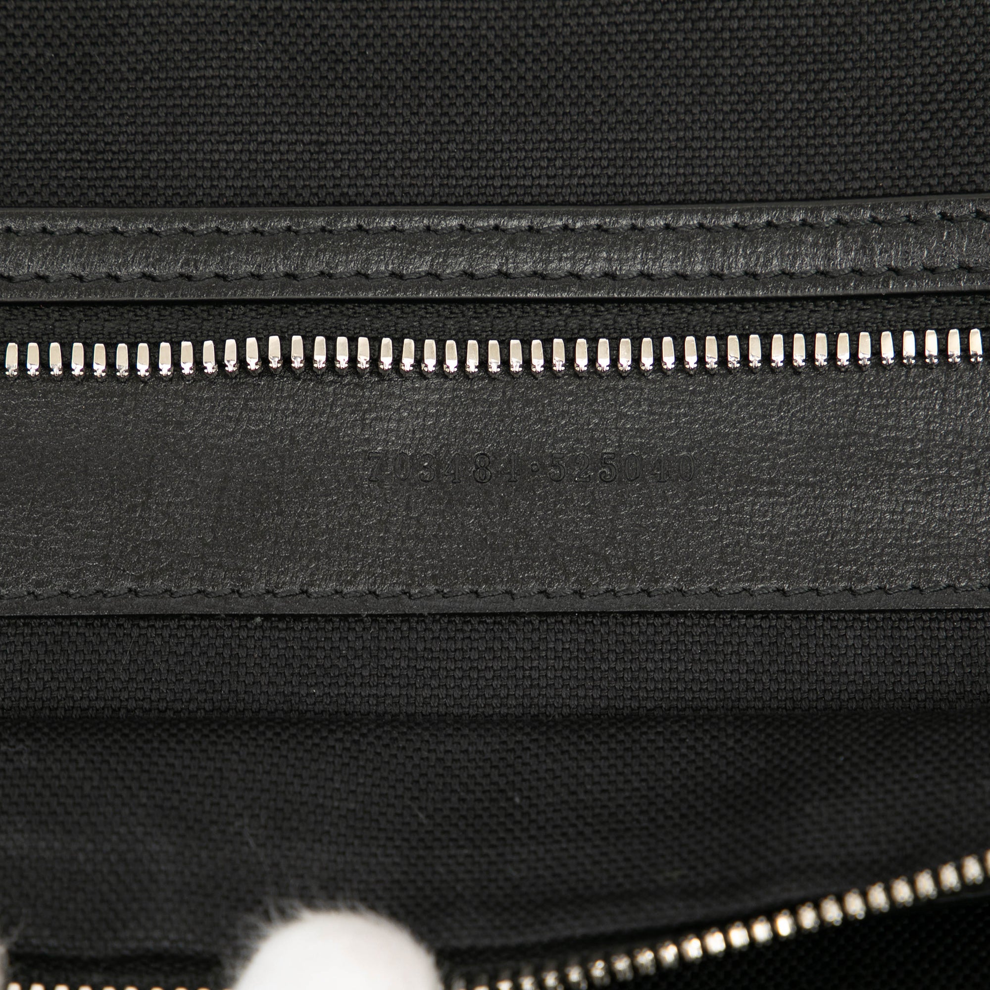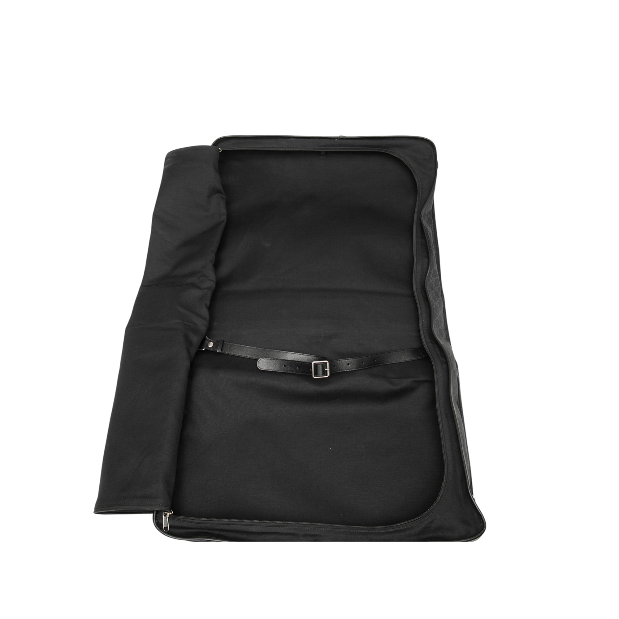 This garment bag features a coated canvas body with leather trim, a rolled leather top handle, a detachable flat strap, side hook closures, an exterior zip pocket, an interior zip compartment, and interior zip pockets. Inclusion: Dust bag. Retail Price: 3980.00