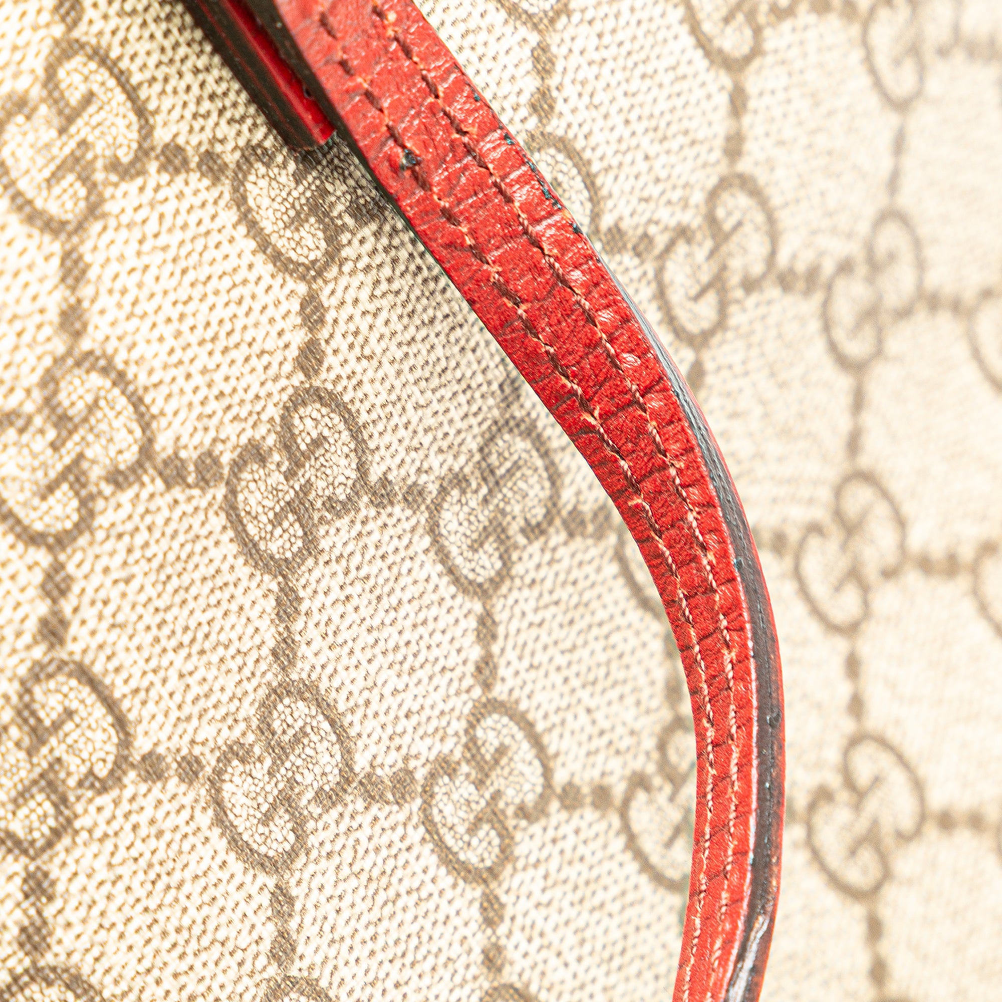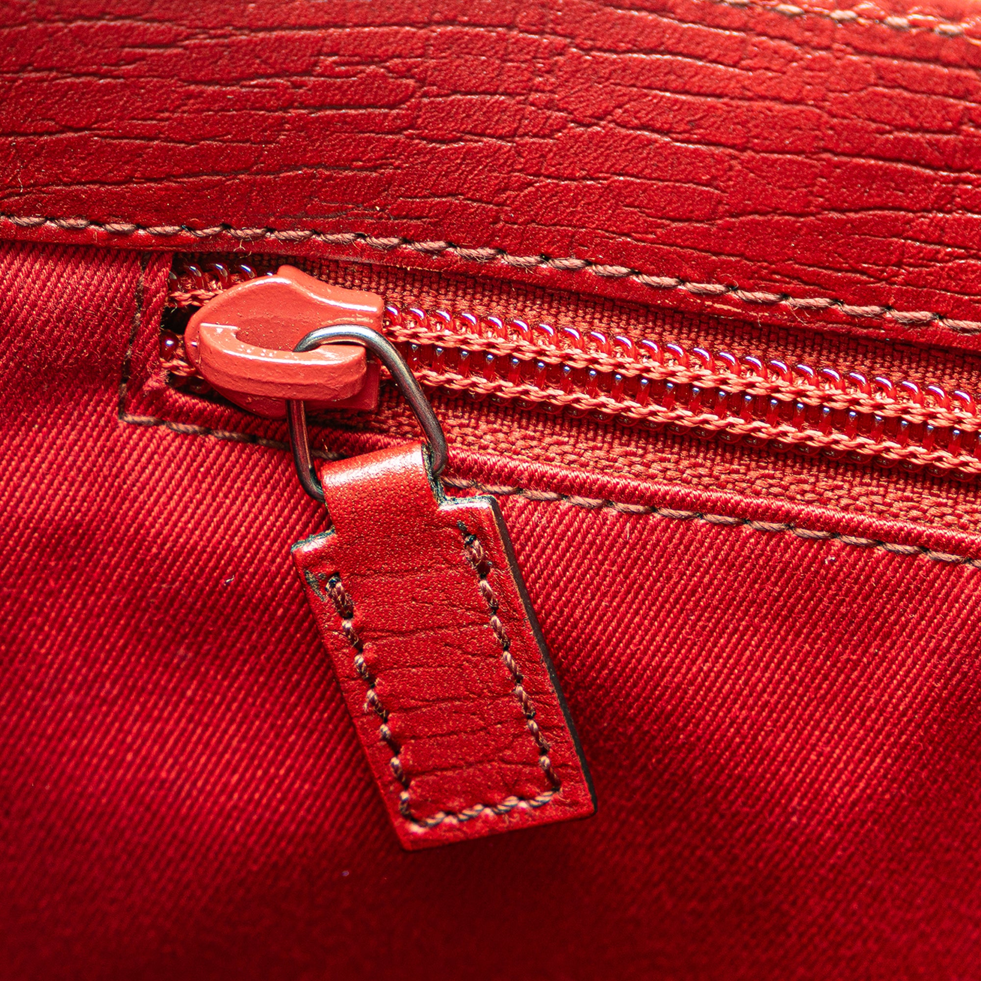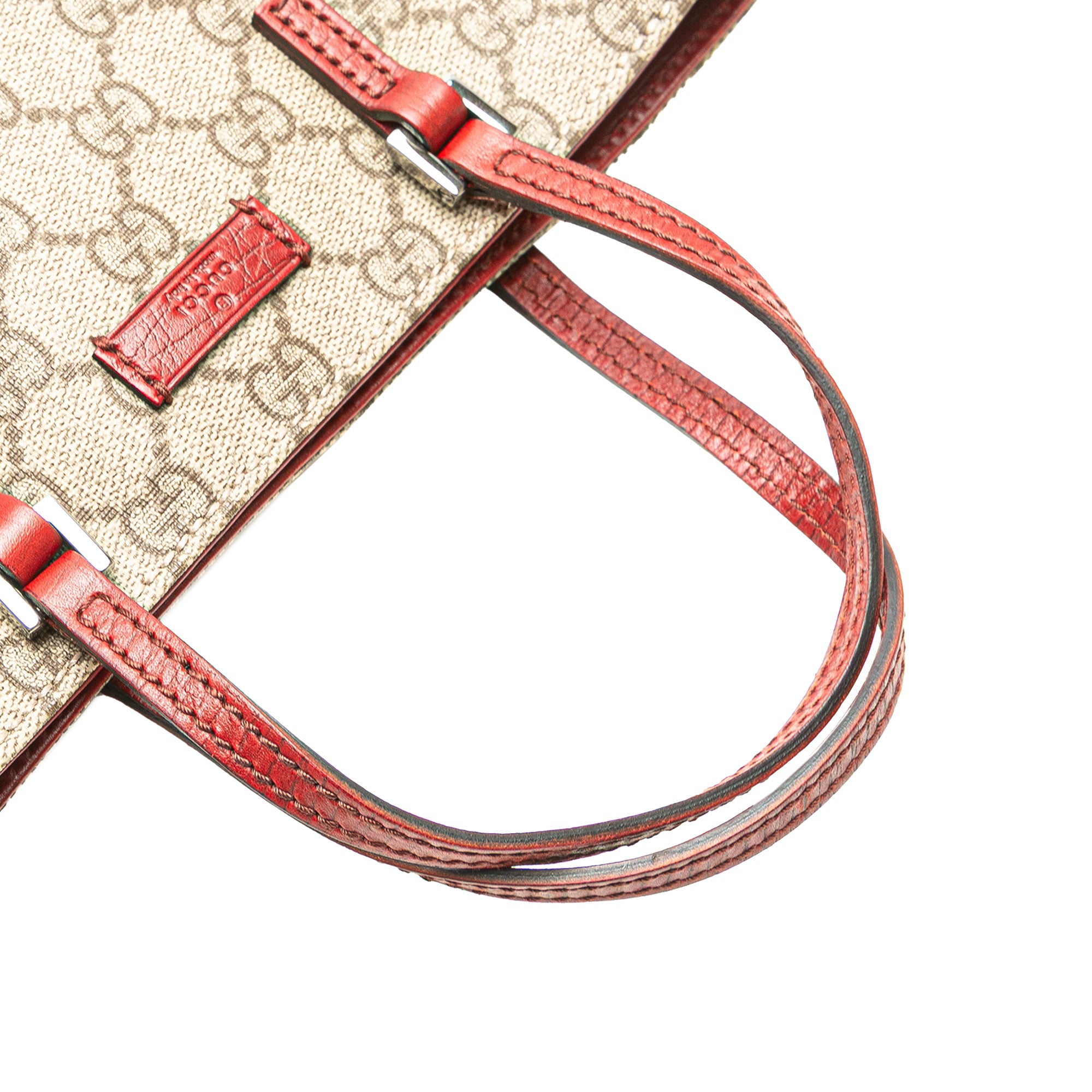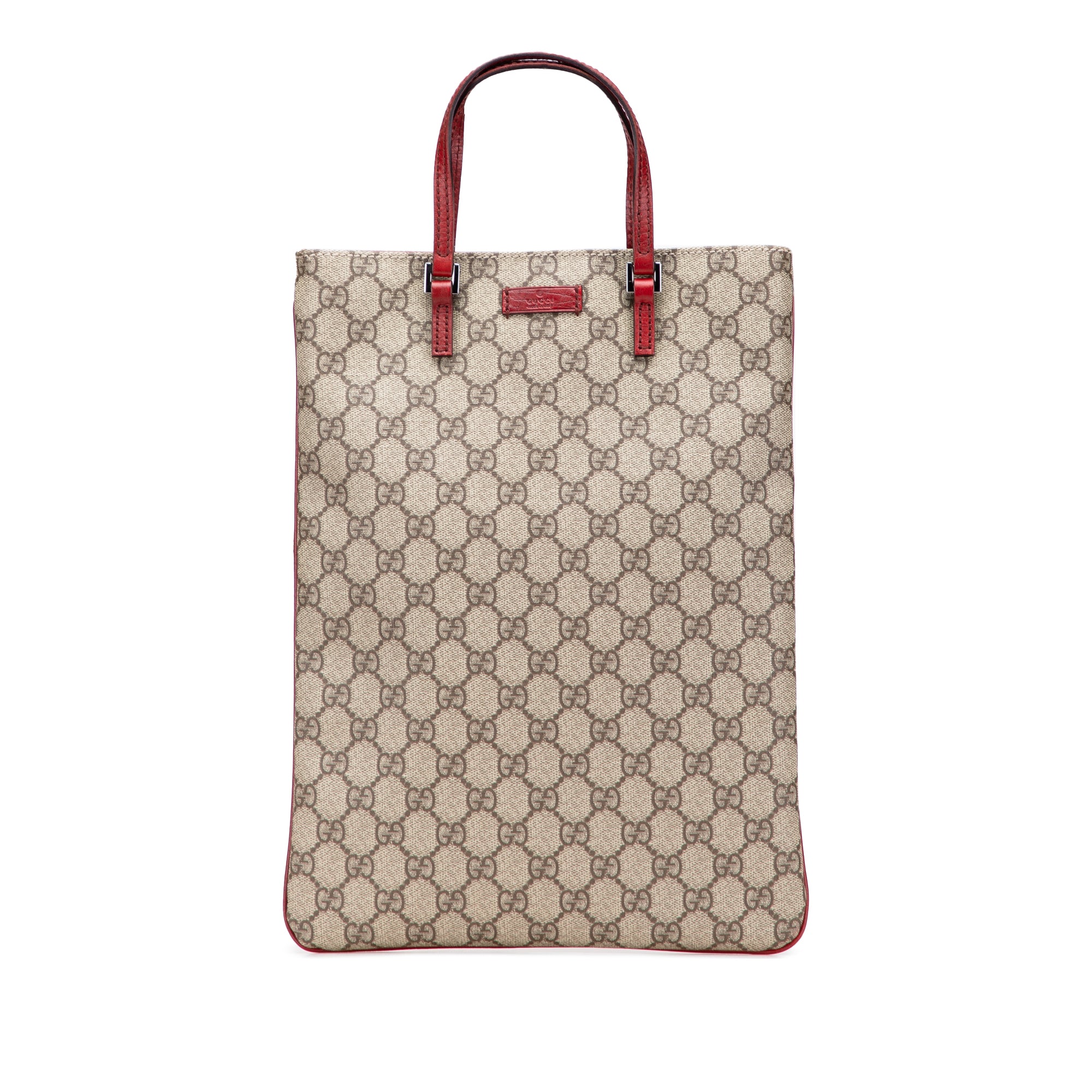 This tote bag features a coated canvas body with leather trim, flat leather straps, an open top with magnetic snap closure, and an interior zip pocket. Retail Price: 1200.00