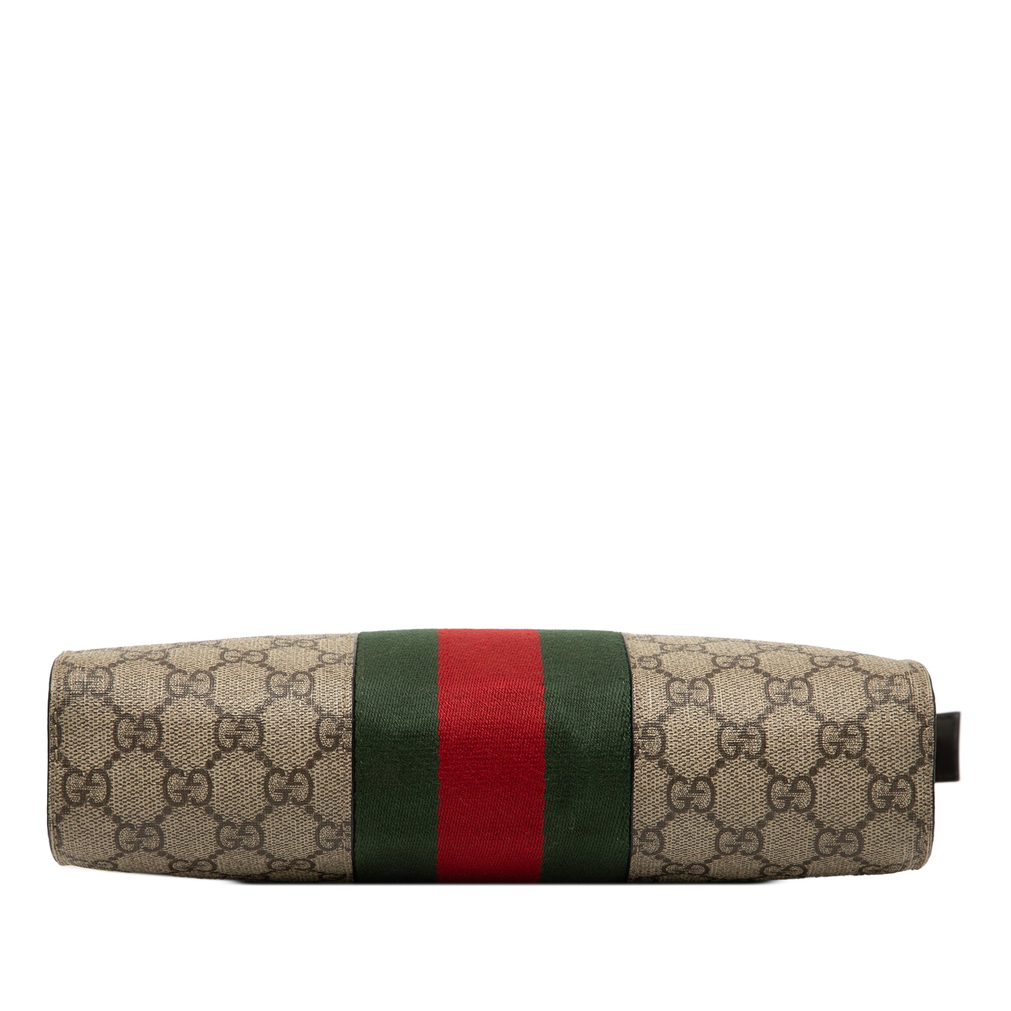 This clutch bag features a coated canvas body with leather trim and web detail, a top zip closure, and an interior slip pocket. Retail Price: 890.00