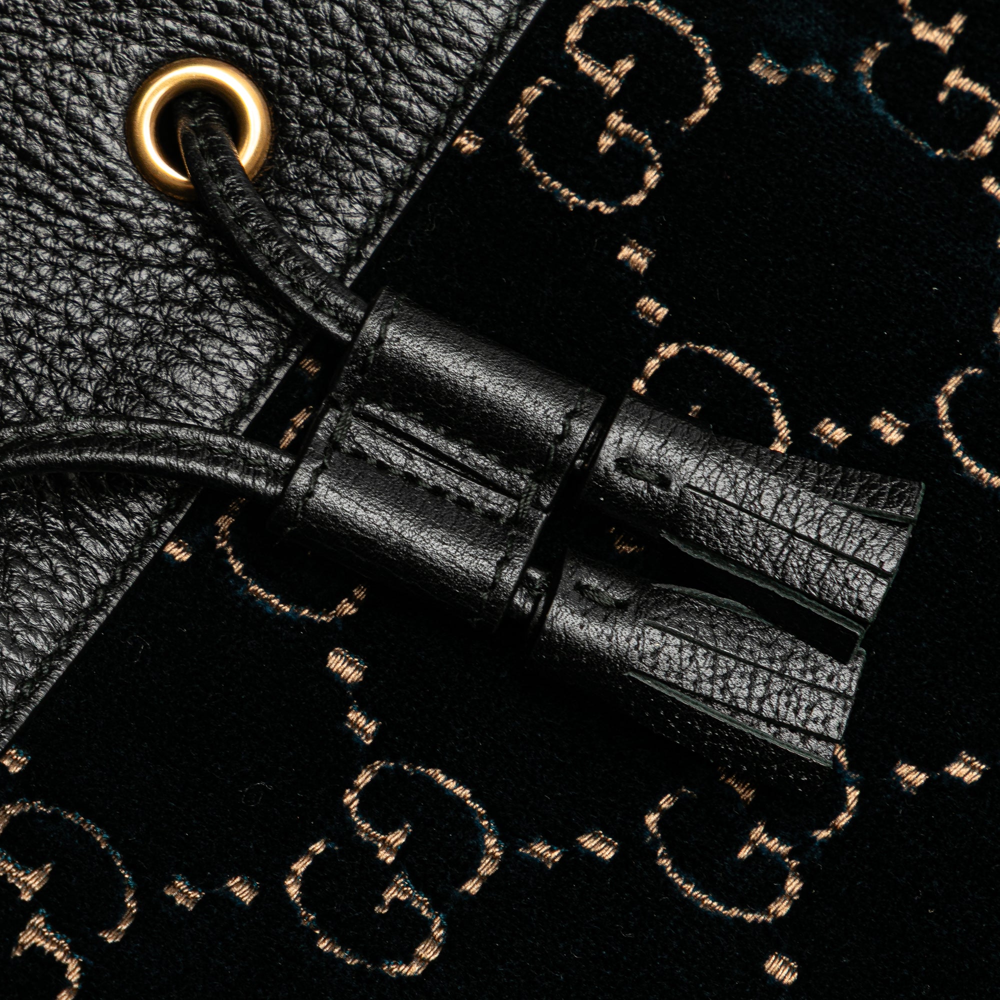 This bucket bag features a velvet body with leather trim, an adjustable flat leather shoulder strap, and a top drawstring closure. Retail Price: 1350.00