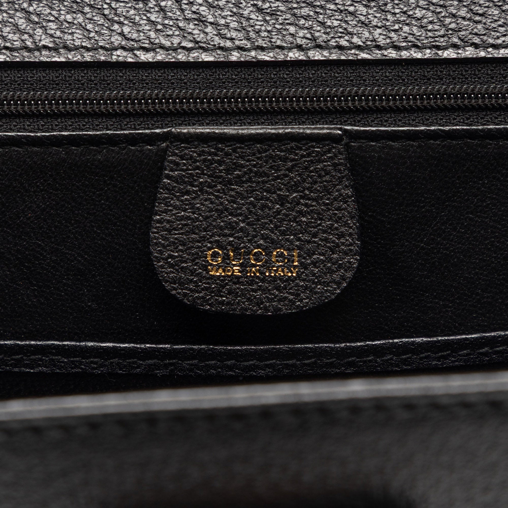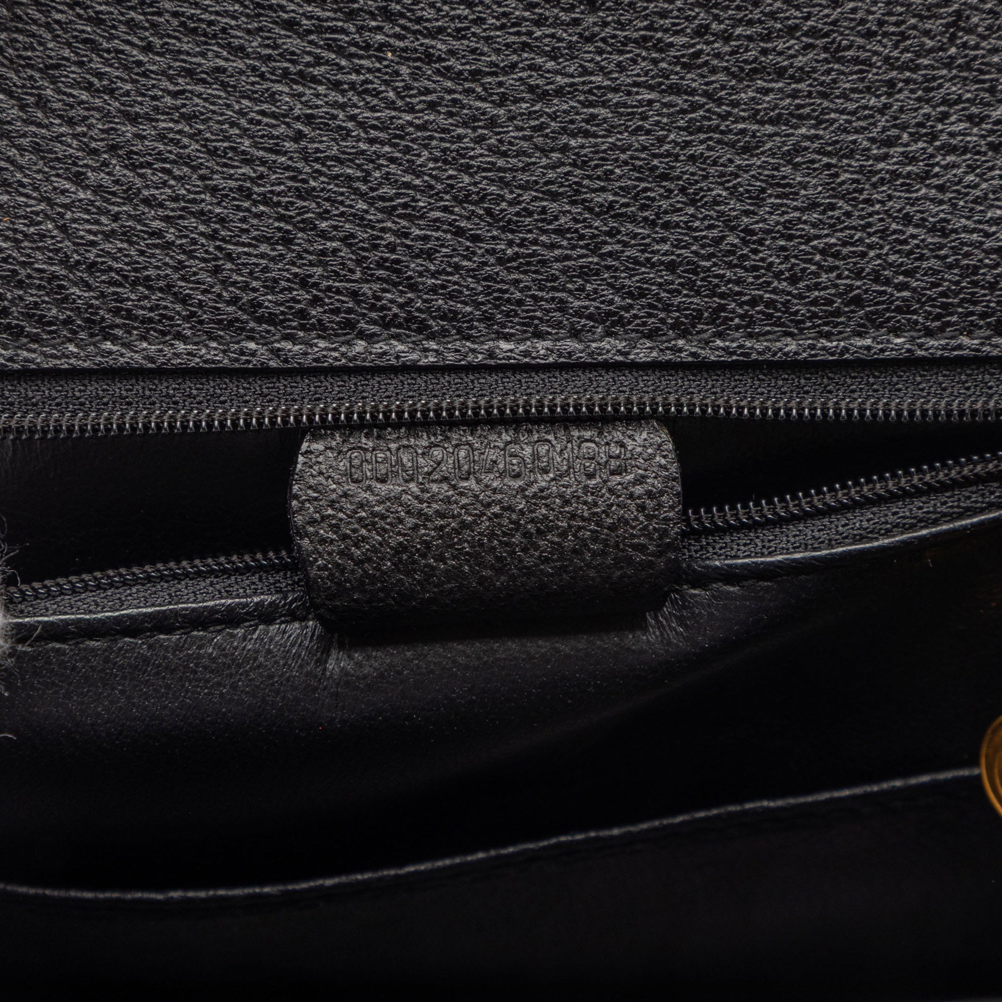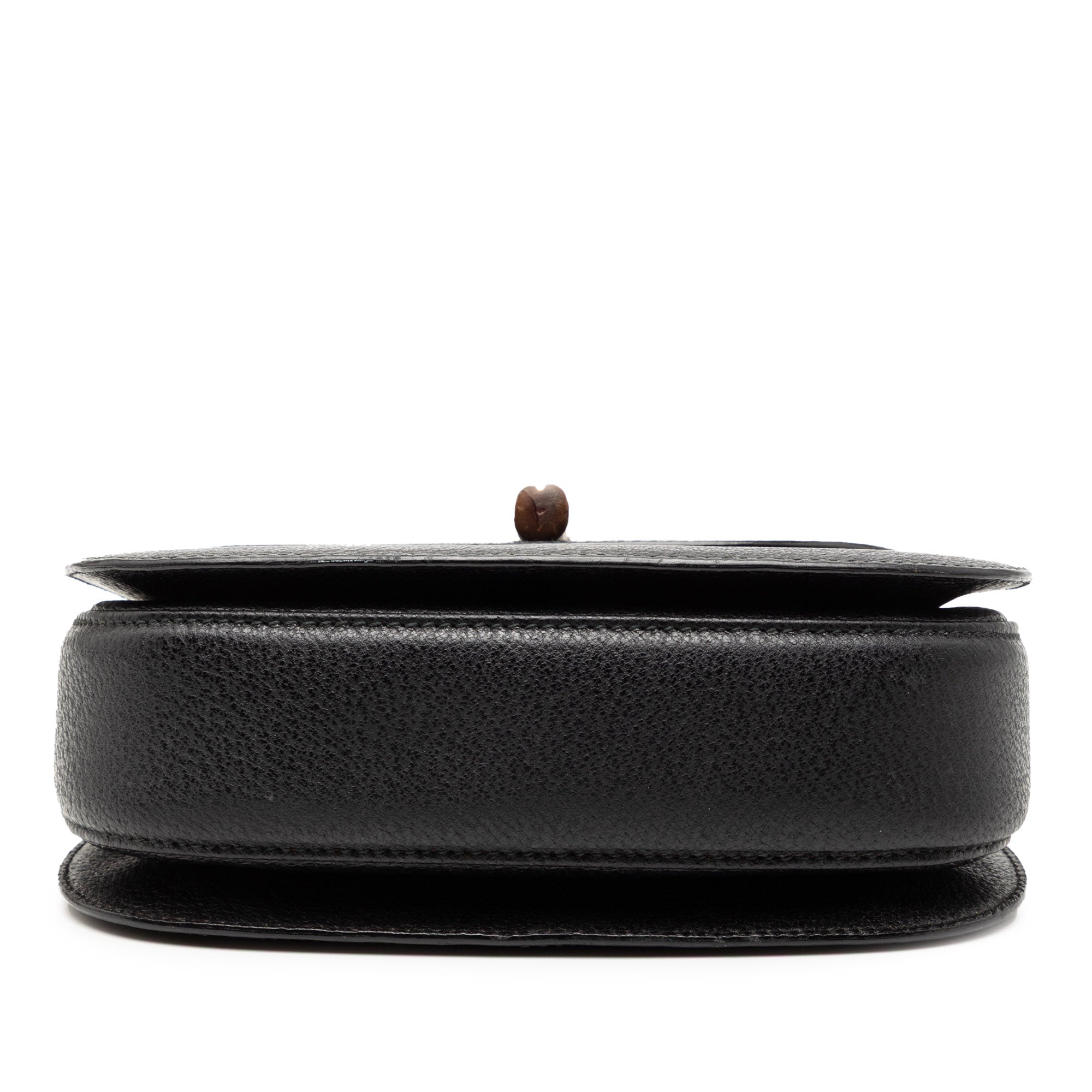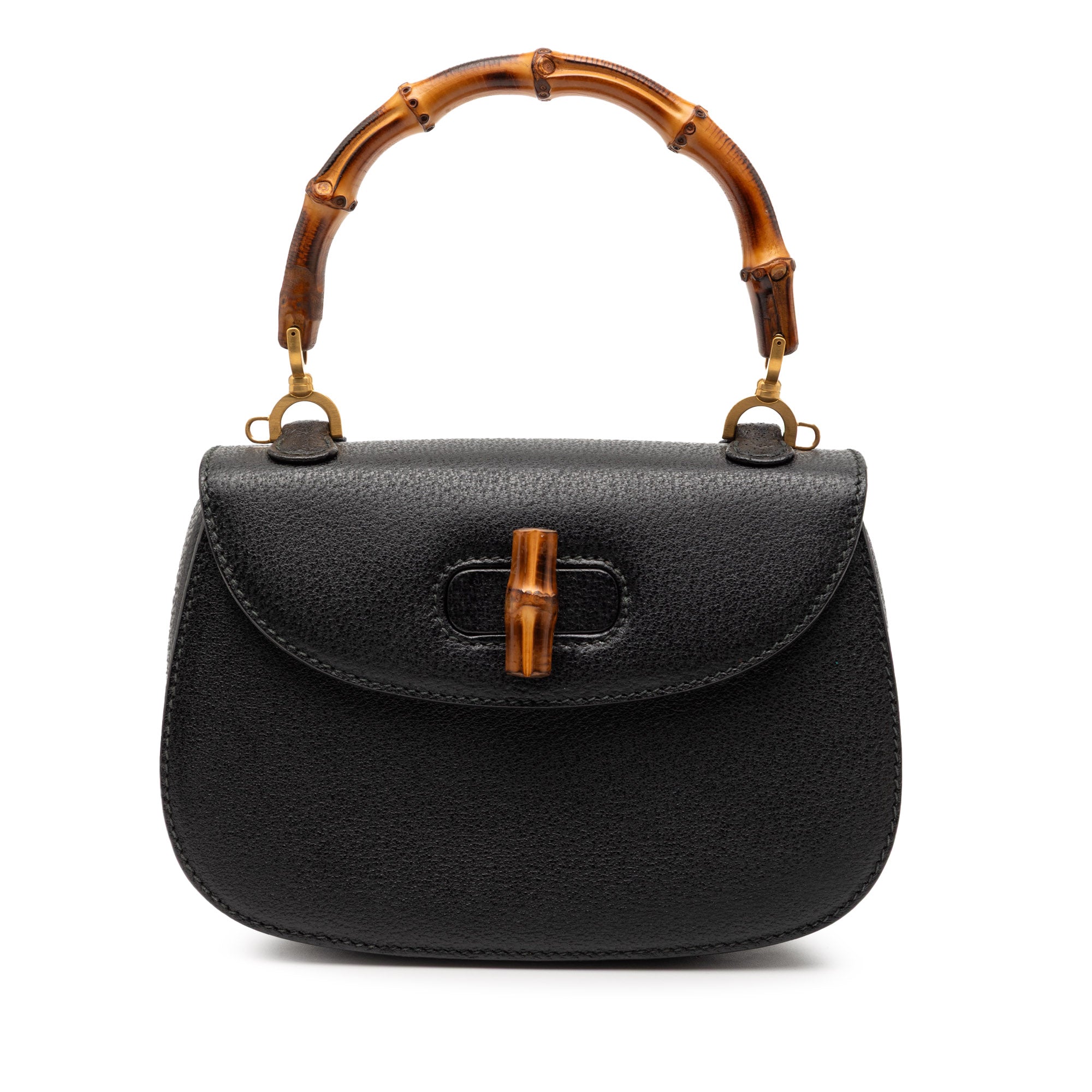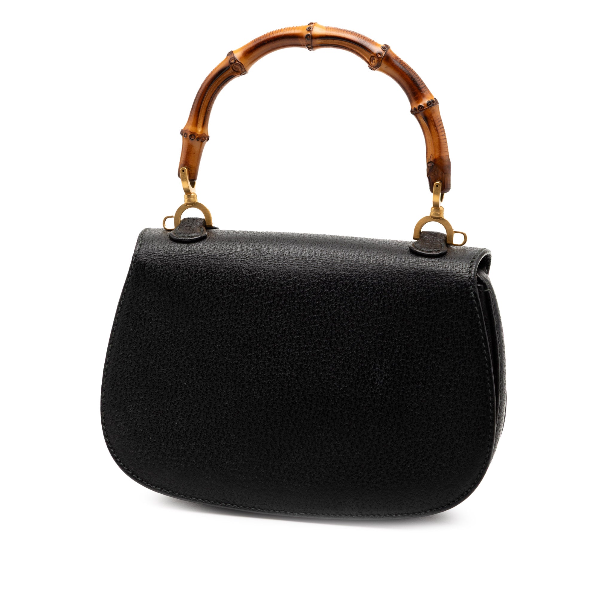 This satchel features a leather body, a bamboo top handle, a detachable flat leather shoulder strap, a front flap with a bamboo twist lock closure, and interior zip and slip pockets. Retail Price: 2650.00