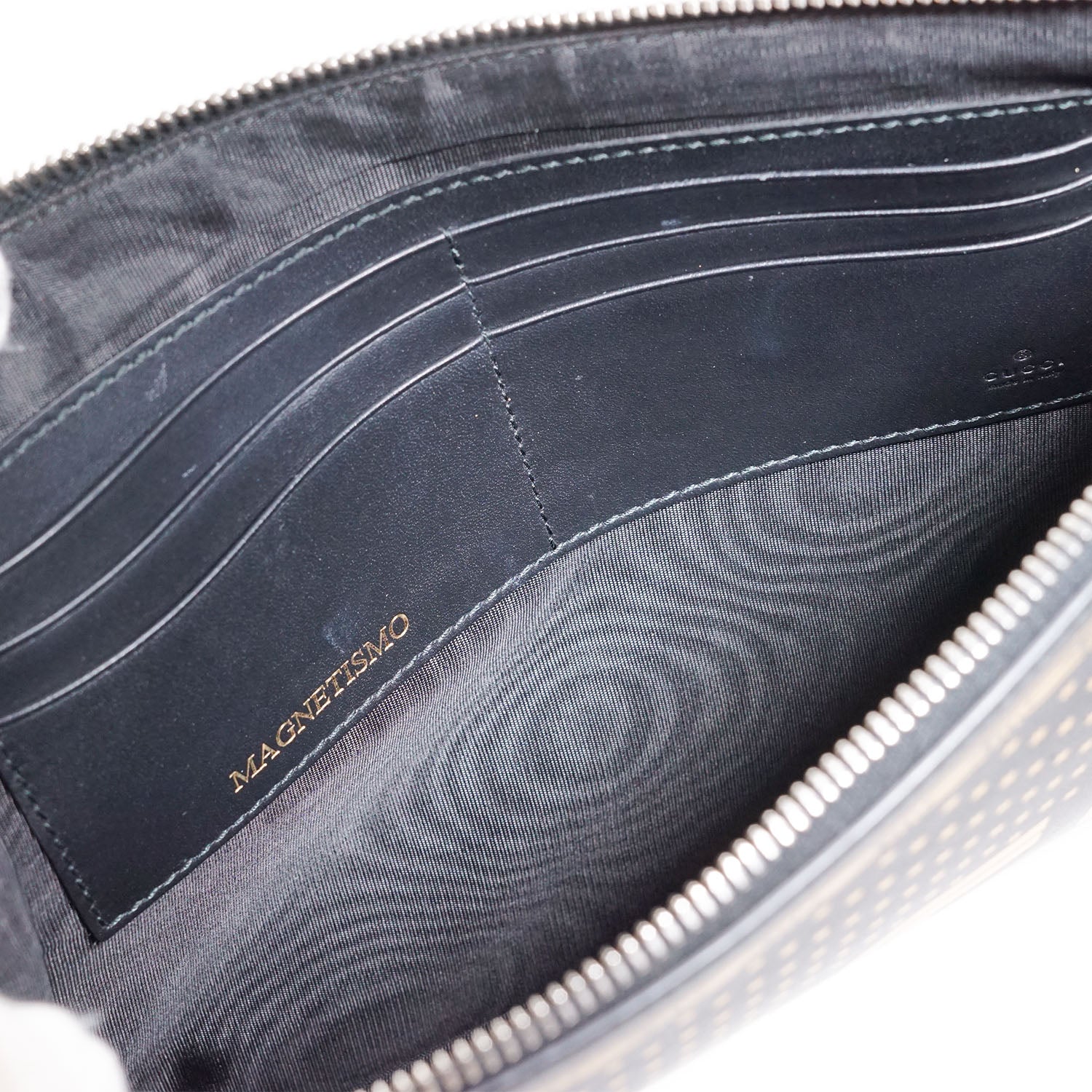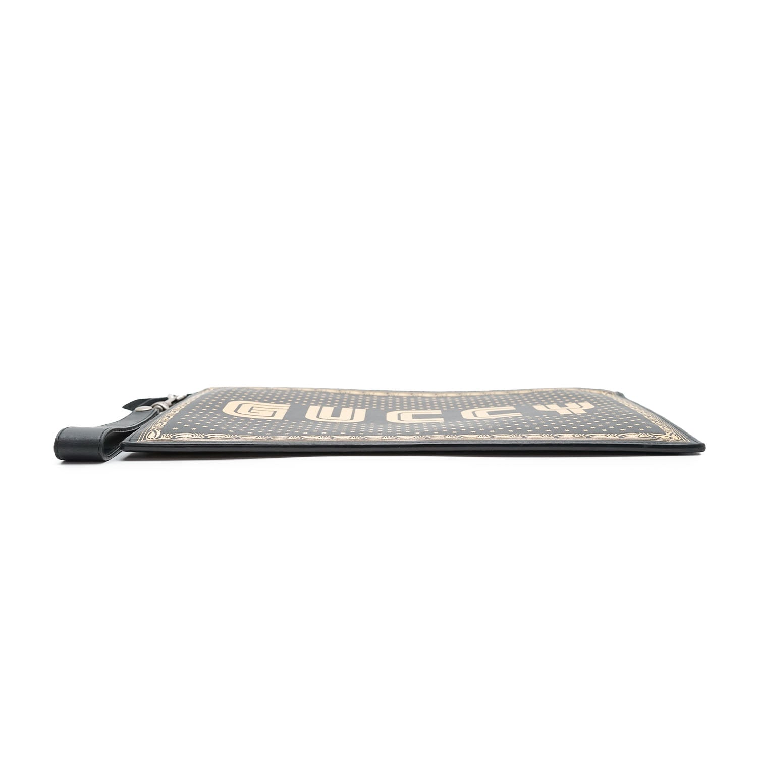 Gucci x SEGA Guccy Magnetismo Clutch Black/Gold LeatherDepth: 0.5cmHeight: 21cmWidth: 30.5cmHand Drop: 15cmBOutside Rank: BInside Rank: ABDiscoloration: Slight hardware tarnishScratch: Slight scratches on the leather parts (inside, zipper pull)Serial code: 510489.0416