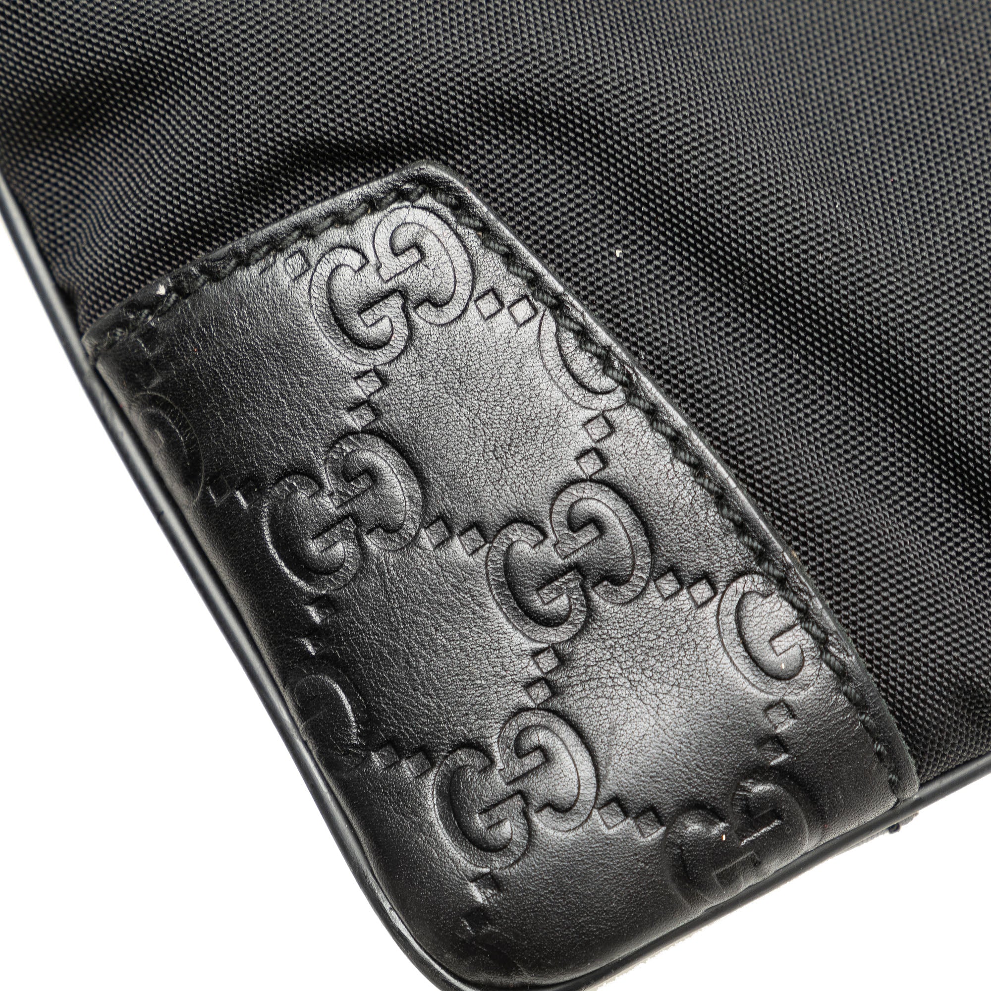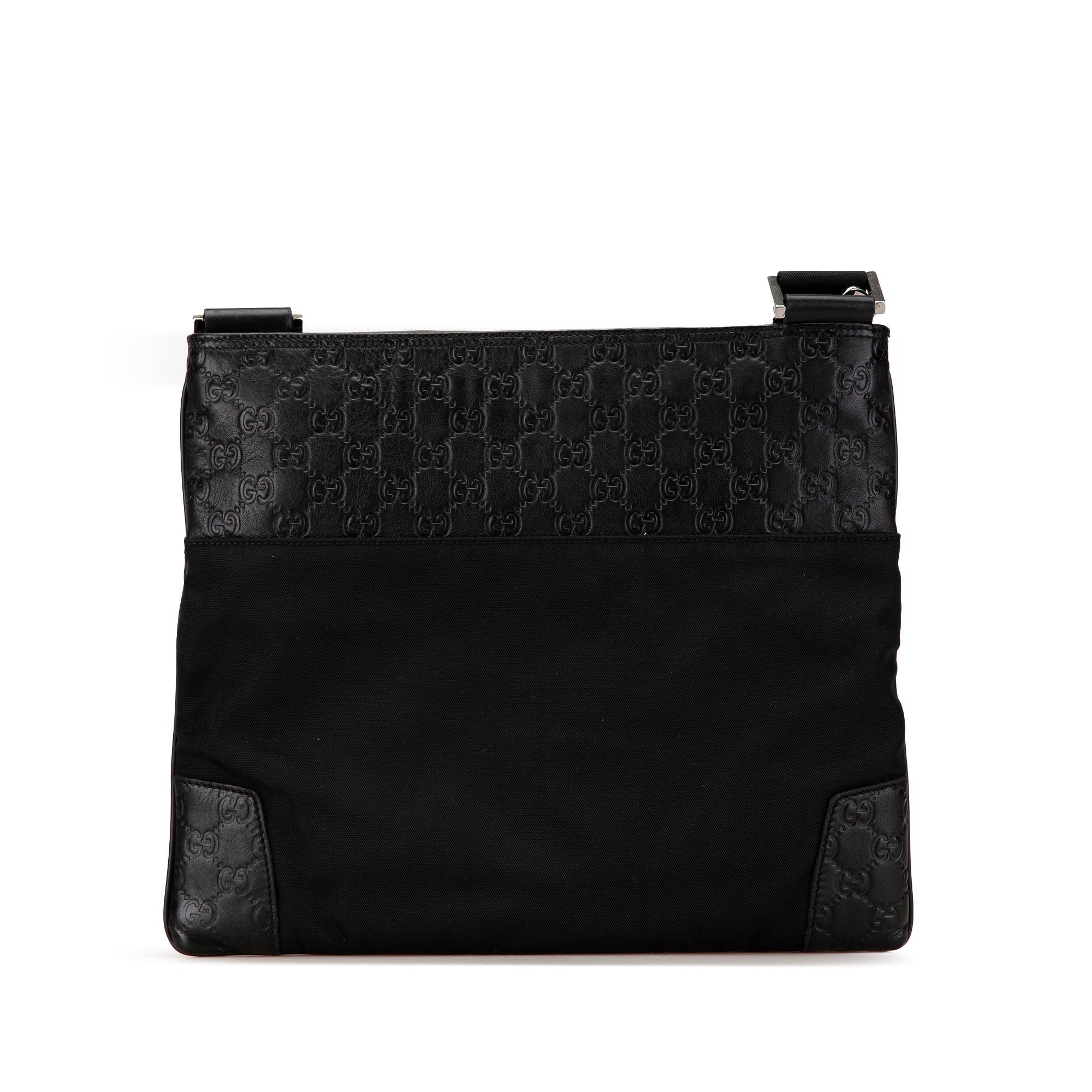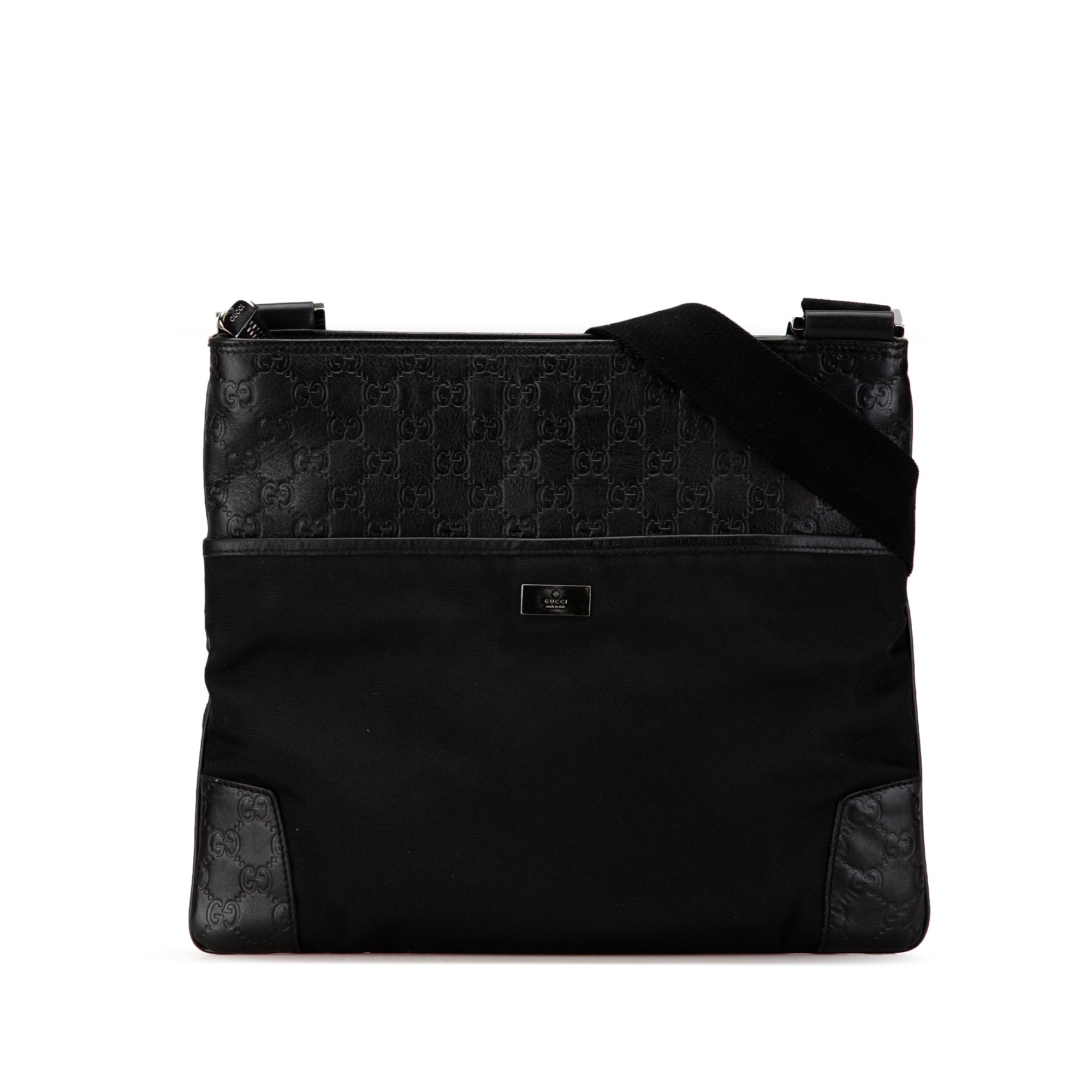 This crossbody bag features a nylon body with guccissima leather trim, an adjustable flat shoulder strap, a top zip closure, an exterior slip pocket, and interior zip and slip pockets. Retail Price: 800.00