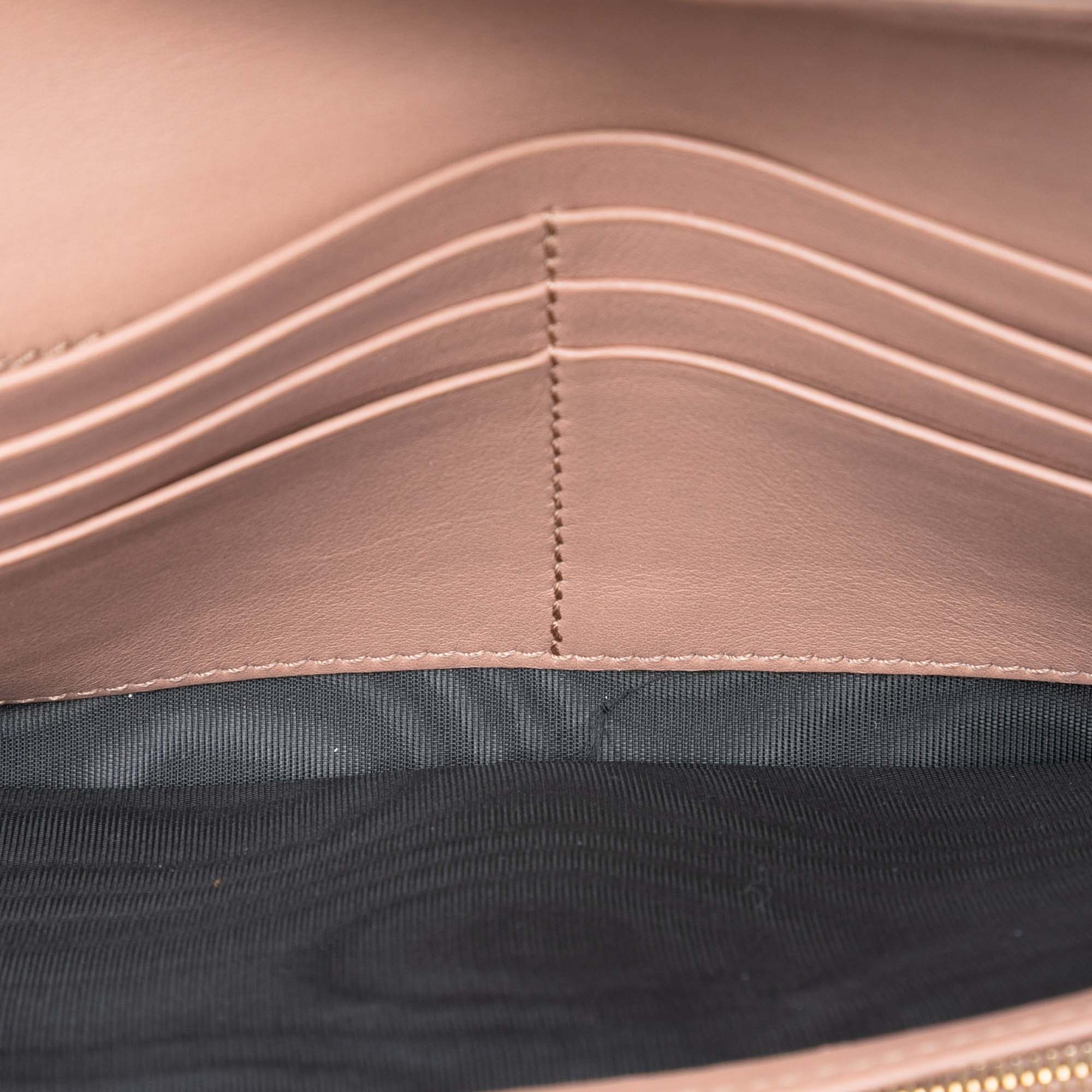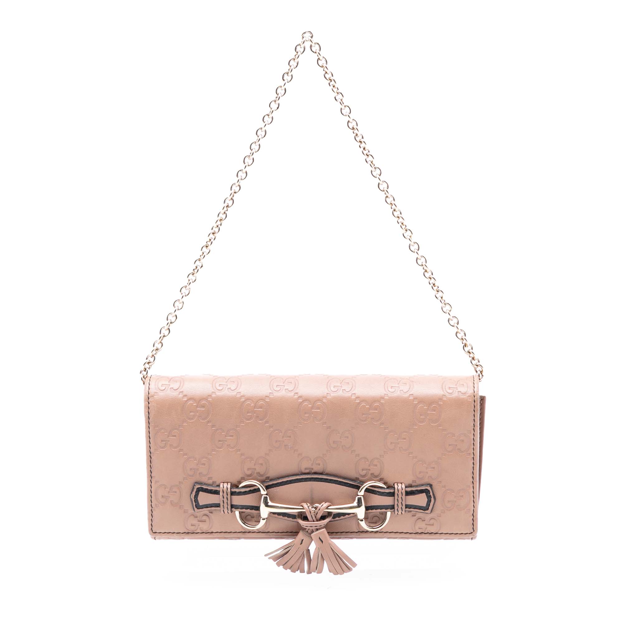 This wallet on chain features an embossed leather body, a chain linkstrap, a front flap with a magnetic snap closure, and interior zip and slip pockets. Retail Price: 733.00