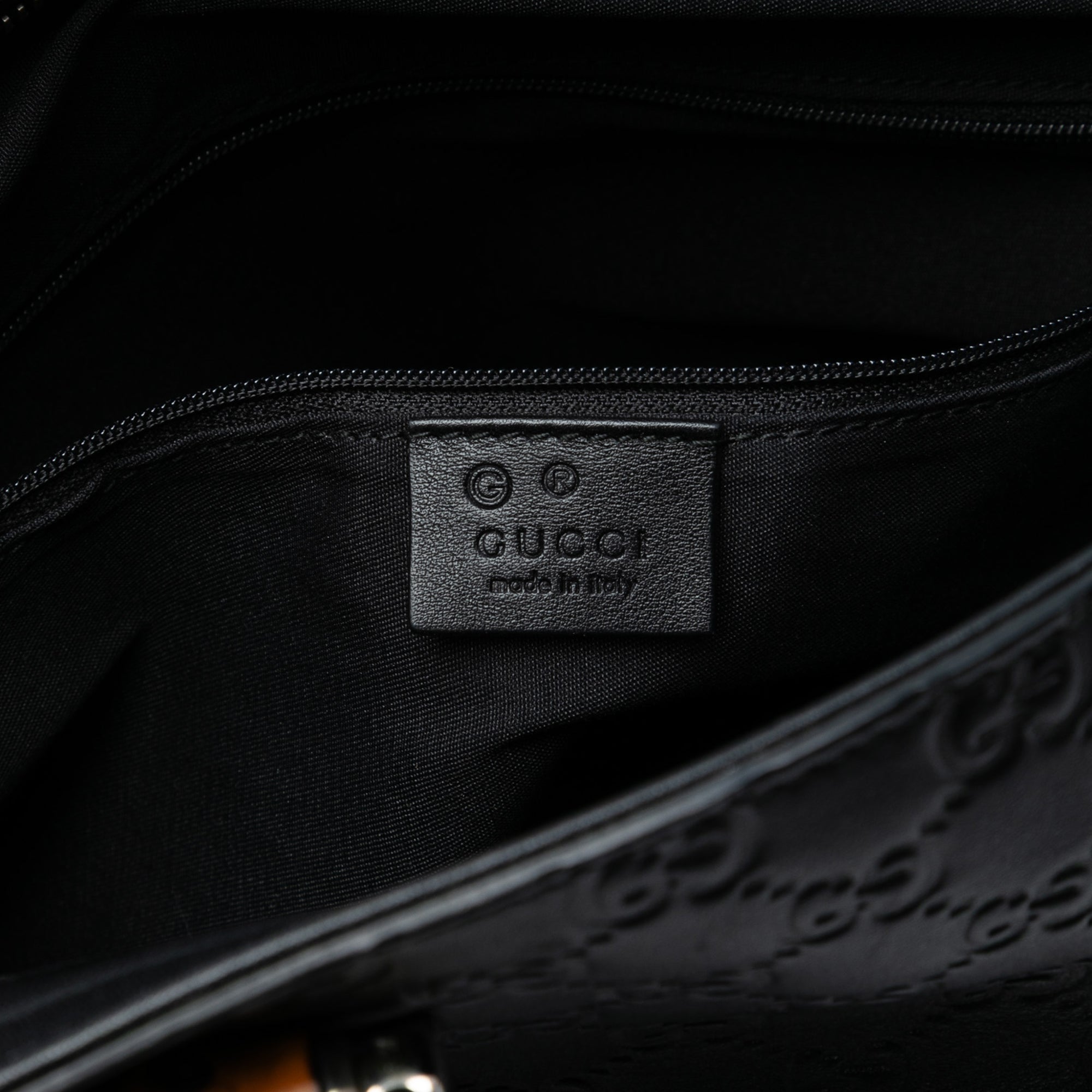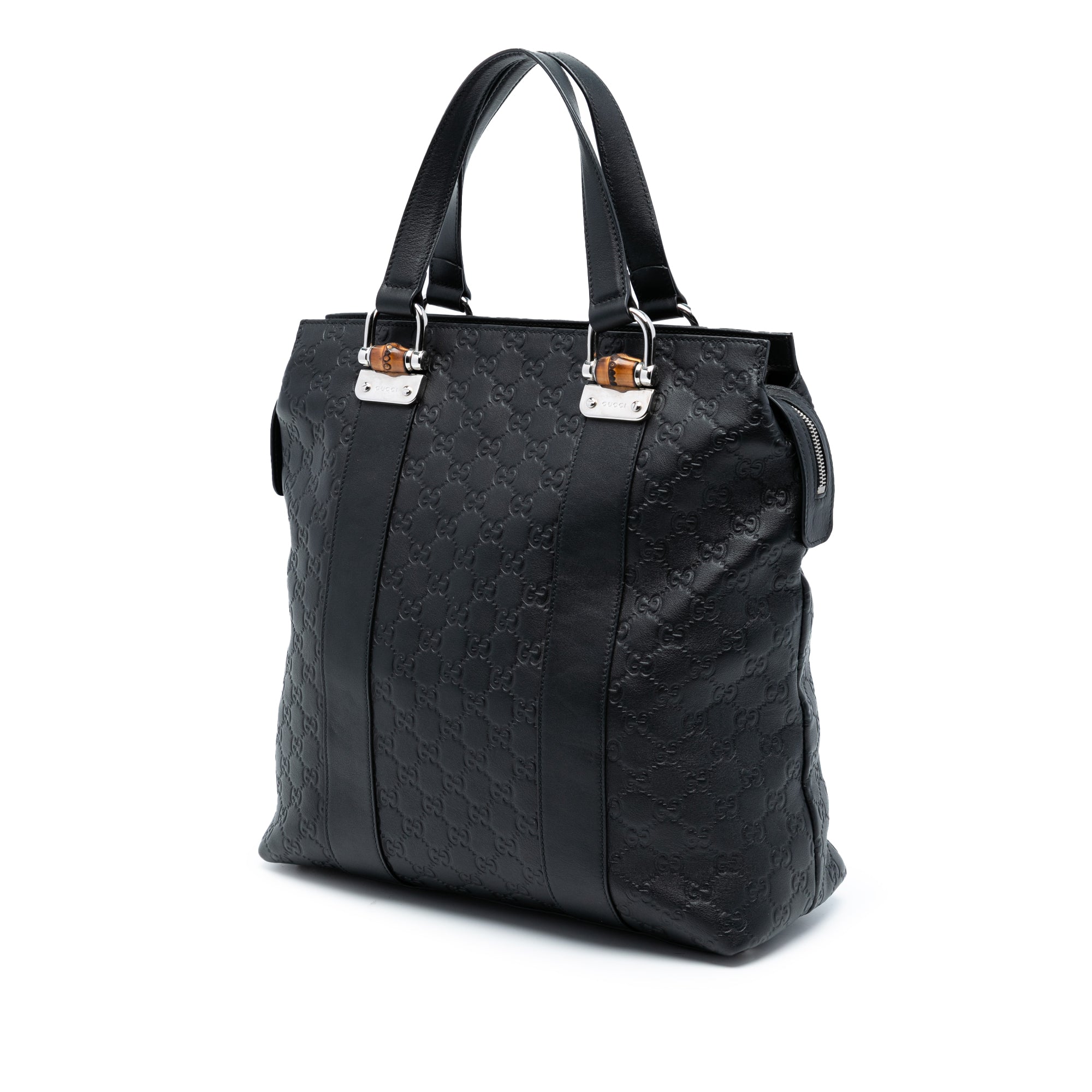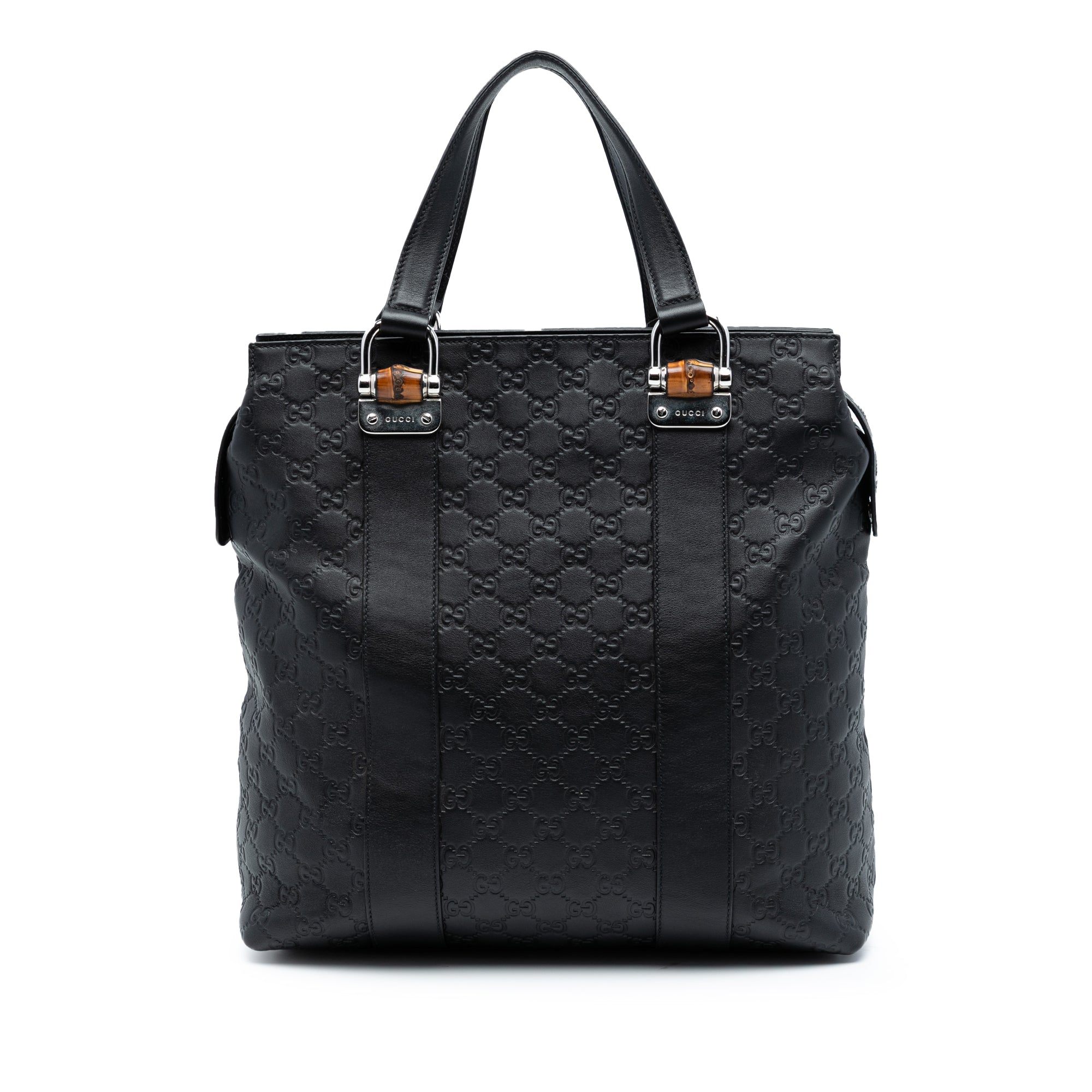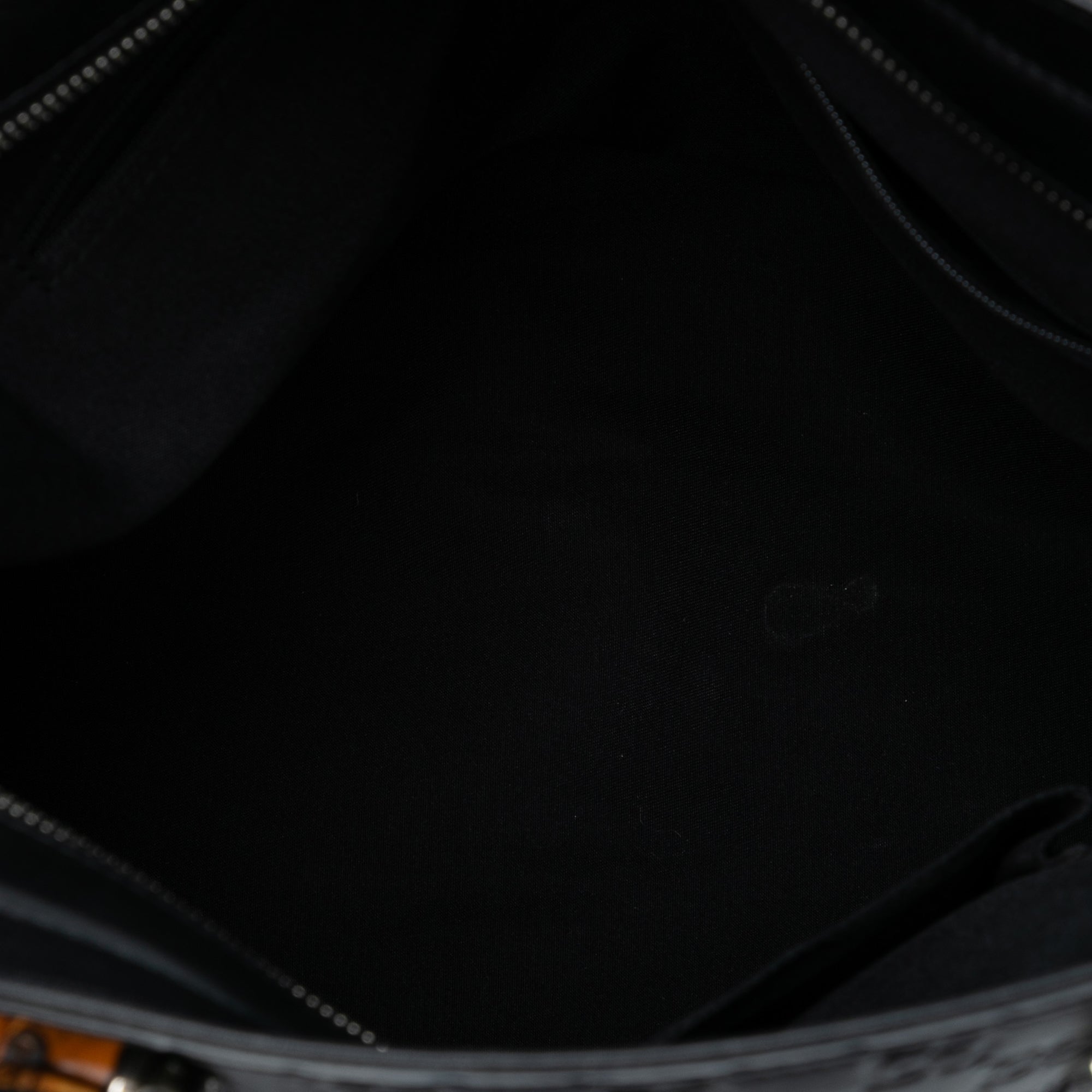 This tote bag features a leather body, flat leather handles with bamboo accents, a top zip closure, and interior zip and open pockets. Retail Price: 1950.00