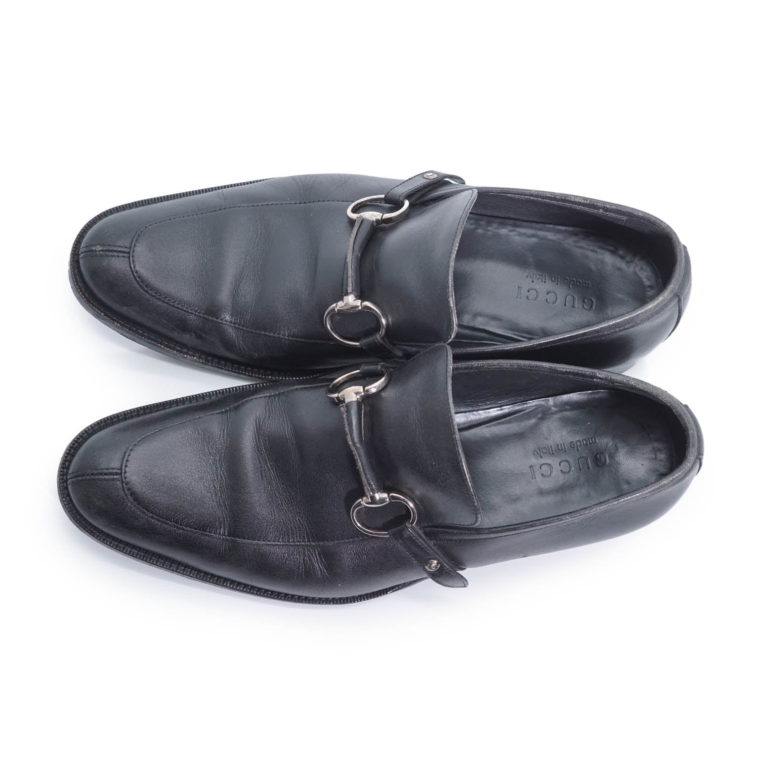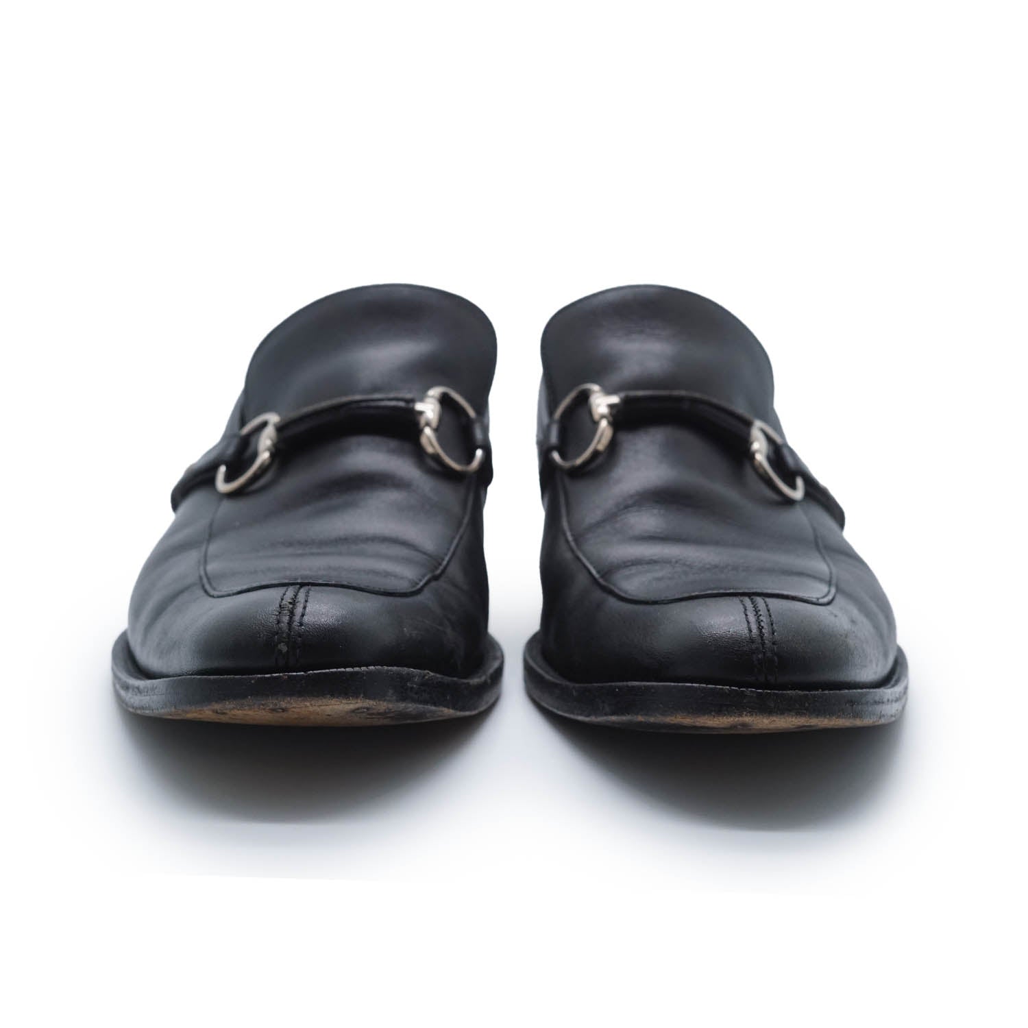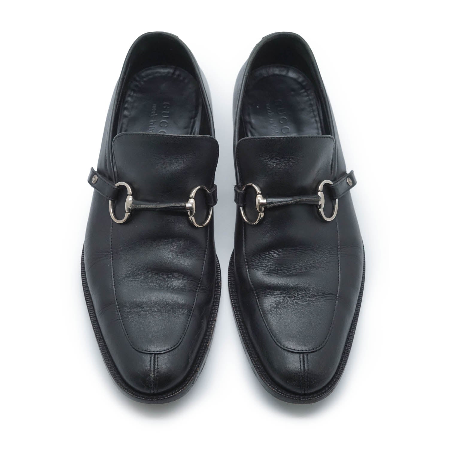 Horsebit Leather Shoes 8 1/2 E (42.5 IT/EU) Black LeatherHeight: 31cmWidth: 11.5cmScratch: Noticeable wear on the outsole with scratches, some scuffs on the side areasMissing: The logo plate on the bottom of one shoe is missingComments: The remaining metal logo plate on the bottom of one shoe is partially coming offSerial code: 114418