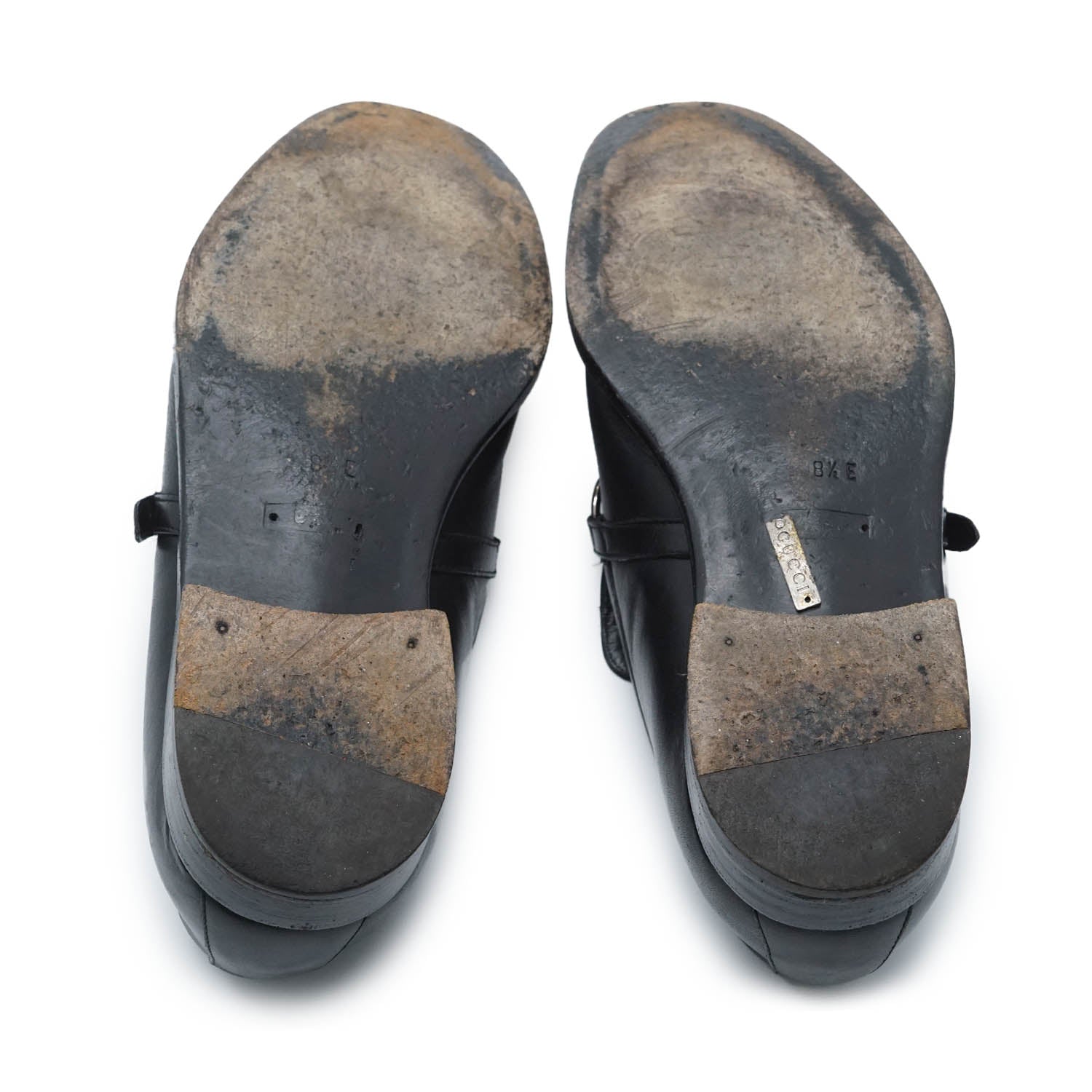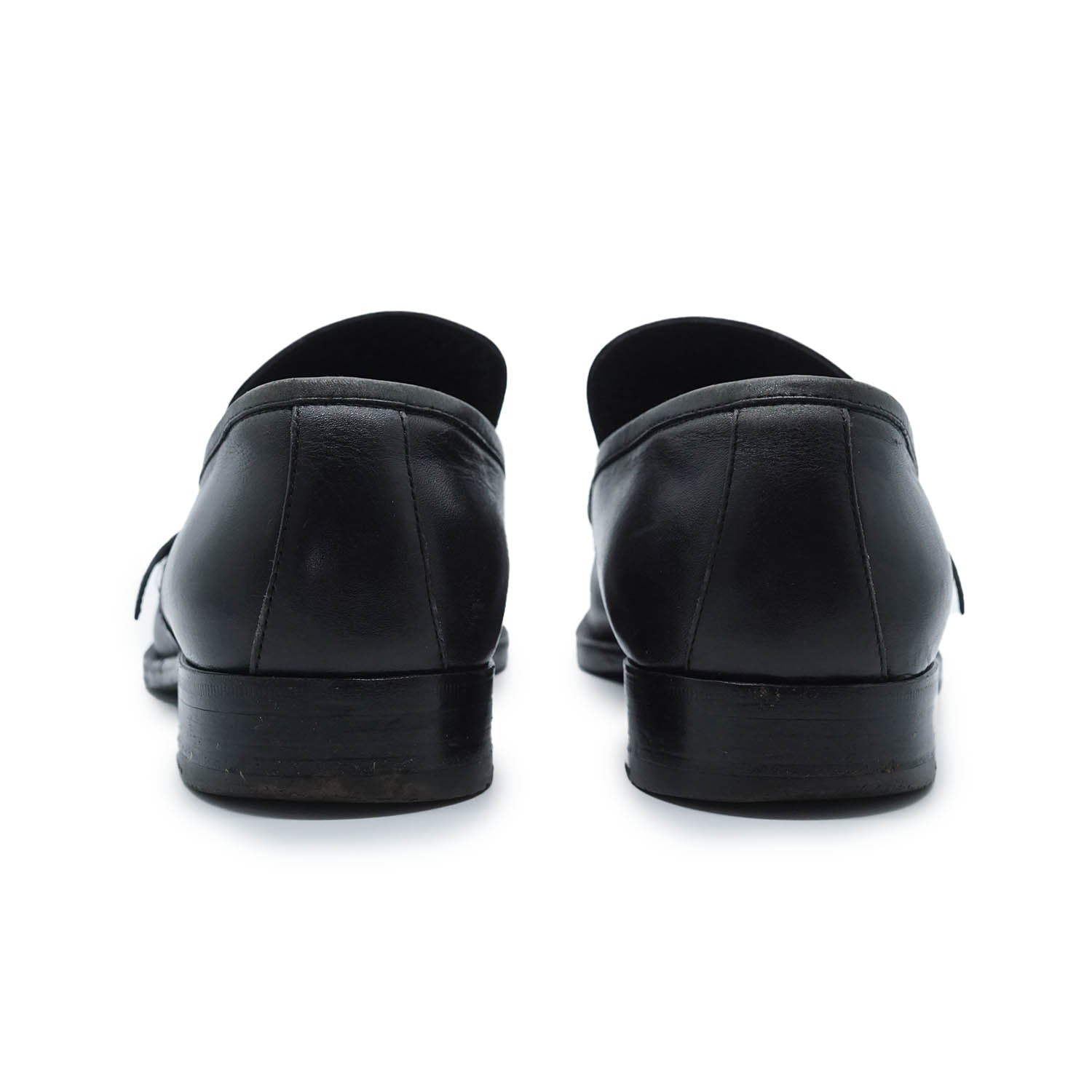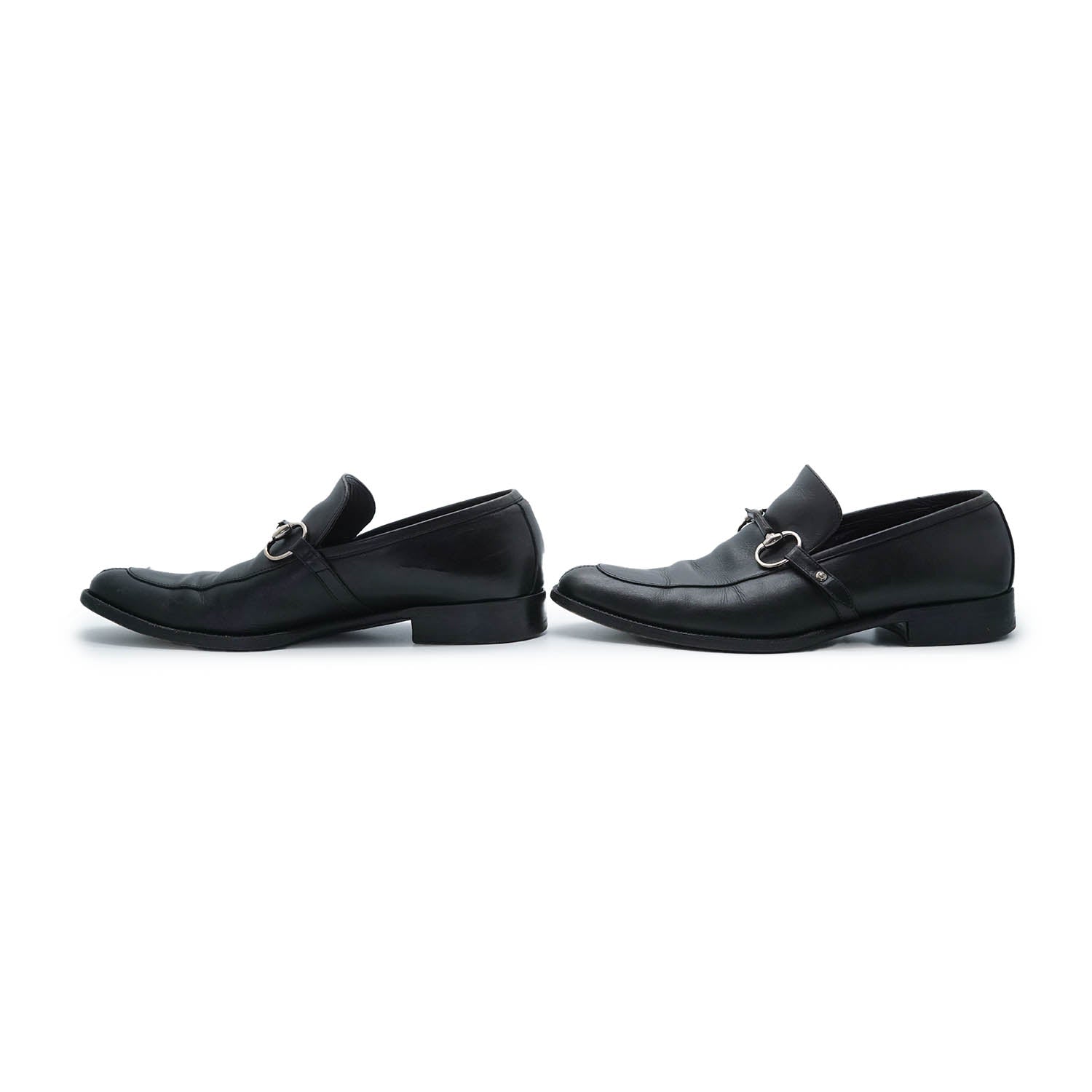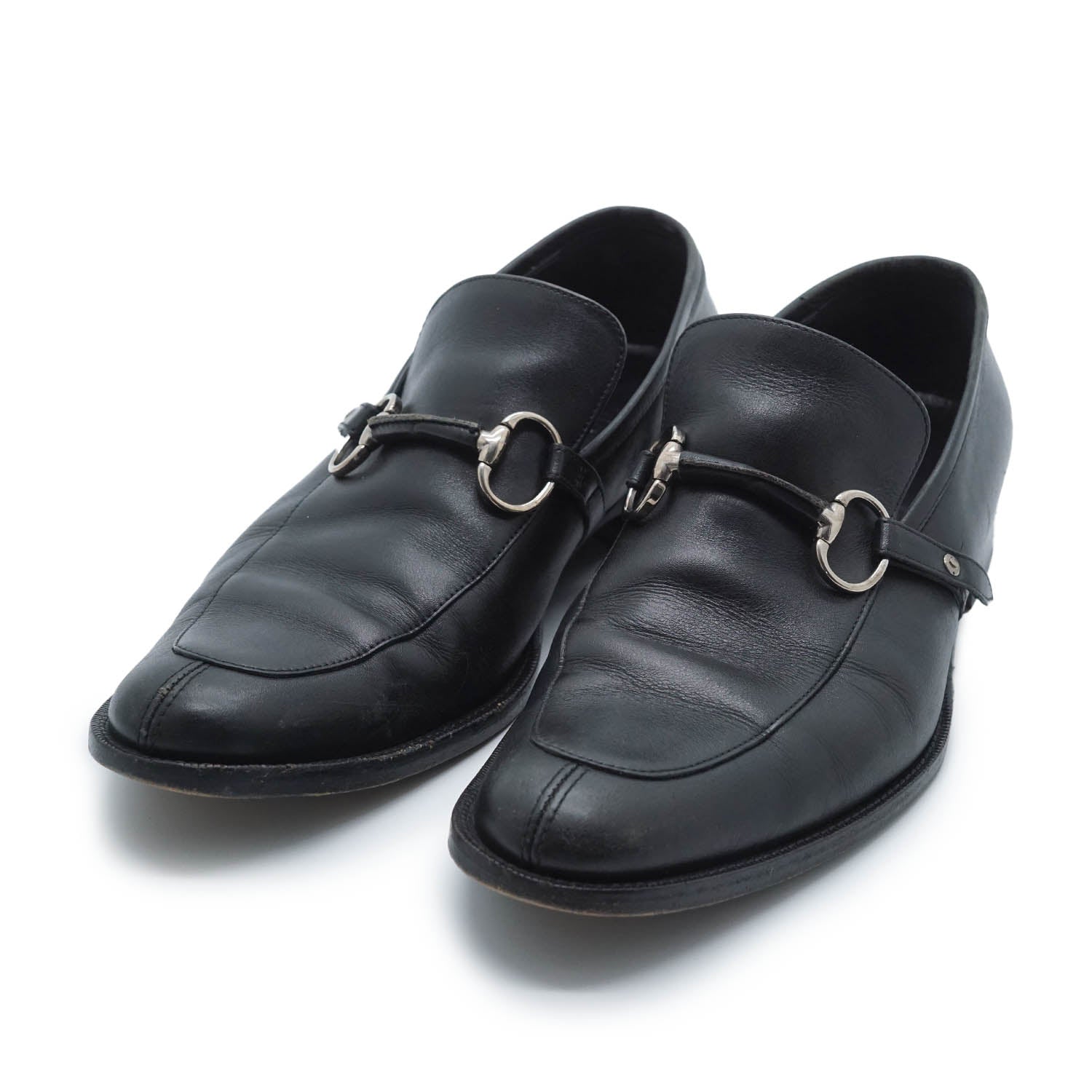 Horsebit Leather Shoes 8 1/2 E (42.5 IT/EU) Black LeatherHeight: 31cmWidth: 11.5cmScratch: Noticeable wear on the outsole with scratches, some scuffs on the side areasMissing: The logo plate on the bottom of one shoe is missingComments: The remaining metal logo plate on the bottom of one shoe is partially coming offSerial code: 114418