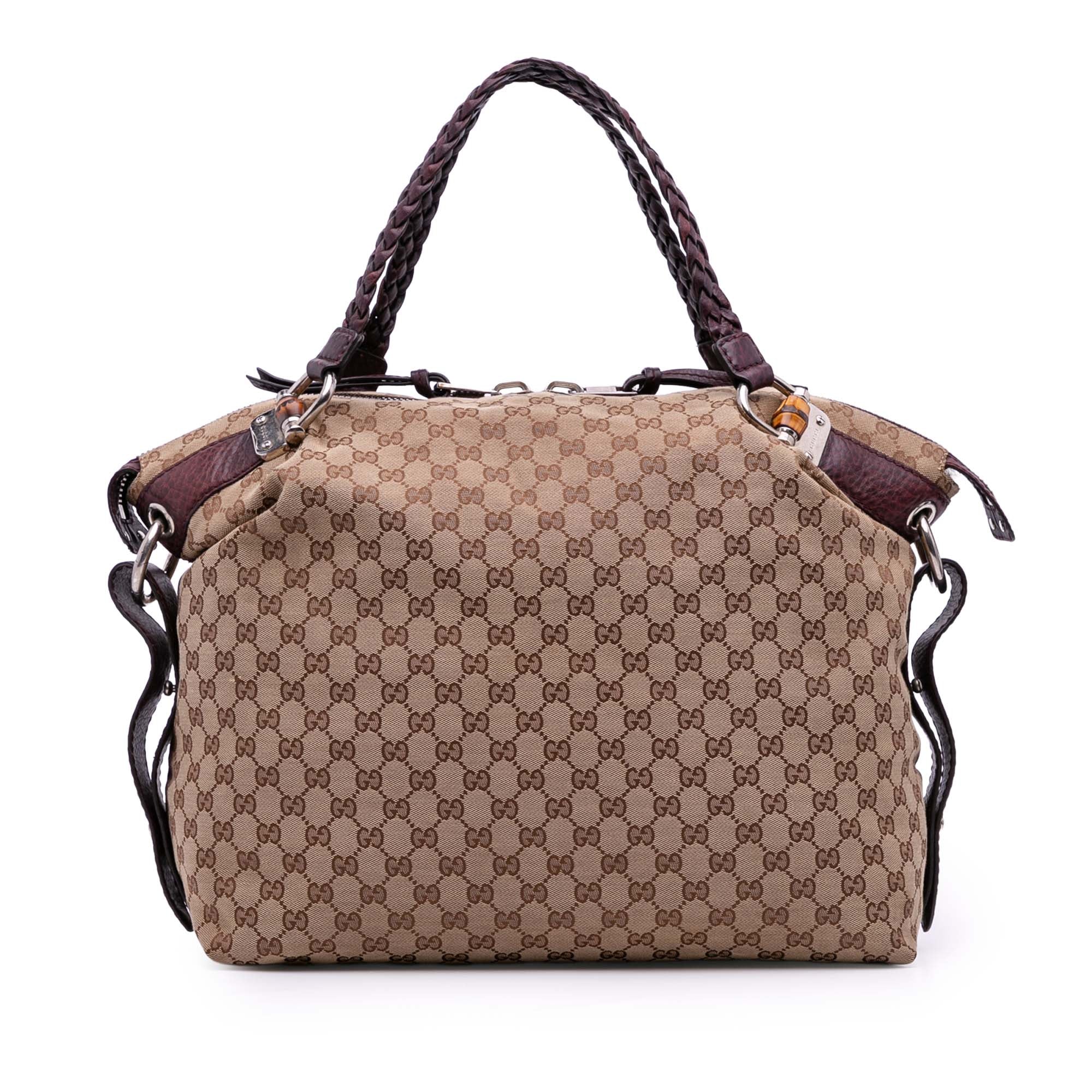 This tote bag features a canvas body with leather trim, braided leather shoulder straps, a top zip closure, and interior zip and slip pockets. Retail Price: 1680.00