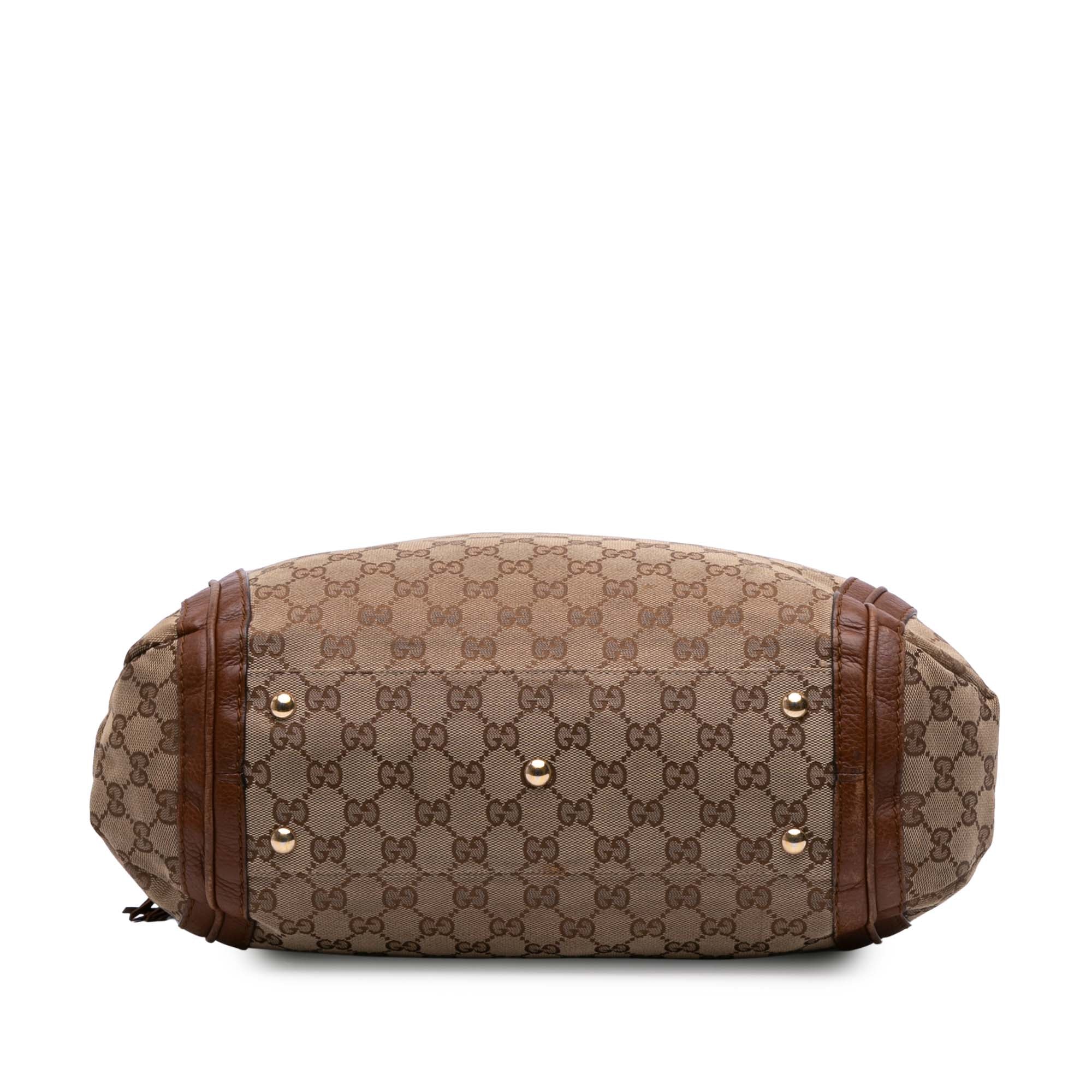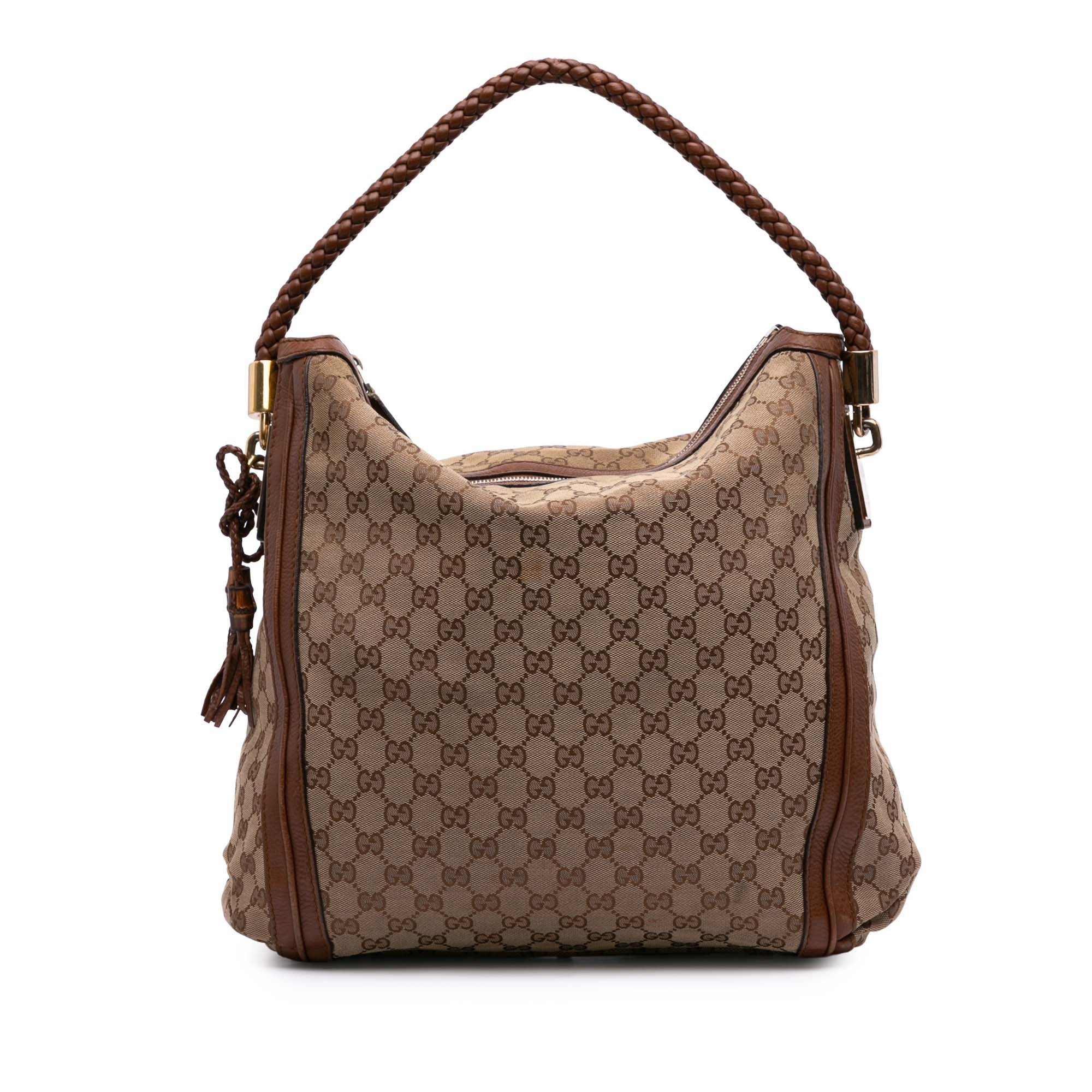 The Bella features a canvas body with leather trim, a braided leather strap, a top zip closure, and interior zip and slip pockets. Retail Price: 1290.00
