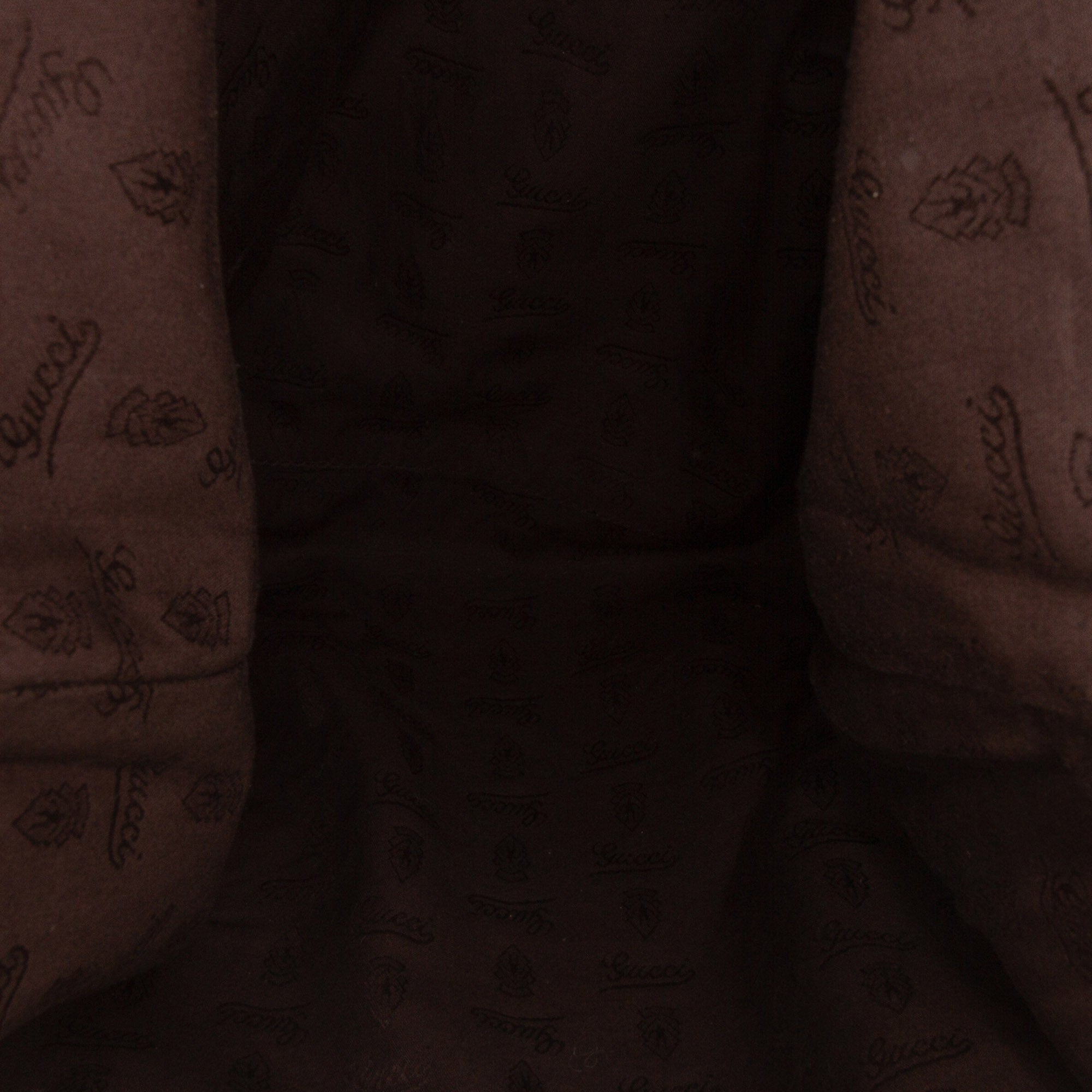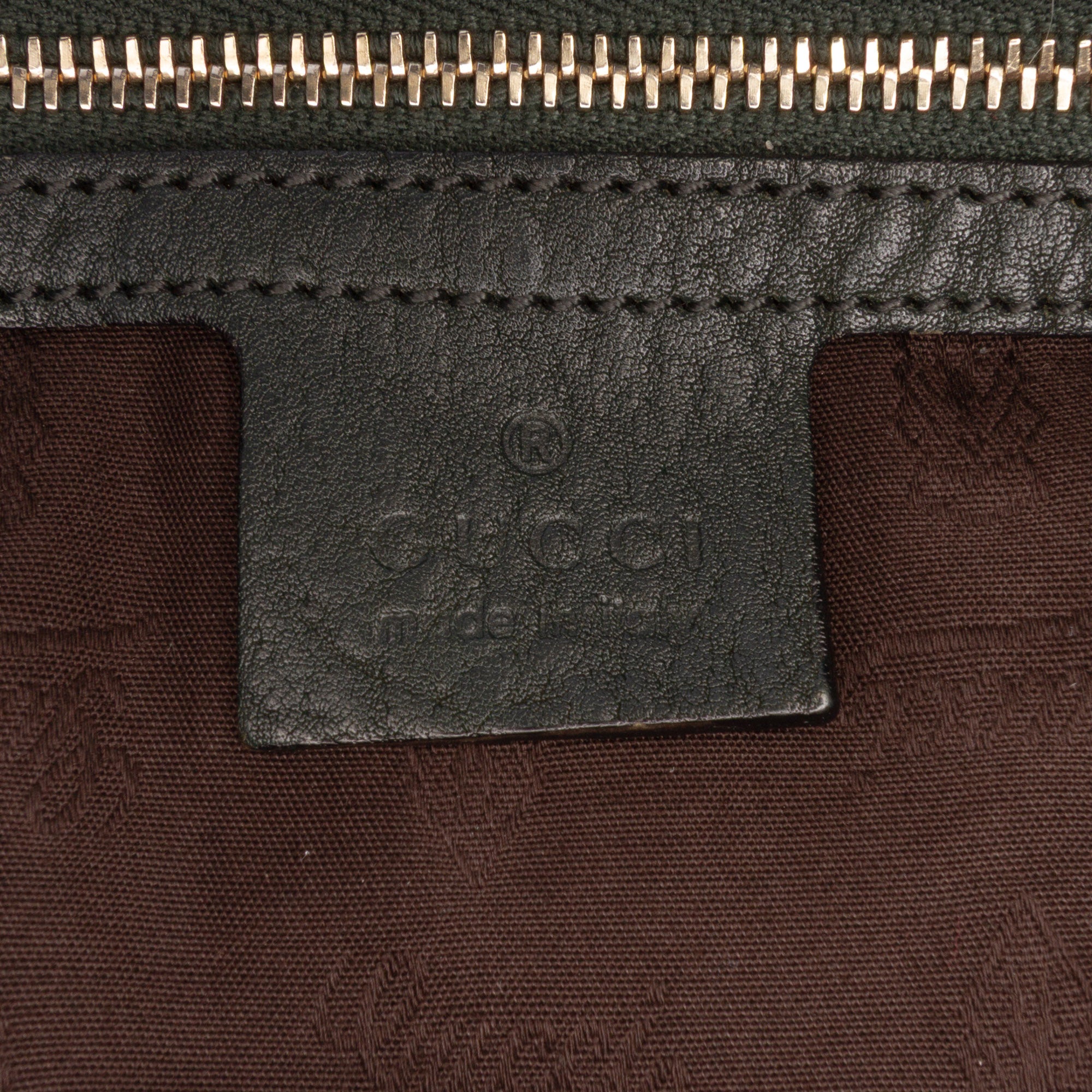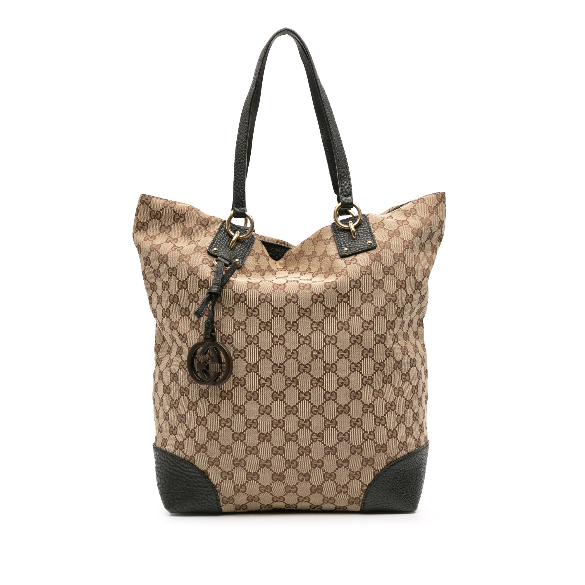 This tote bag features a canvas body with leather trim and a GG charm, flat leather handles, an open top with a magnetic snap closure, and interior zip and slip pockets. Retail Price: 895.00