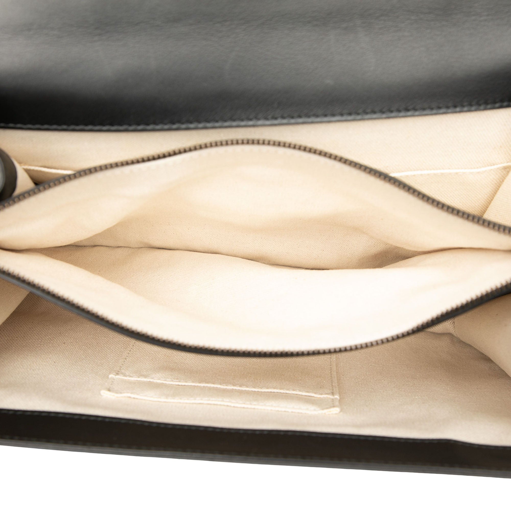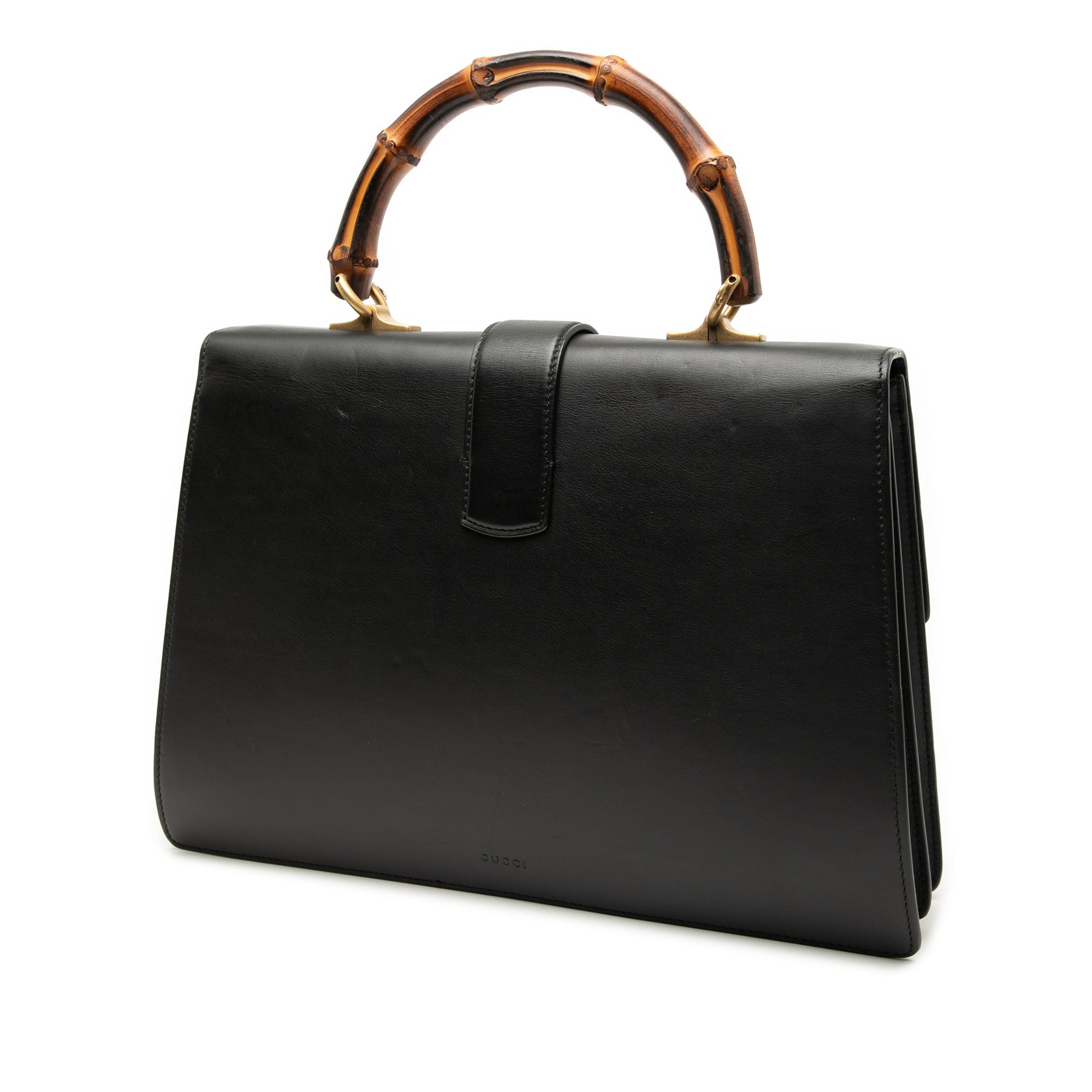 The Dionysus satchel features a leather body, a bamboo top handle, a detachable flat strap, a front flap with a magnetic snap button closure, and interior zip and slip pockets. Retail Price: 3700.00