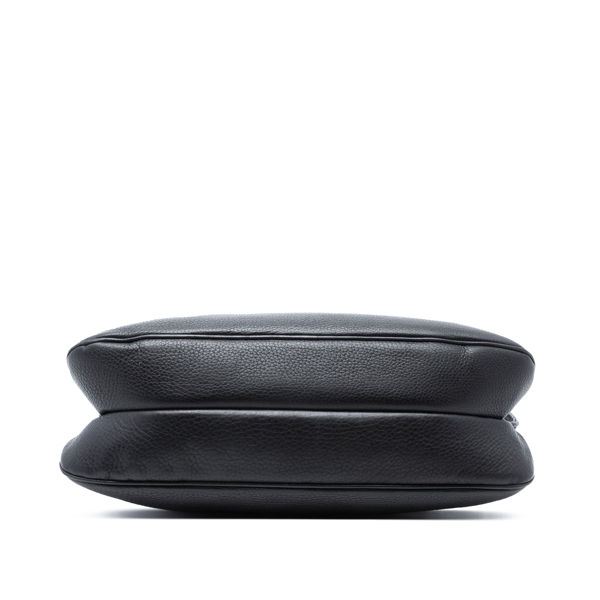 The 1973 shoulder bag features a leather body, a flat leather strap, a front flap with a magnetic closure, and interior zip and slip pockets. Retail Price: 1345.00