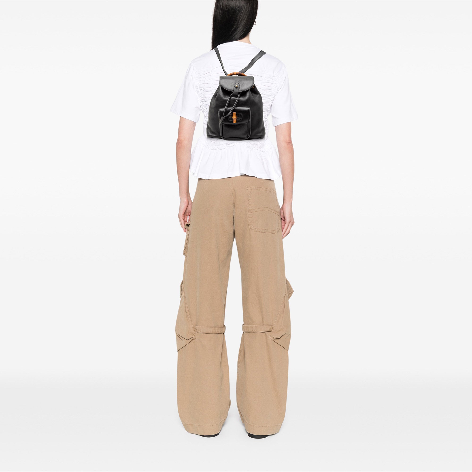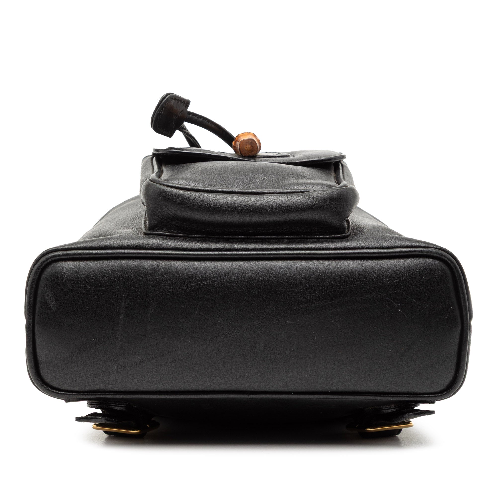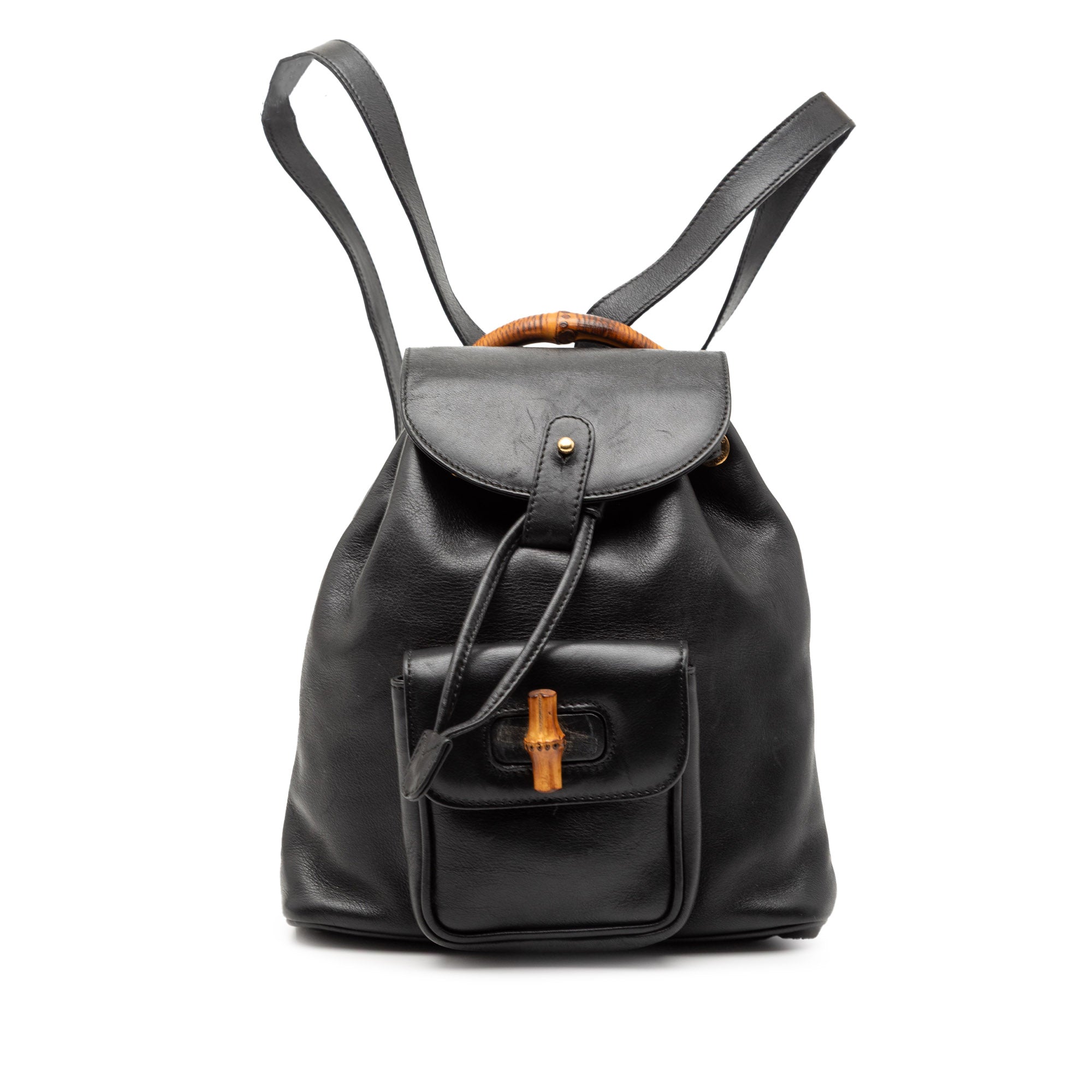 This backpack features a leather body, flat leather back straps, a bamboo top handle, a top flap with buckle closure, a drawstring closure, an exterior front flap pocket with bamboo twist lock closure, and an interior zip pocket. Retail Price: 650.00
