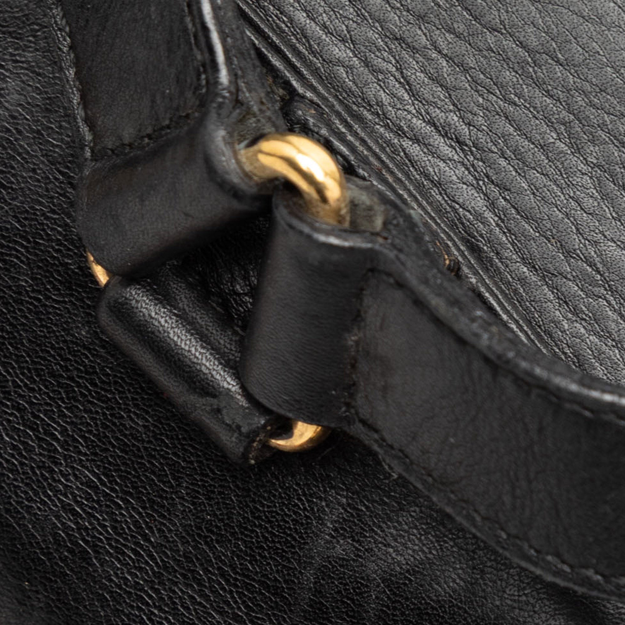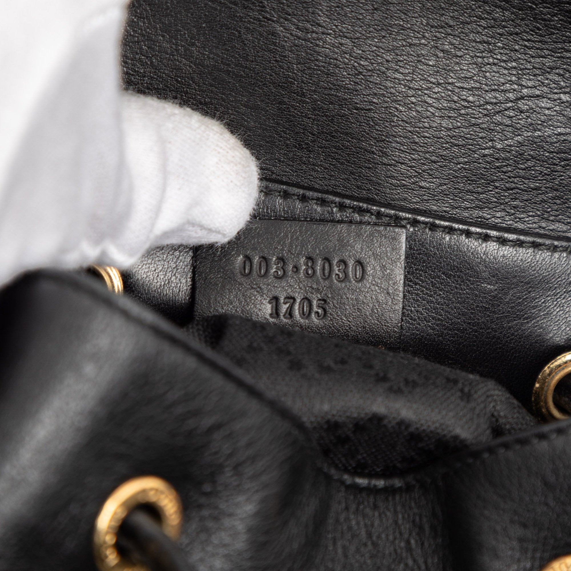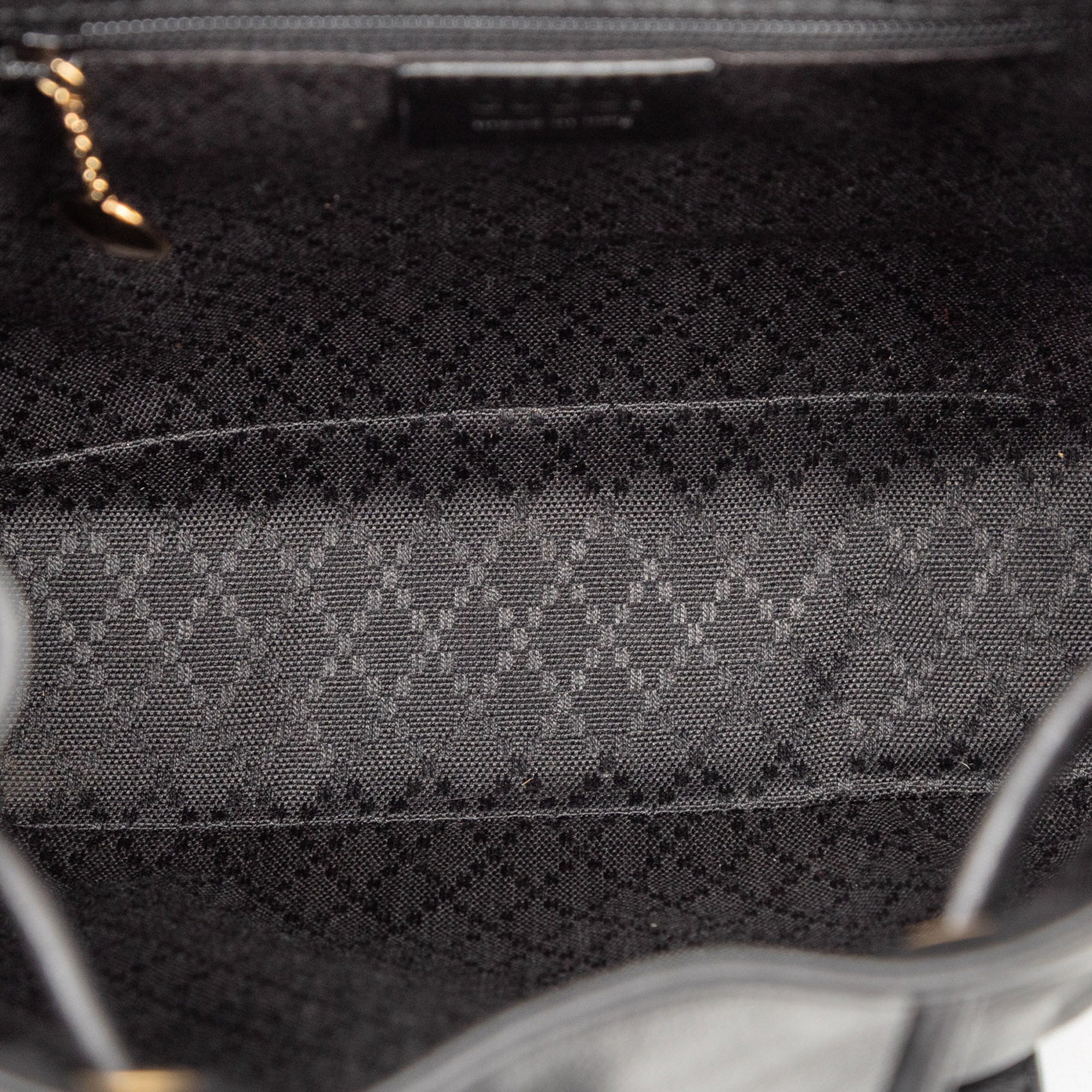 This backpack features a leather body, flat leather back straps, a bamboo top handle, a top flap with buckle closure, a drawstring closure, an exterior front flap pocket with bamboo twist lock closure, and an interior zip pocket. Retail Price: 650.00
