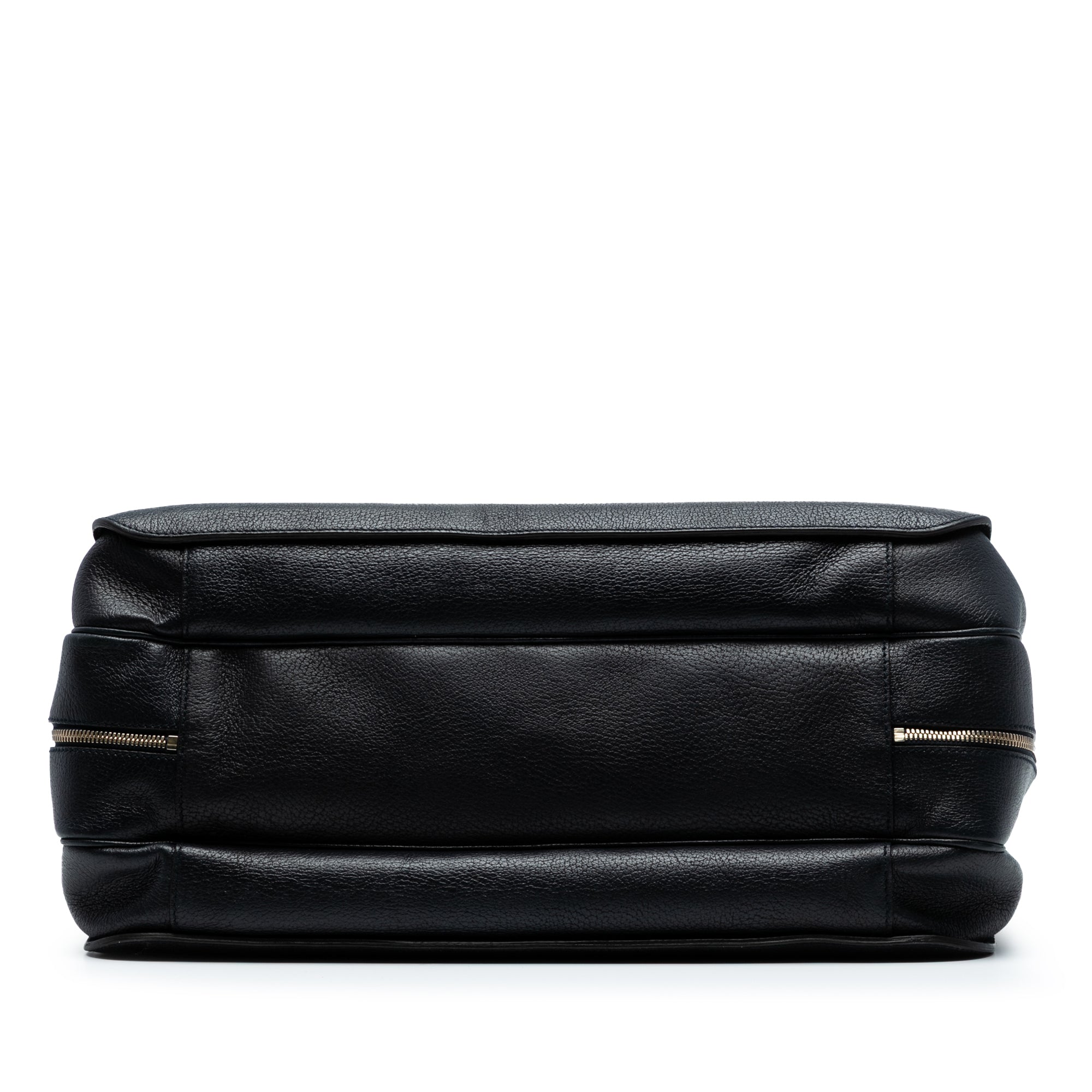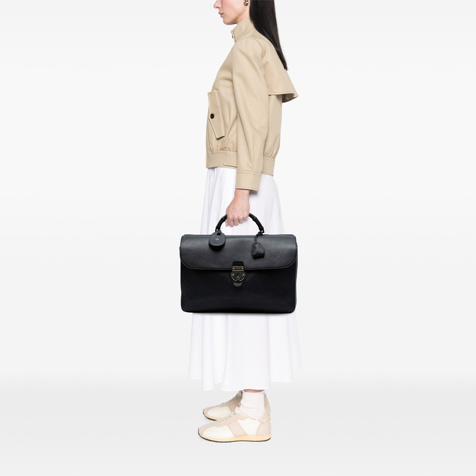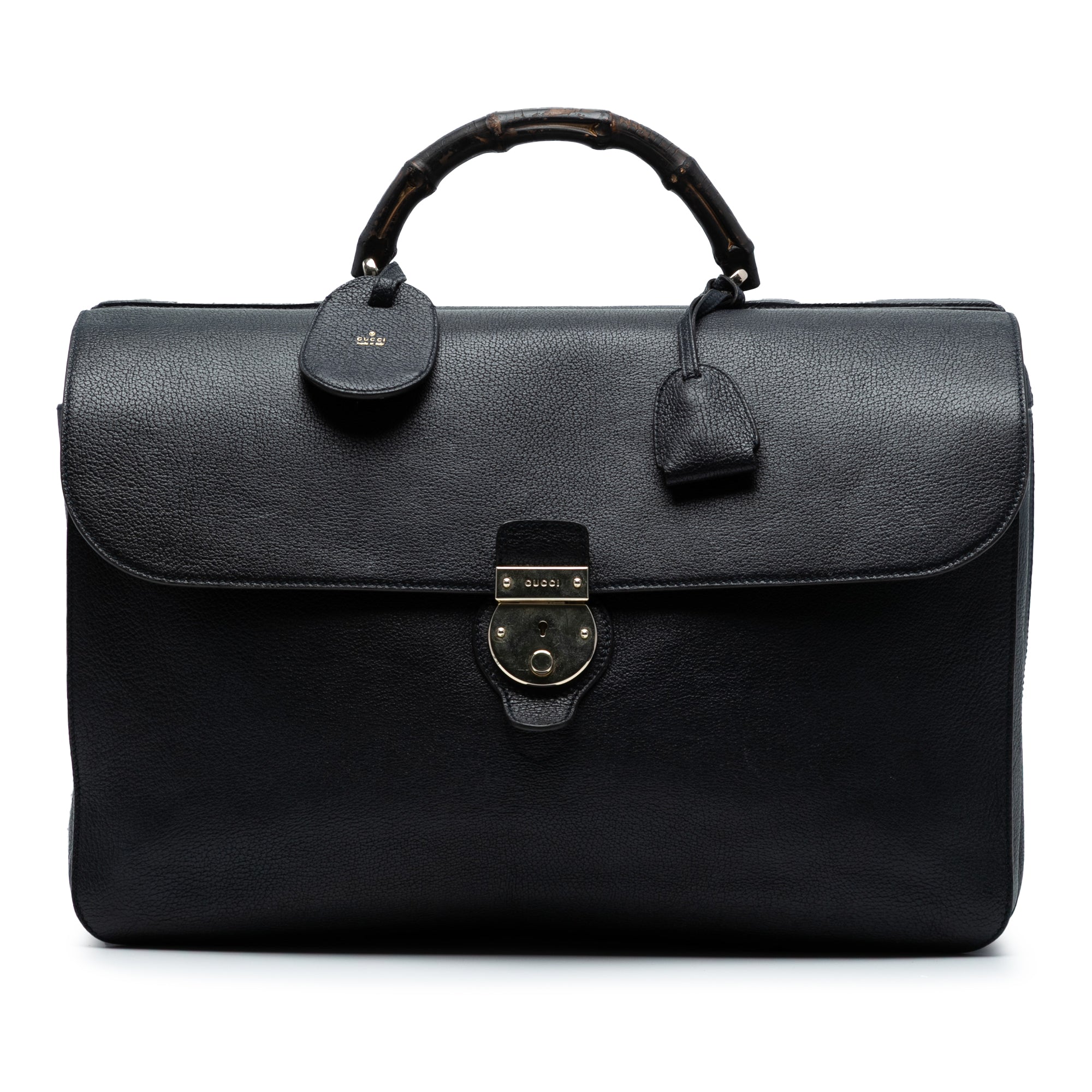 This briefcase features a leather body, a bamboo top handle, a detachable and adjustable flat leather strap, a top zip around with front flap and a push lock closure, and an interior zip and slip pockets. Retail Price: 3280.00