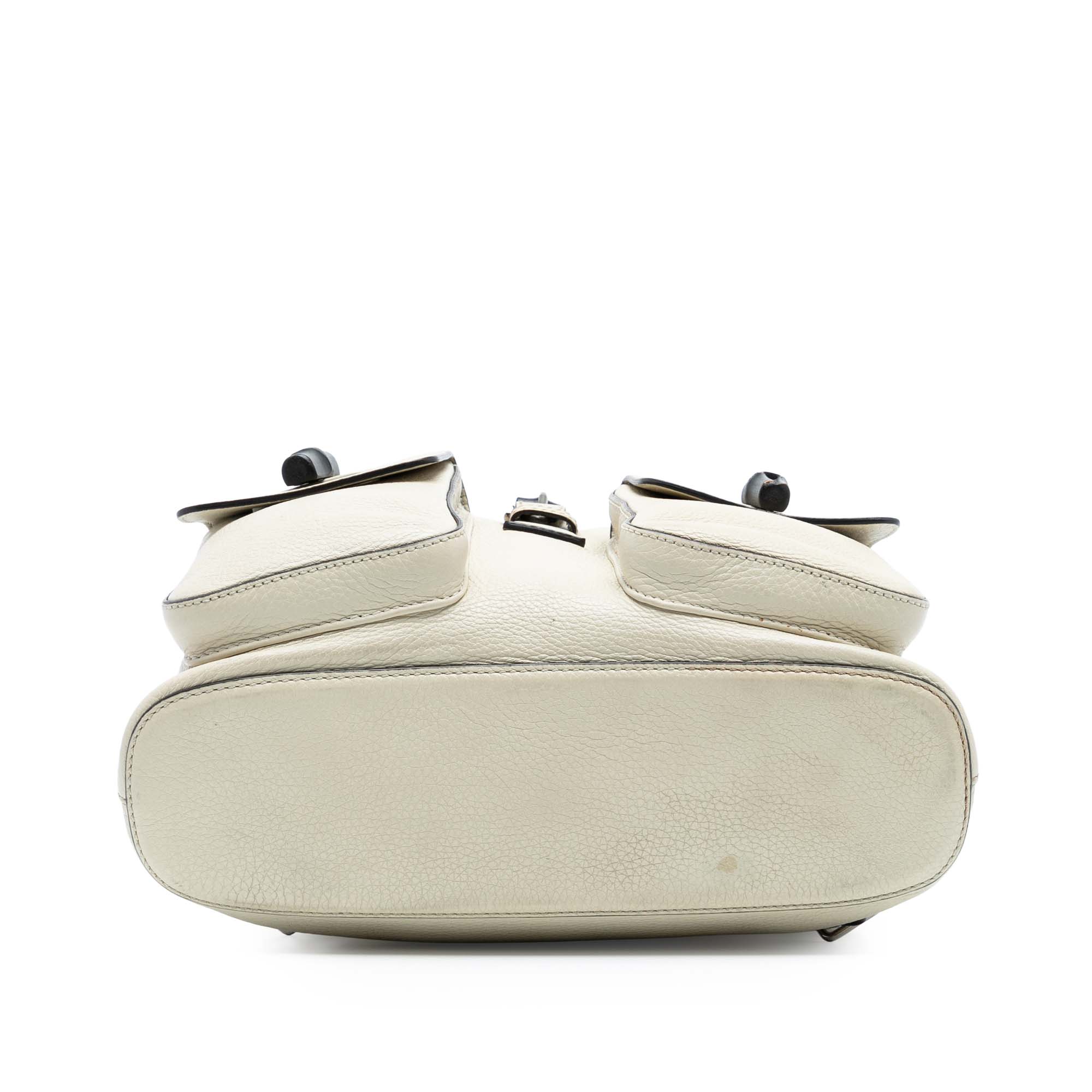 This backpack features a leather body, a bamboo top handle, adjustable flat leather back straps, a top drawstring closure with tassel pulls,, a front flap with buckle closure, exterior flap pockets with bamboo turn-lock closures, and interior slip pockets. Retail Price: 2950.00