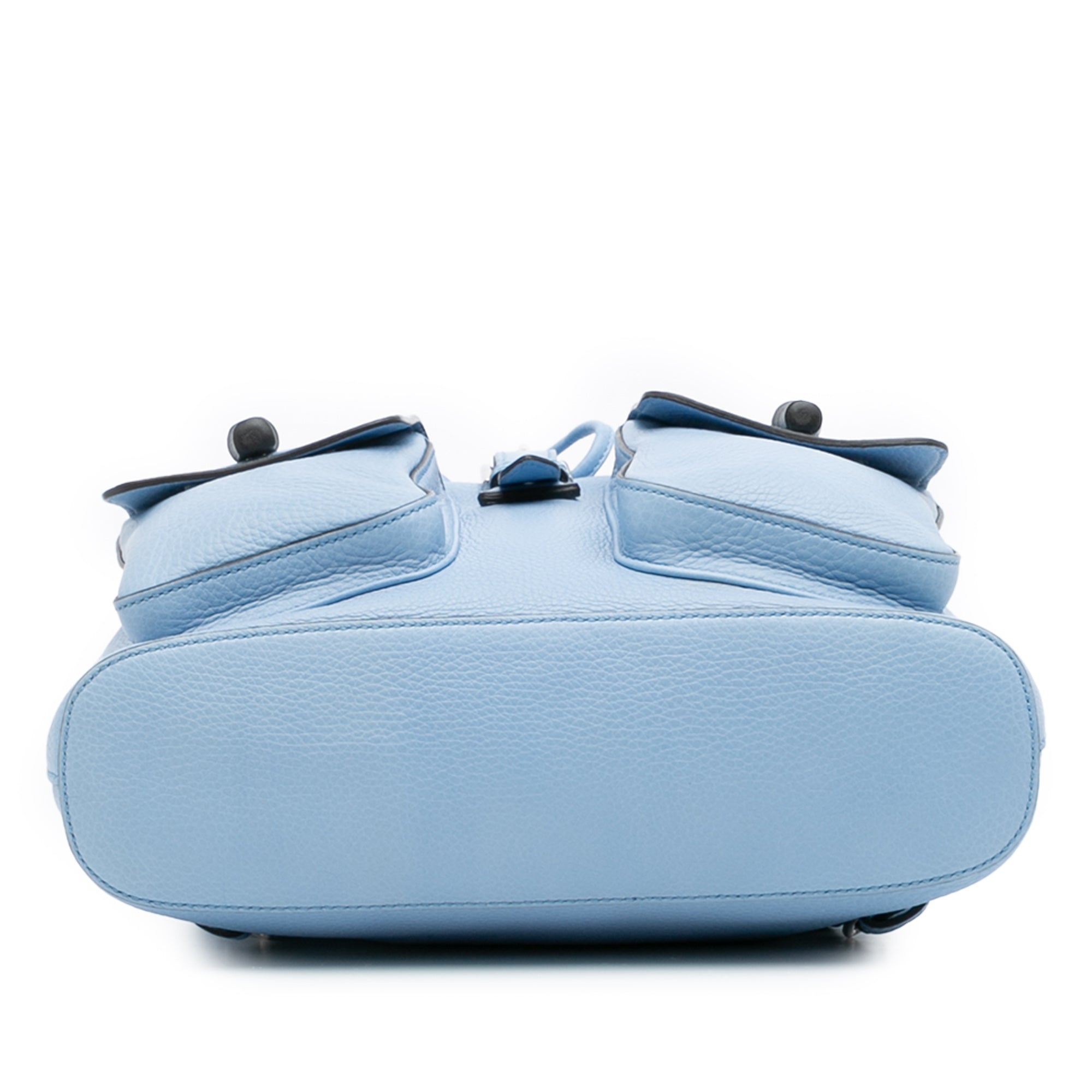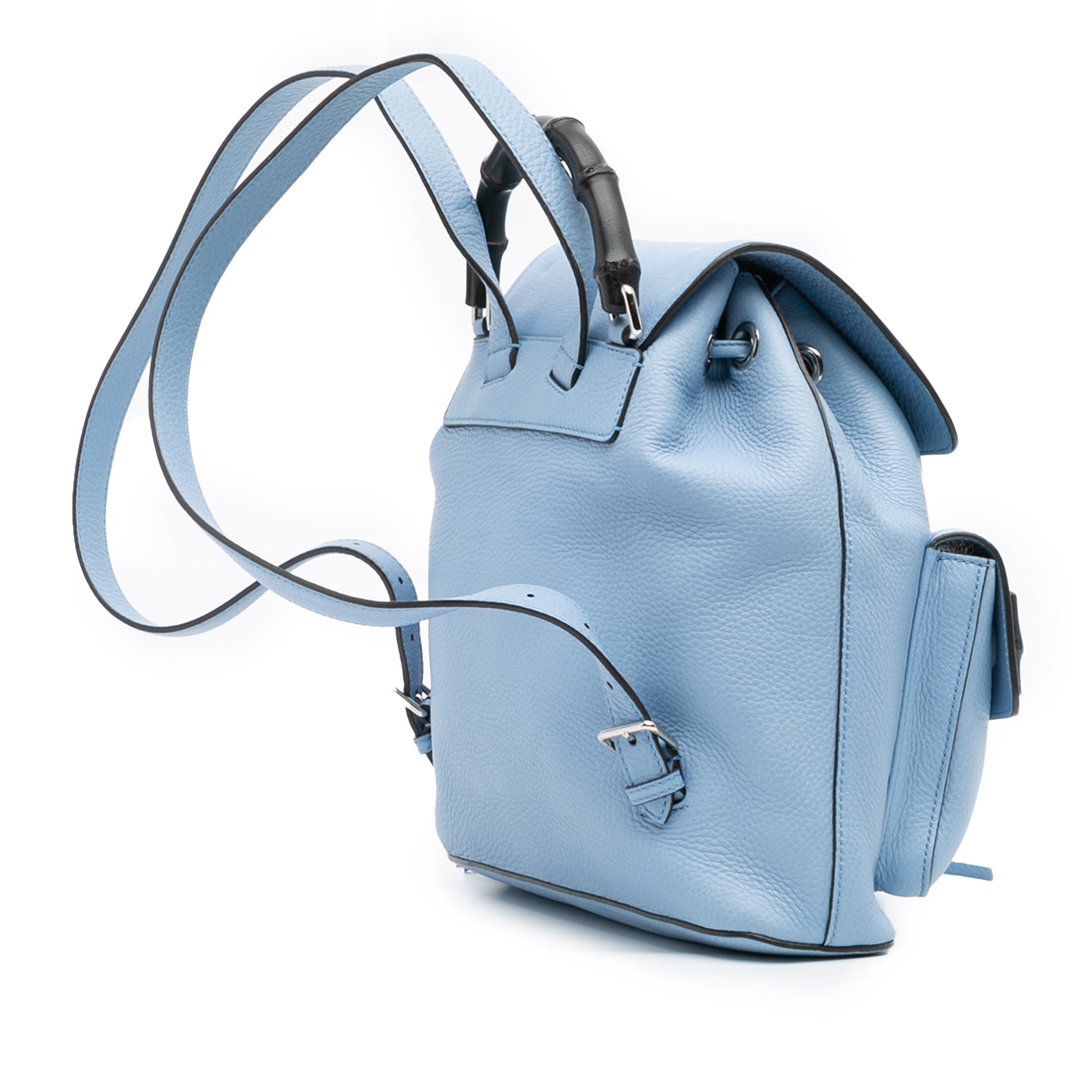 This backpack features a leather body, a bamboo top handle, adjustable flat leather back straps, a front flap with buckle closure, a top drawstring closure with tassel pulls, exterior flap pockets with bamboo turn-lock closures, and interior slip pockets. Retail Price: 2590.00