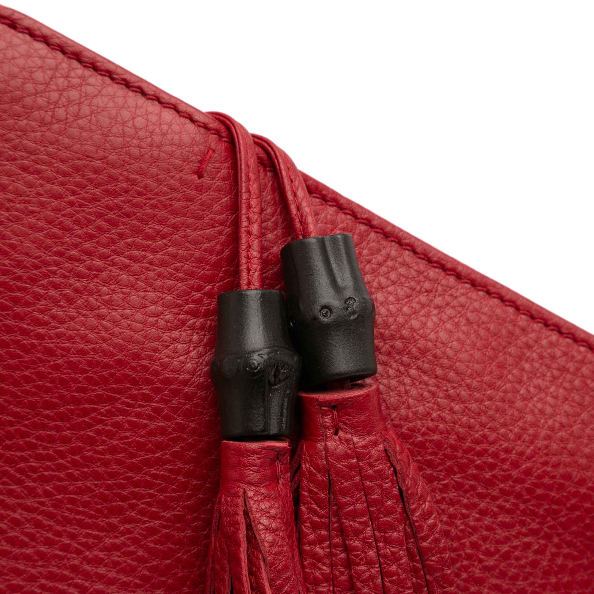 This clutch bag features a leather body with bamboo tassel detail, an open top with magnetic snap closure, and interior zip pockets. Retail Price: 500.00