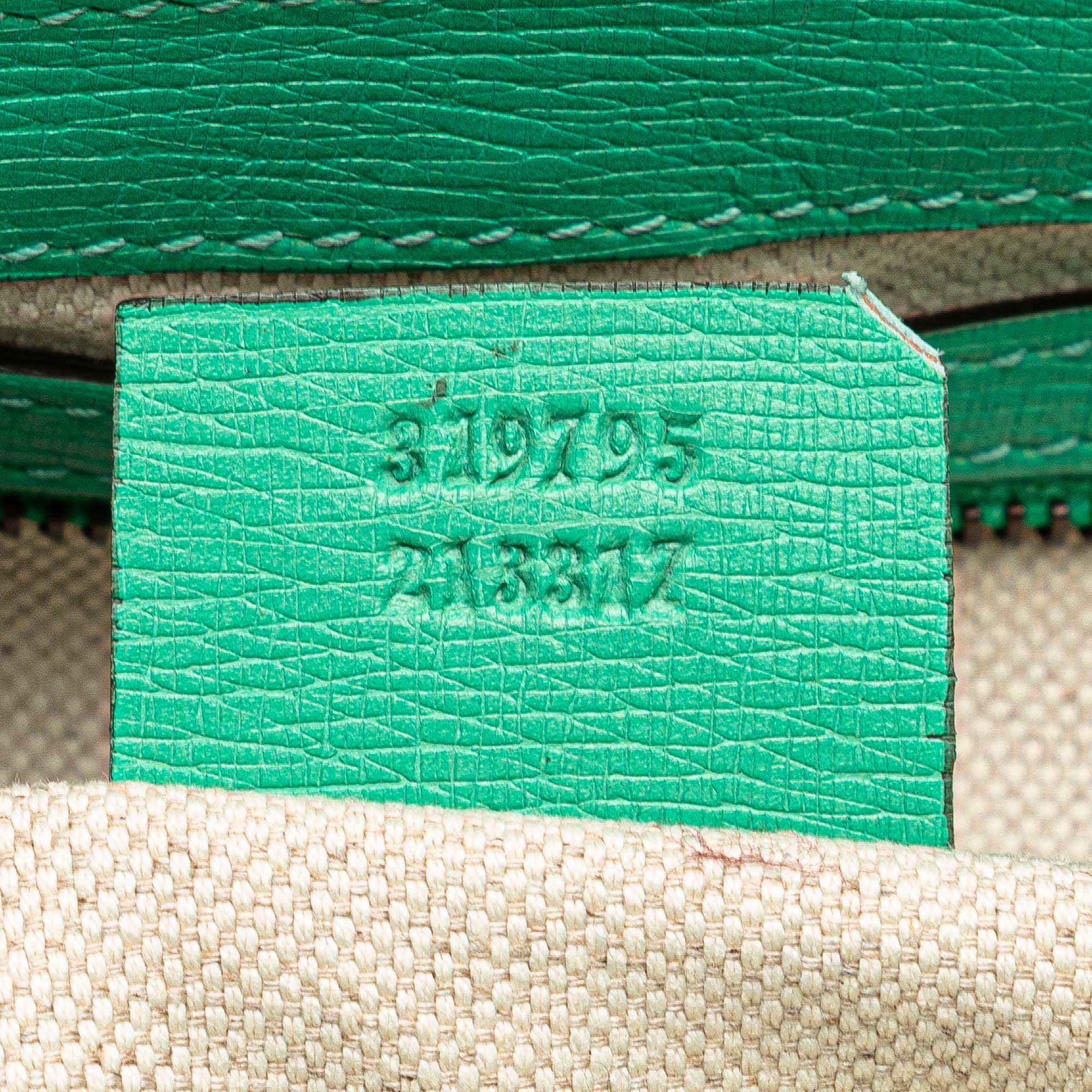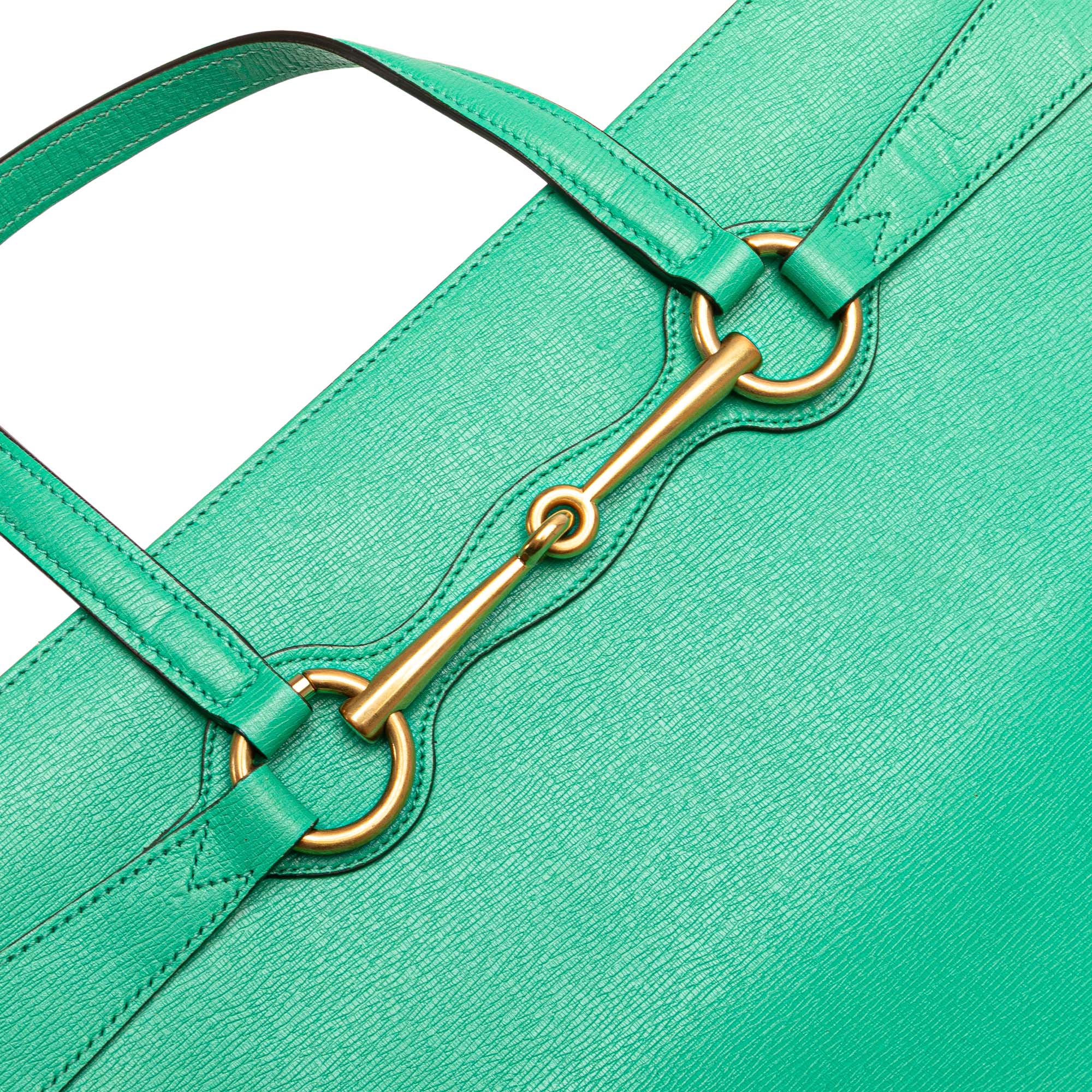 The Bright Bit satchel features a leather body, flat leather handles, a detachable flat leather strap, an open top, an interior zip compartment, and an interior zip pocket. Retail Price: 2100.00