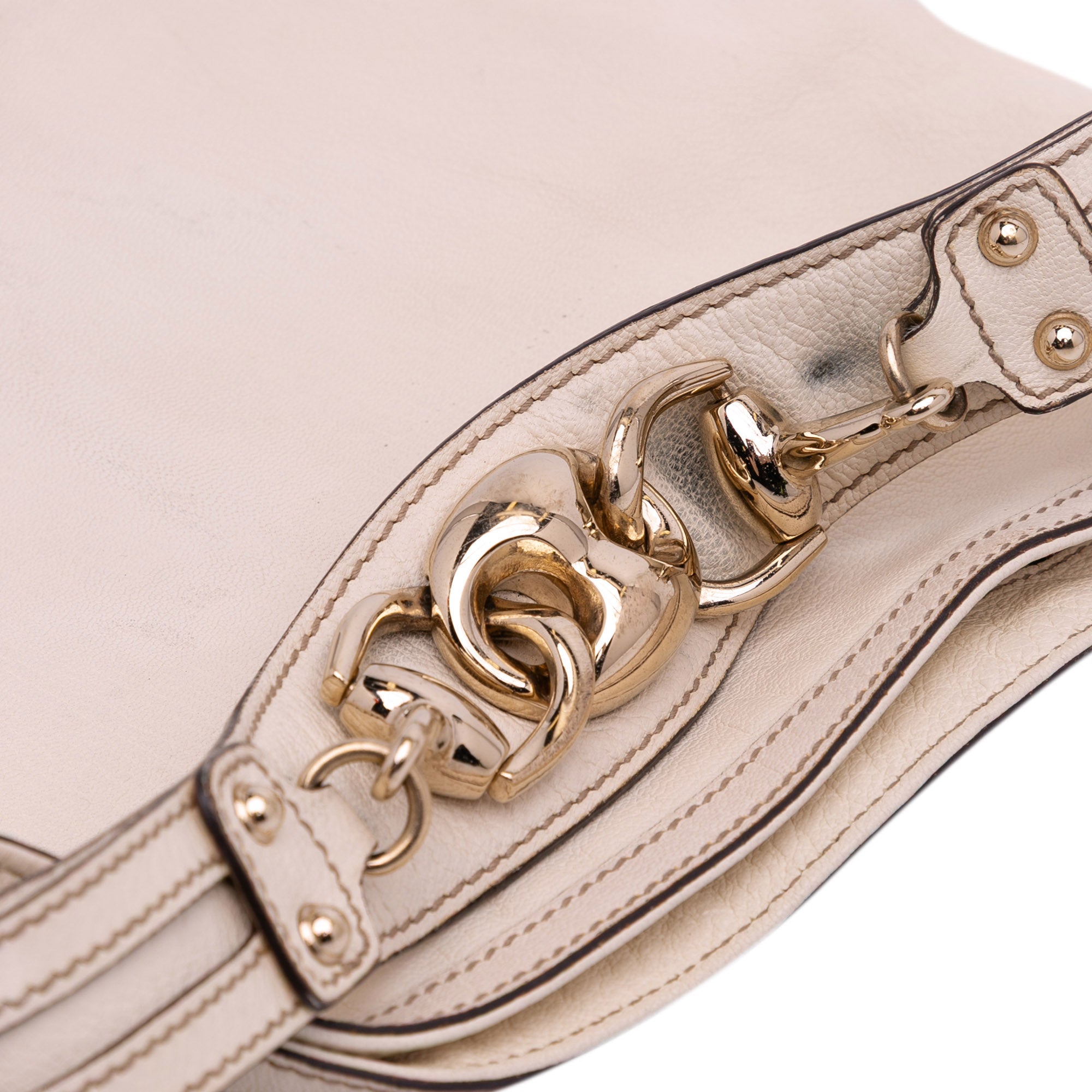 This hobo bag features a leather body, a flat leather handle with horsebit detail, an open top, and interior zip and slip pockets. Retail Price: 740.00