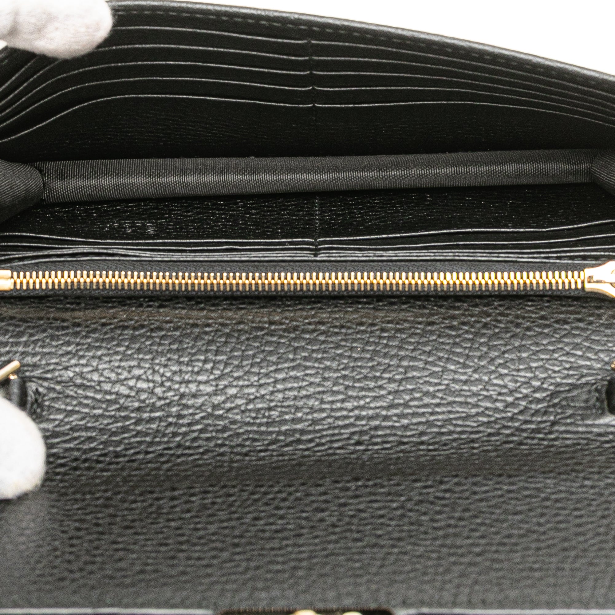This wallet on chain features a leather body, a chain link strap with leather guard, a flap with a snap button closure, an interior zip compartment, and interior slip pockets. Retail Price: 925.00