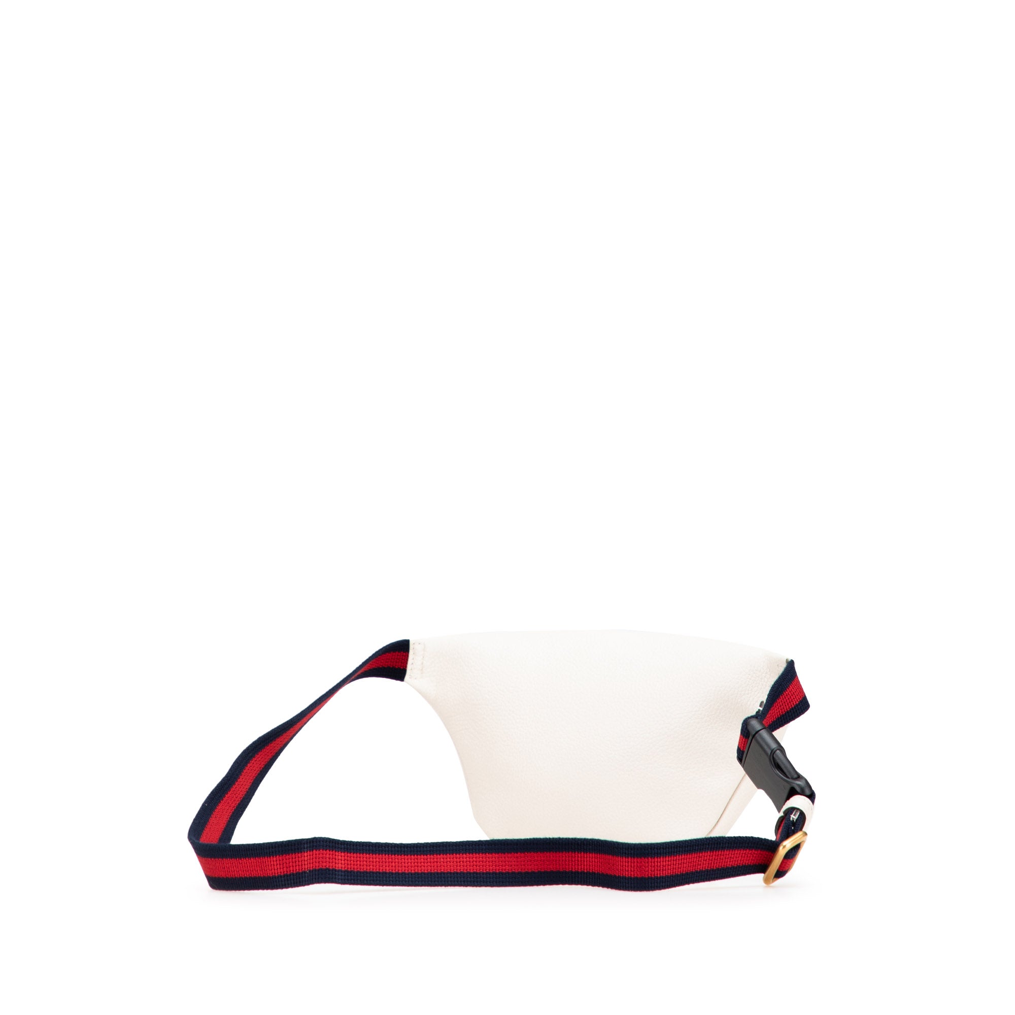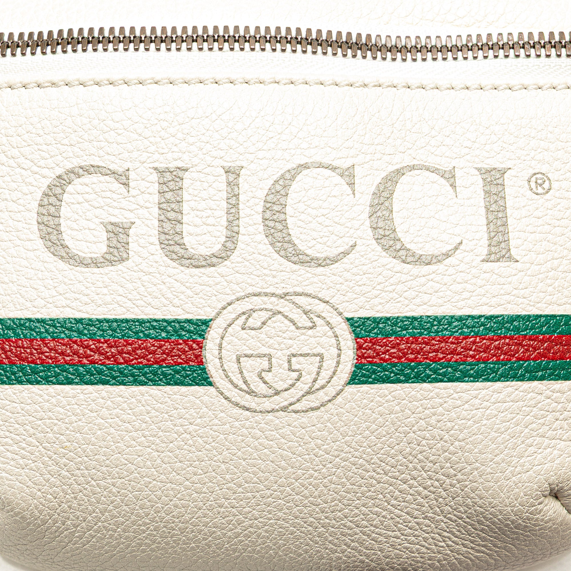 This belt bag features a printed leather body, a canvas waist strap with buckle closure, and a front zip closure. Retail Price: 790.00