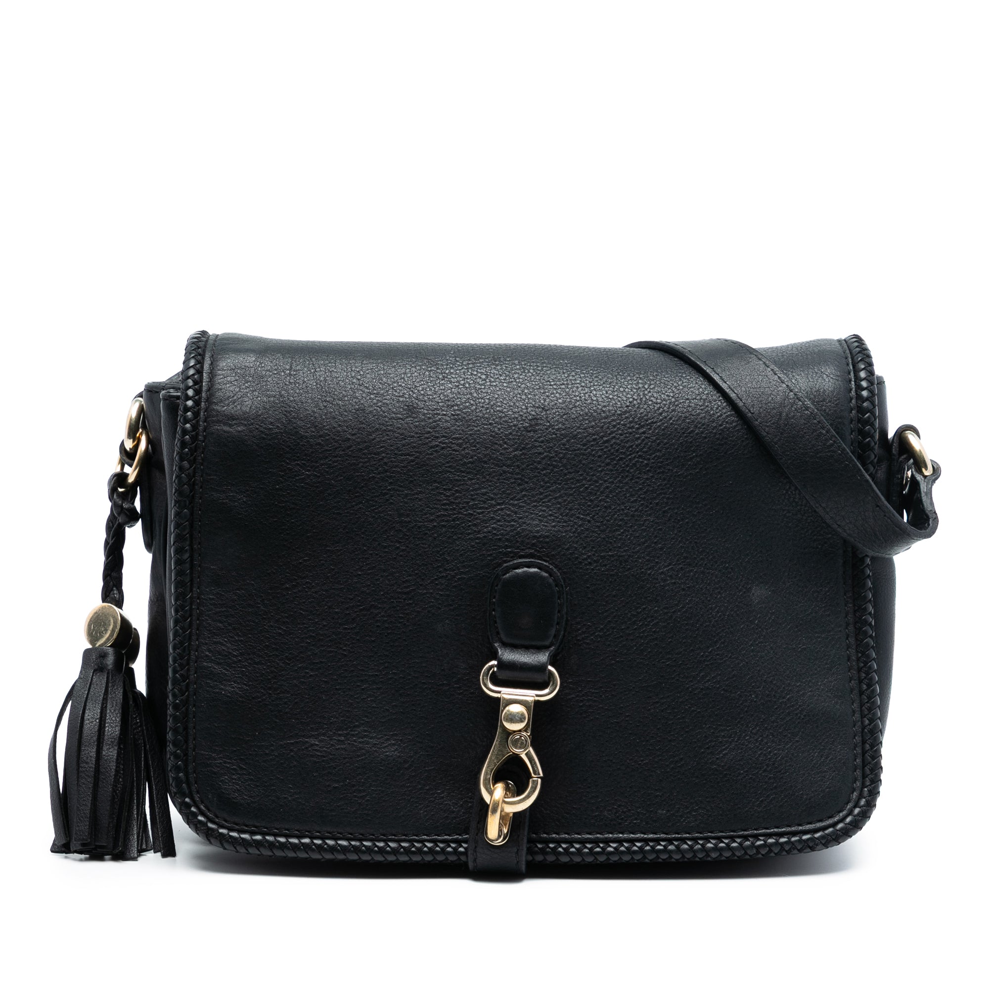 The Marrakech crossbody bag features a leather body, a tassel detail, a flat strap, a front flap with clasp closure, interior compartments, and interior zip and slip pockets. Retail Price: 900.00
