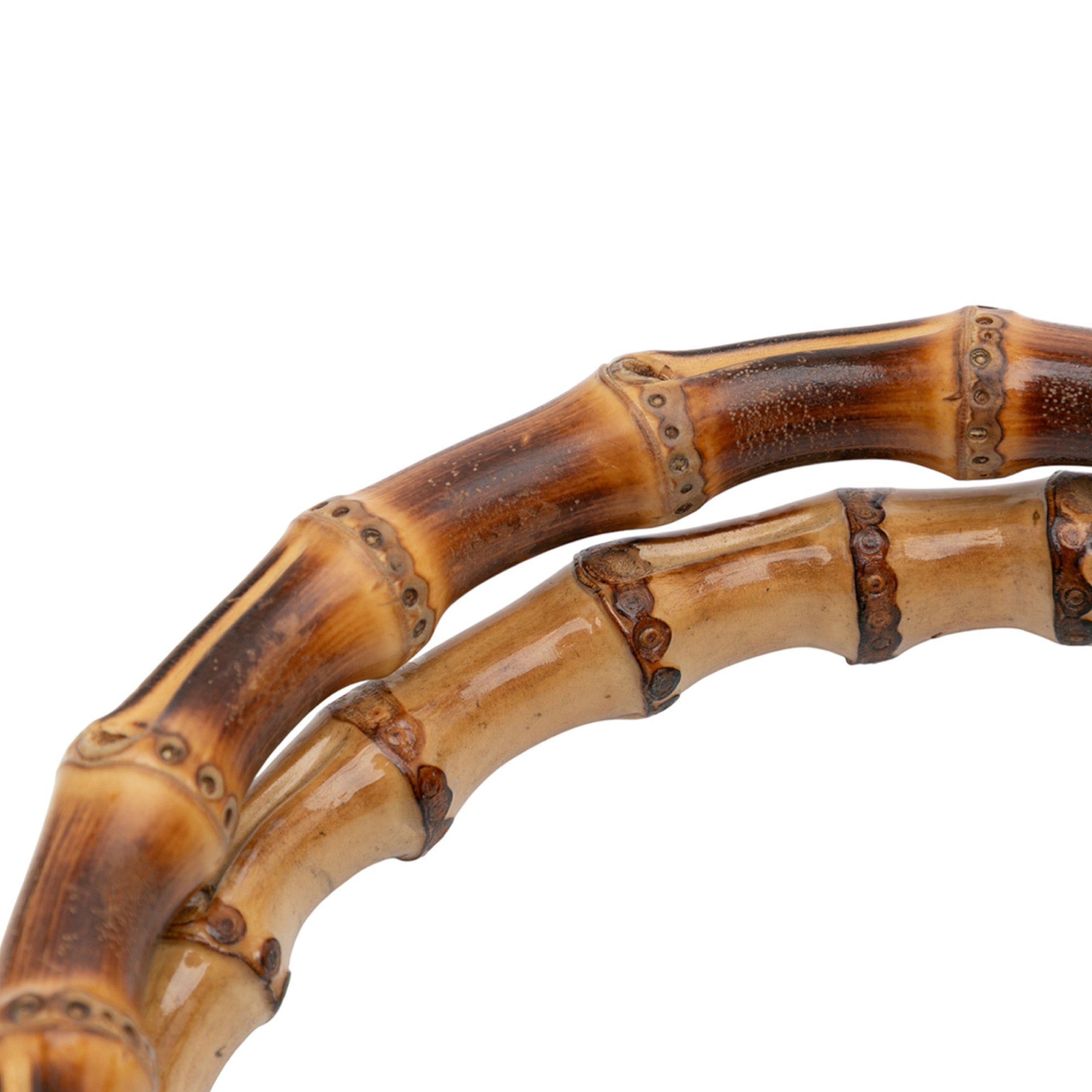 The Bamboo Shopper features a leather body, bamboo top handles, a detachable flat leather strap, an open top with a magnetic closure, and interior zip and slip pockets. Retail Price: 1890.00