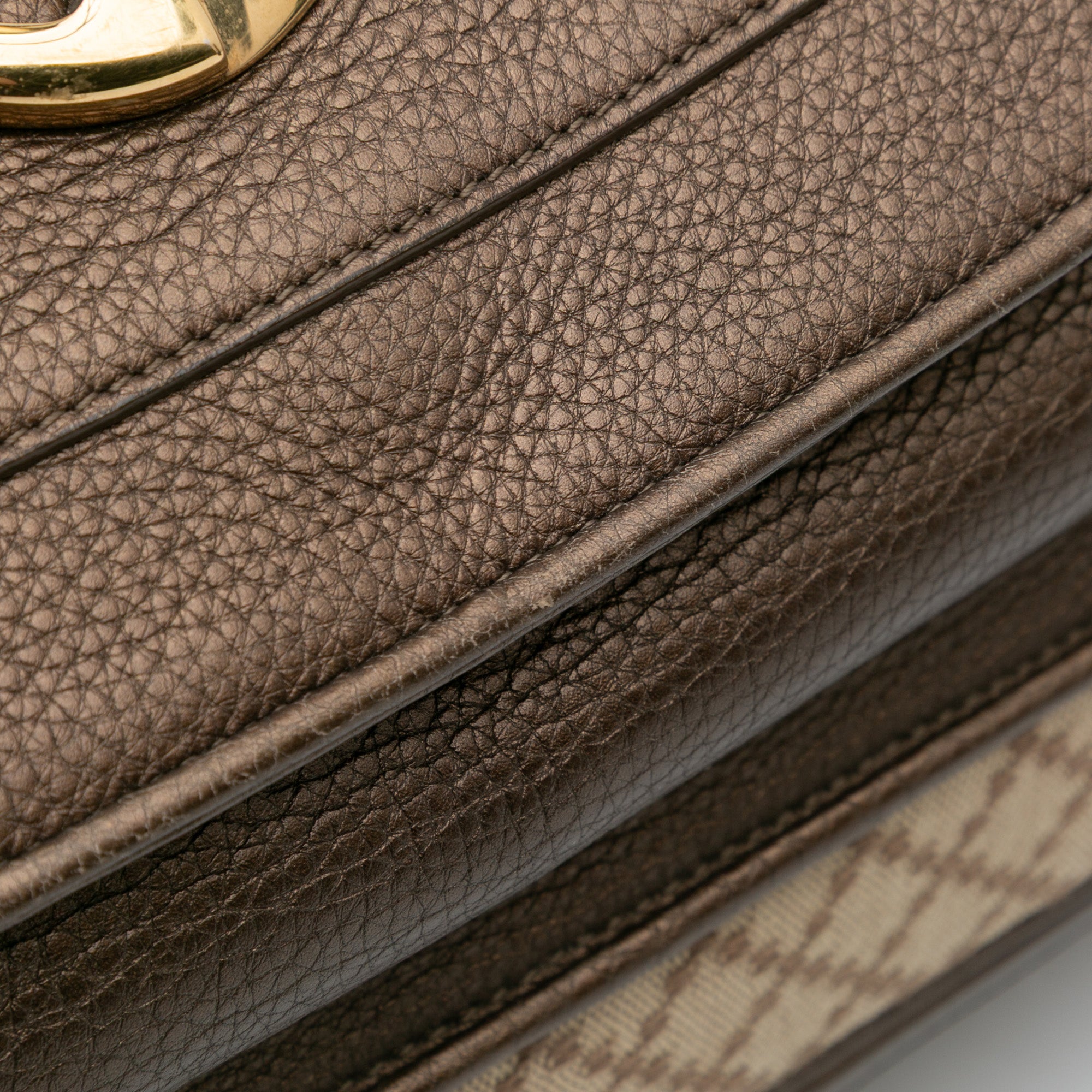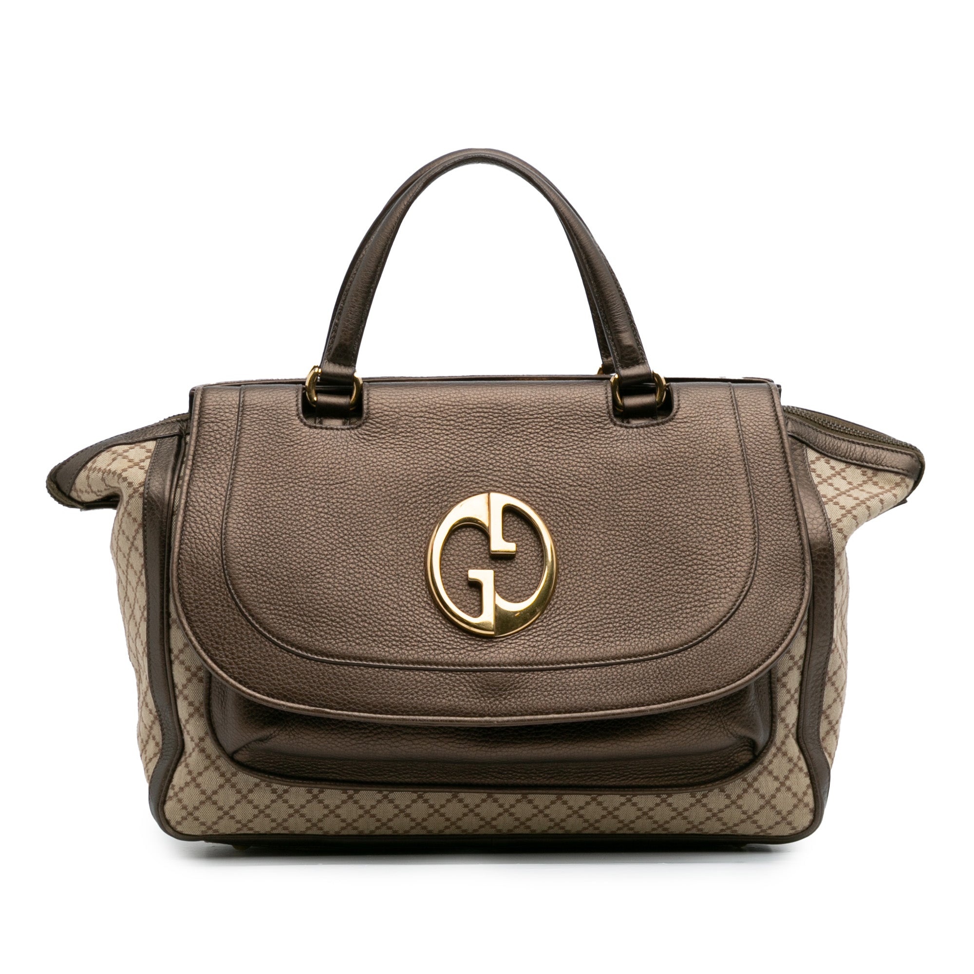 This handbag features a canvas body with leather trim, flat leather handles, a front flap with magnetic closure, a top zip closure, and interior zip and slip pockets. Retail Price: 1195.00