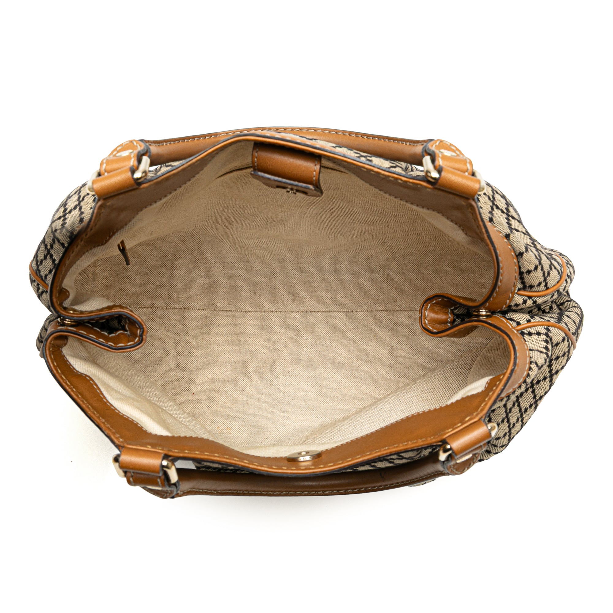 The Sukey features a canvas body with leather trim, rolled leather handles, an open top with magnetic snap closure, and an interior zip pocket. Retail Price: 993.00