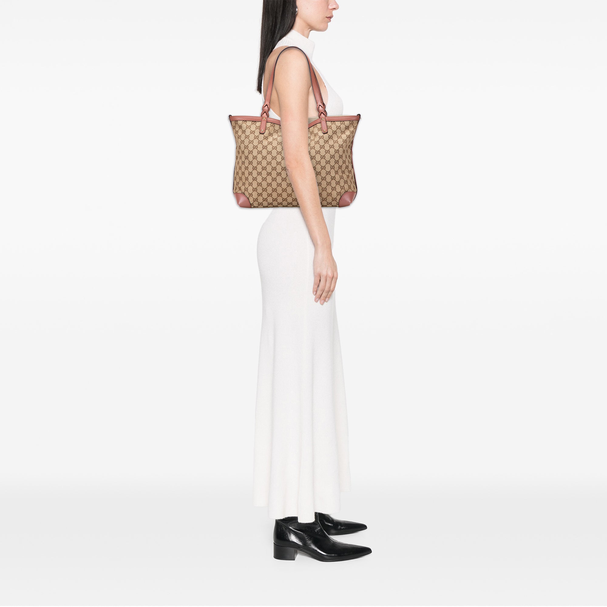 This tote bag features a canvas body with leather trim, flat leather handles, an open top with a lobster clasp closure, and a pouch inclusion. Retail Price: 1145.00