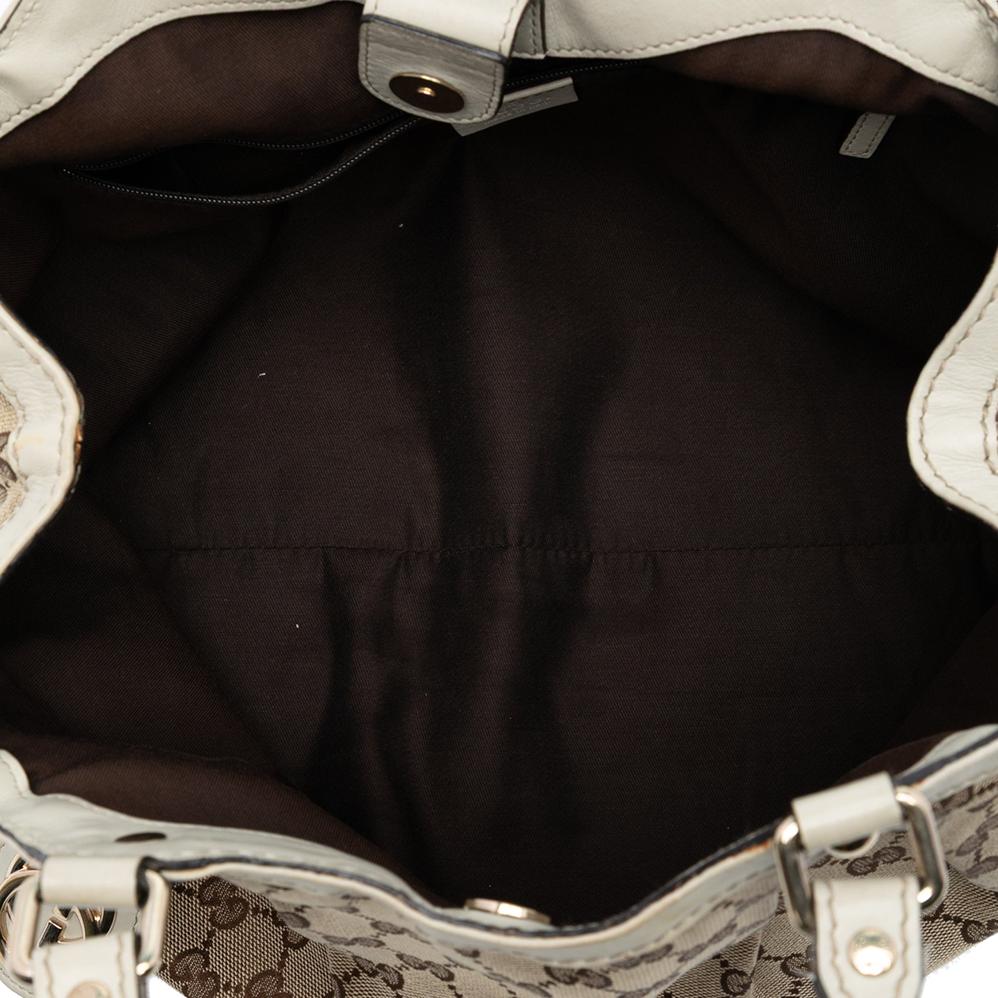 The Sukey tote bag features a canvas body with leather trim, rolled leather handles, an open top with magnetic closure, and an interior zip pocket. Retail Price: 825.00