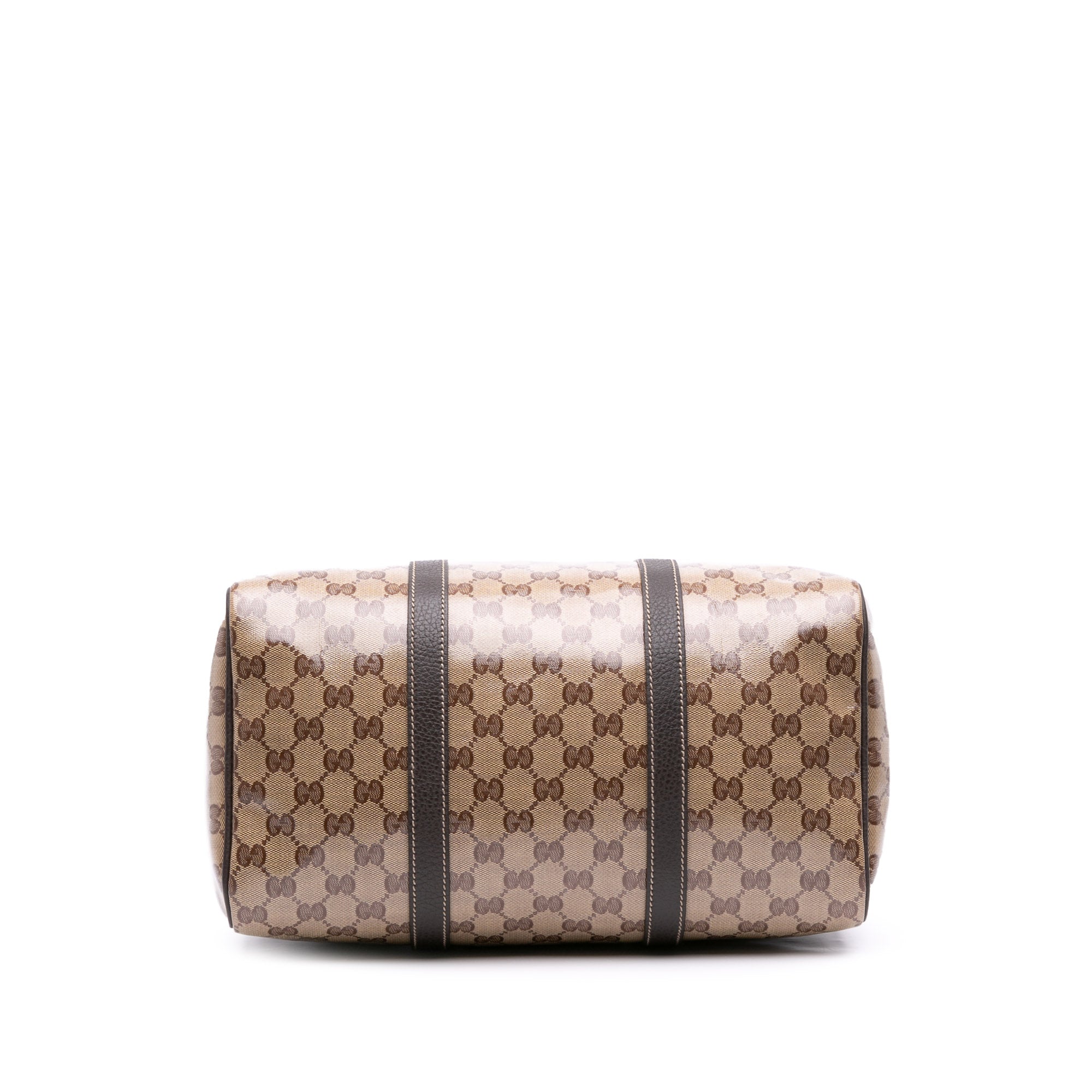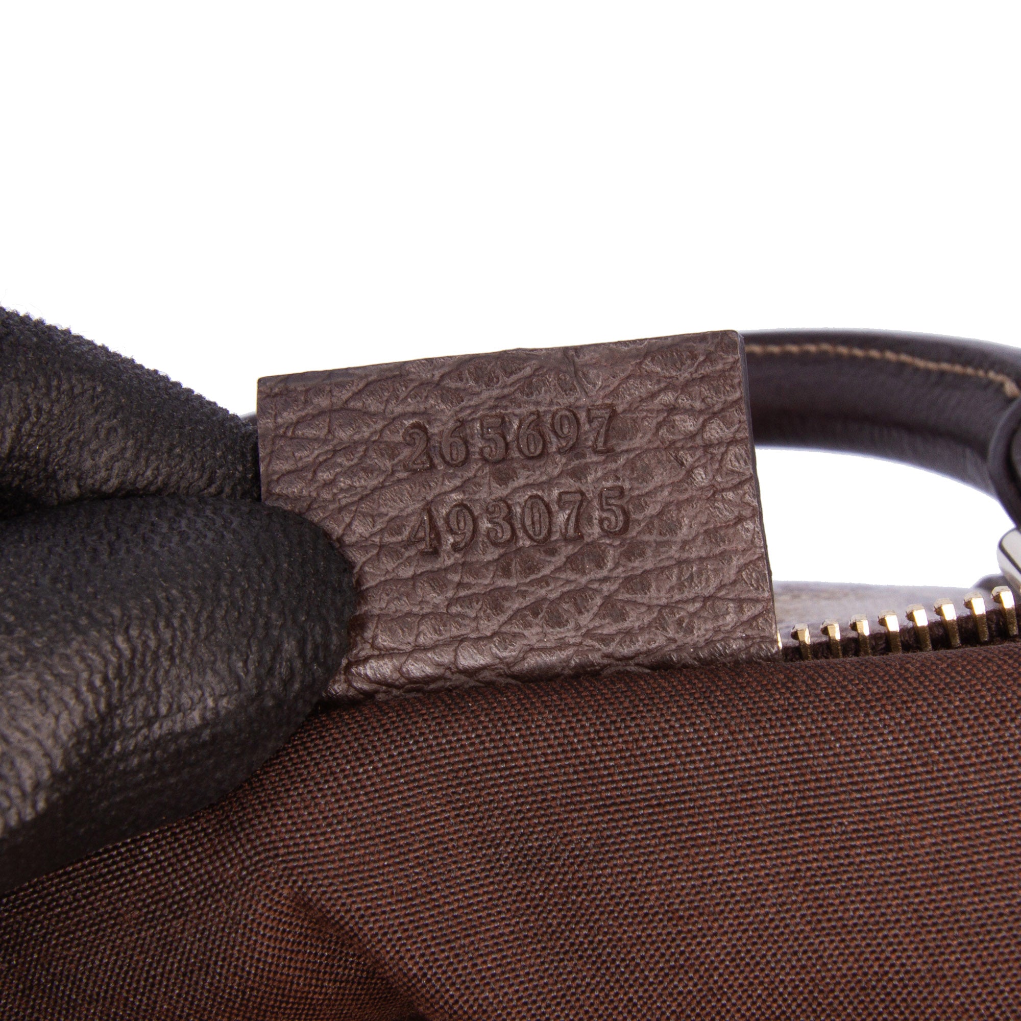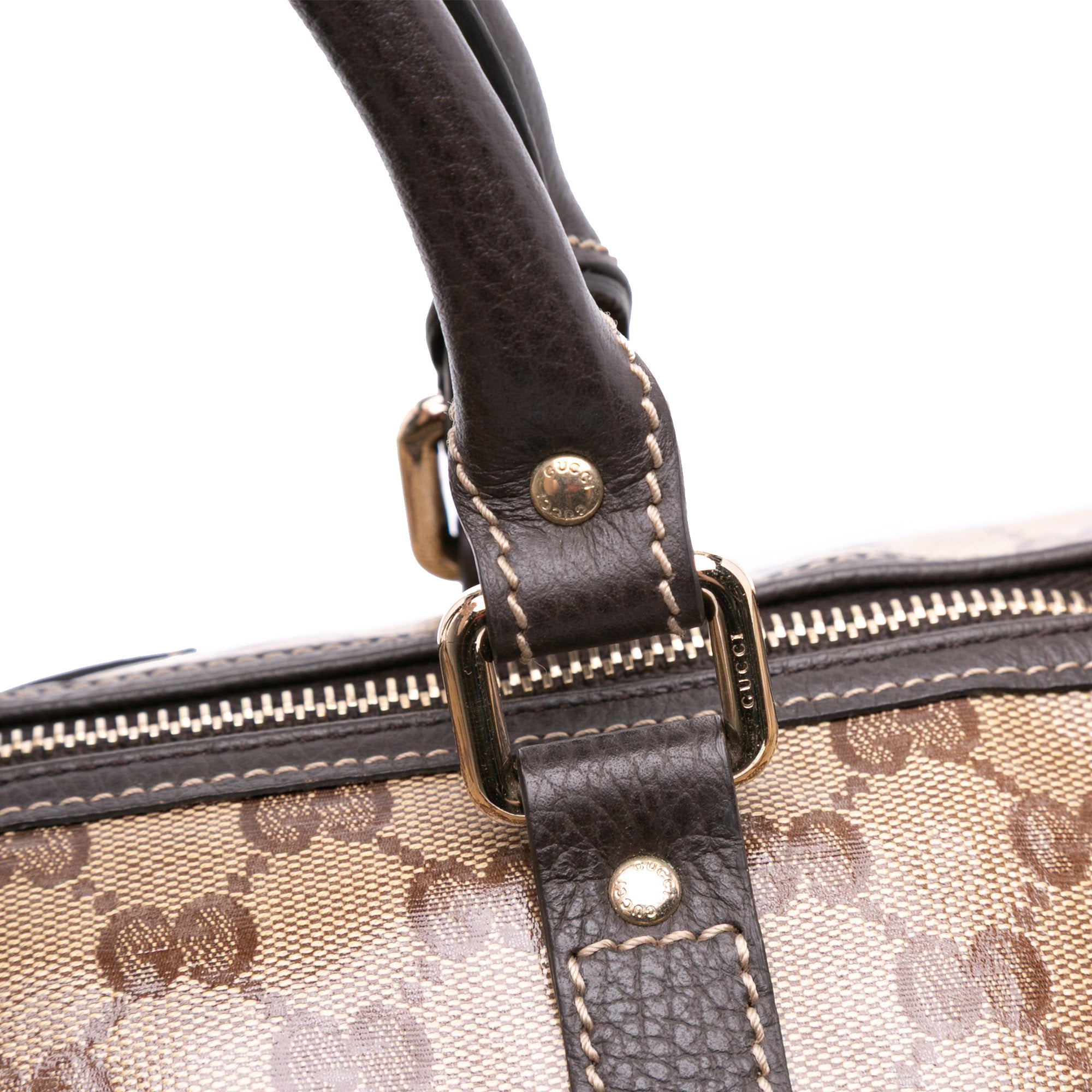 This boston bag features a coated canvas body with leather trim, rolled leather handles, a top zip closure, and an interior slip pocket. Inclusion: Dust bag. Retail Price: 740.00