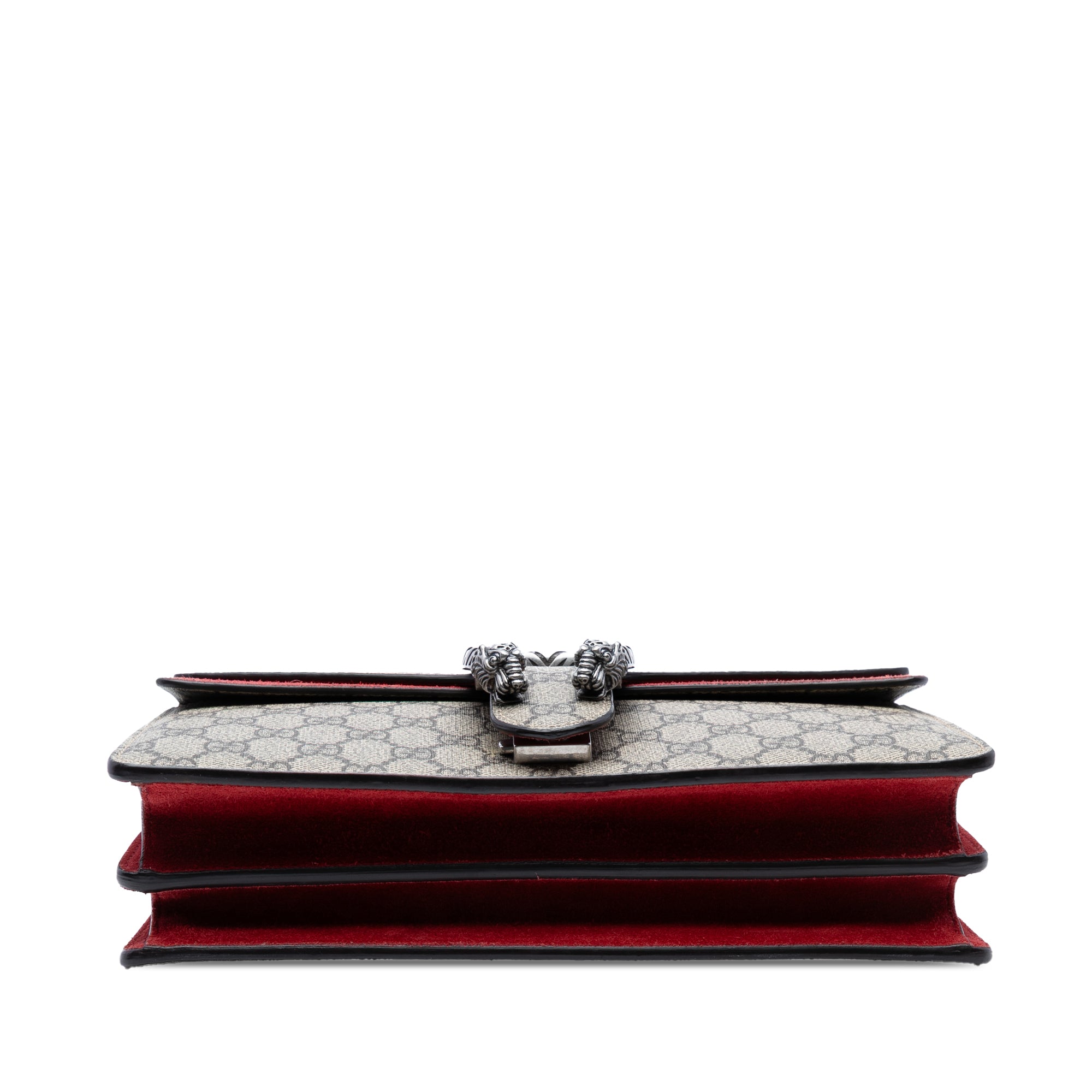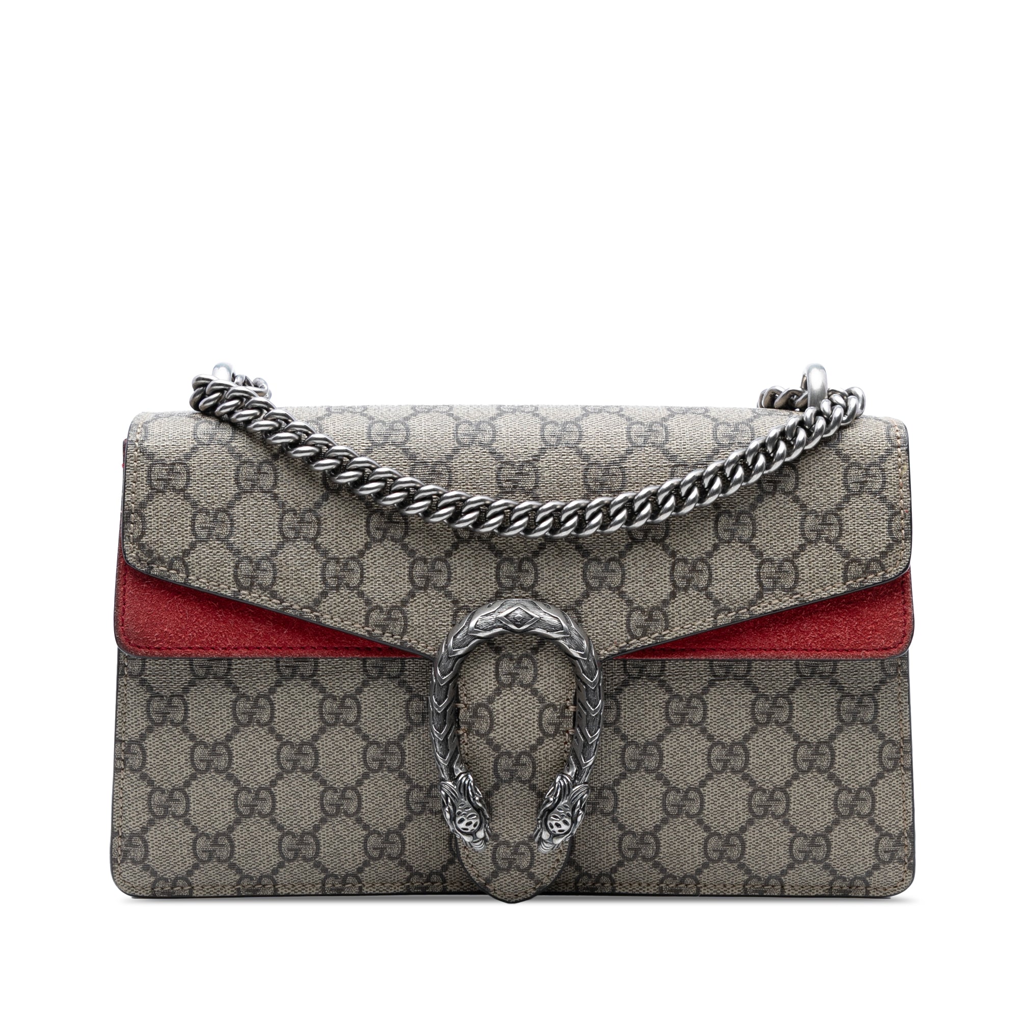 The Dionysus features a coated canvas body with suede leather trim, a silver-tone curb chain shoulder strap, a front flap with push lock closure, and an interior zip compartment. Retail Price: 3040.00