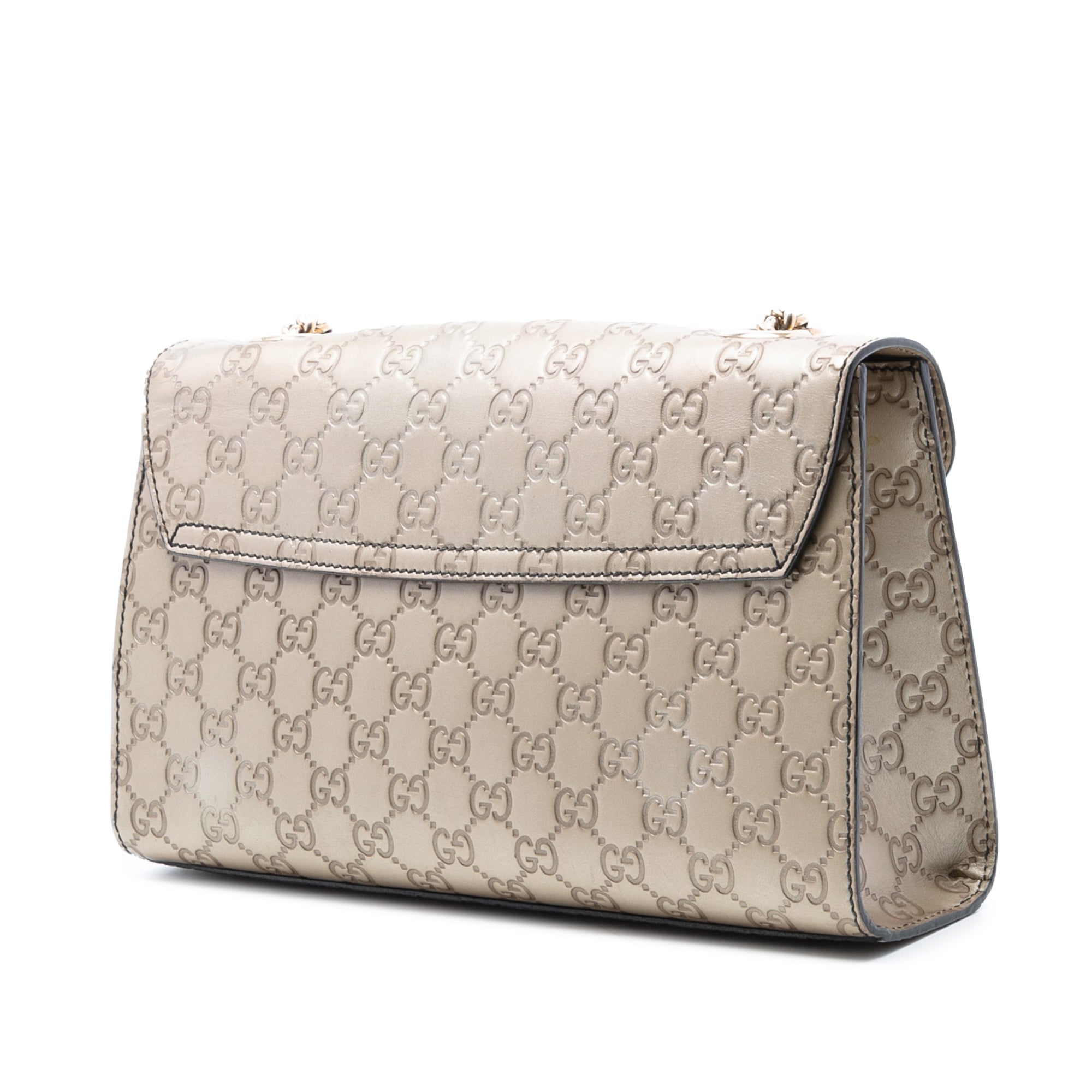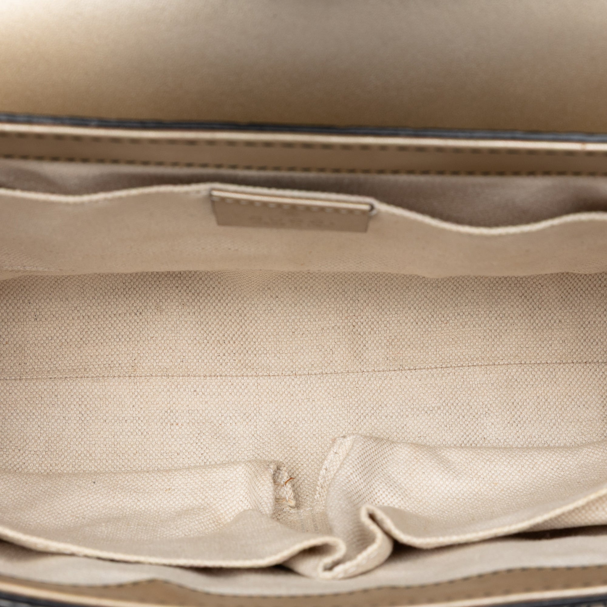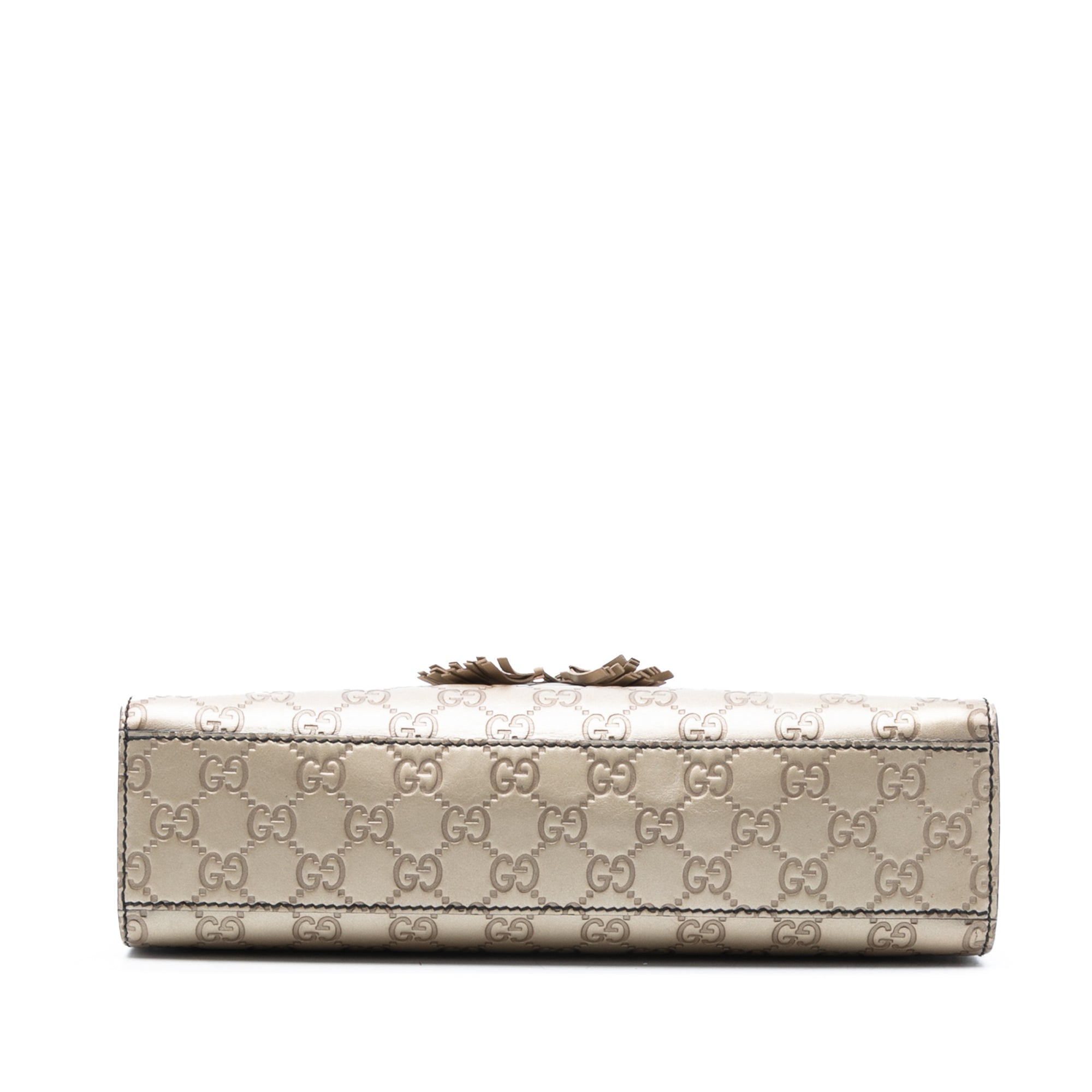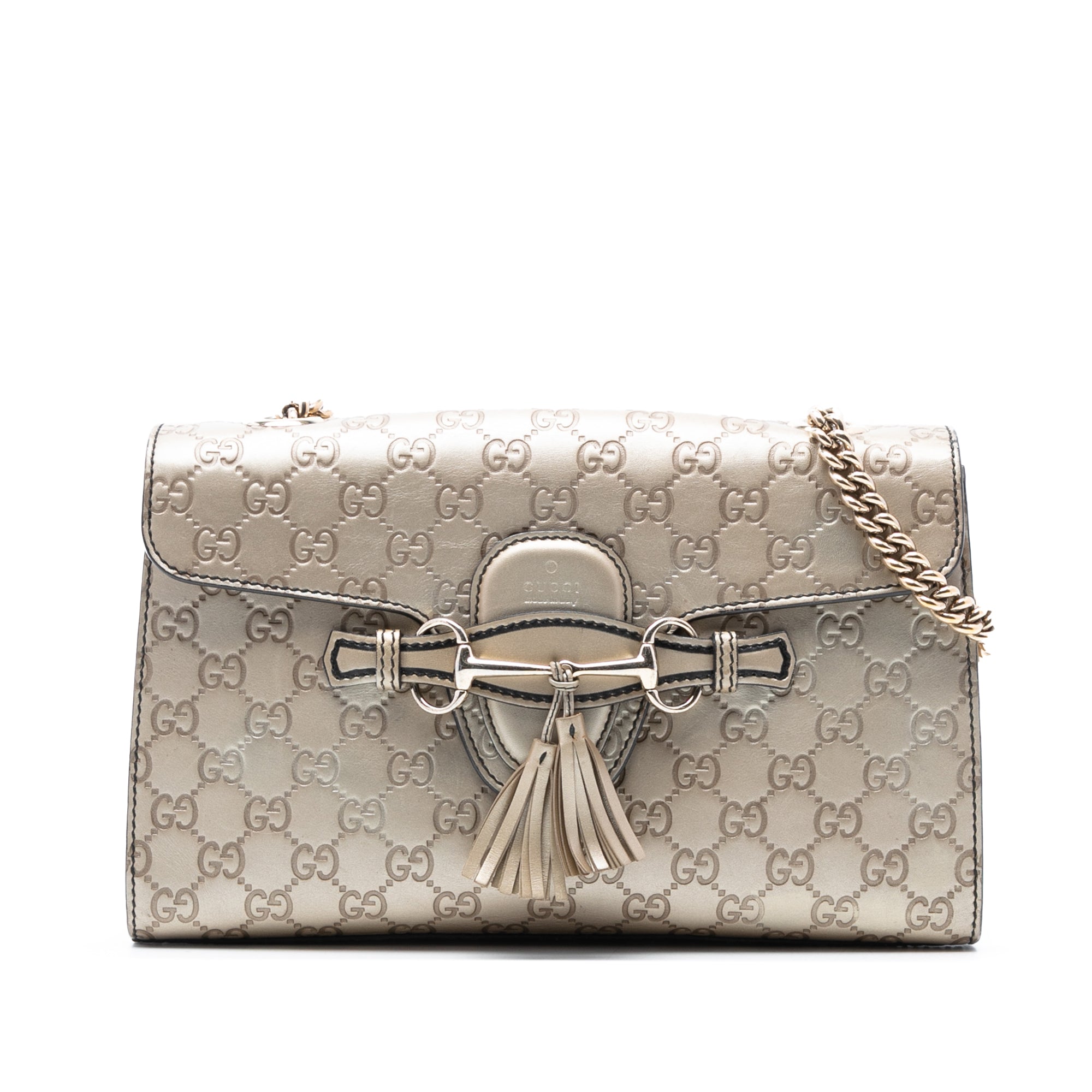 The Emily features an embossed leather body, a chain link strap with leather guard, a front flap with a slip-through closure and a tassel detail, and interior slip pockets. Retail Price: 1430.00