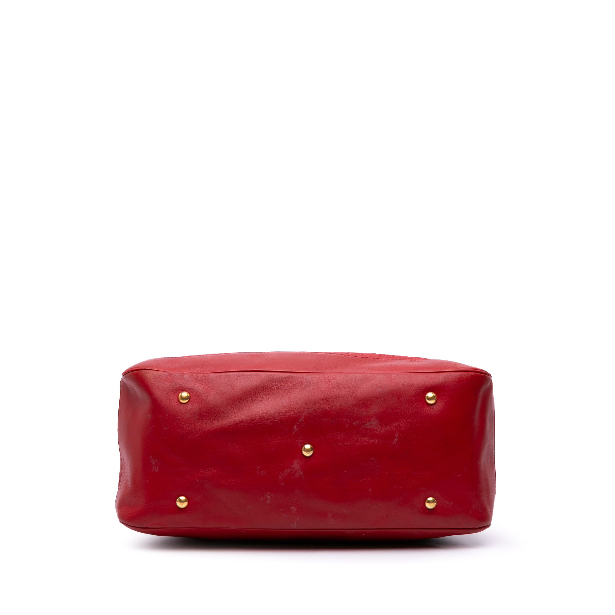 This satchel features an embossed leather body, flat leather handles, a detachable flat leather strap, an open top with magnetic snap closure, and interior zip and slip pockets. Retail Price: 1500.00