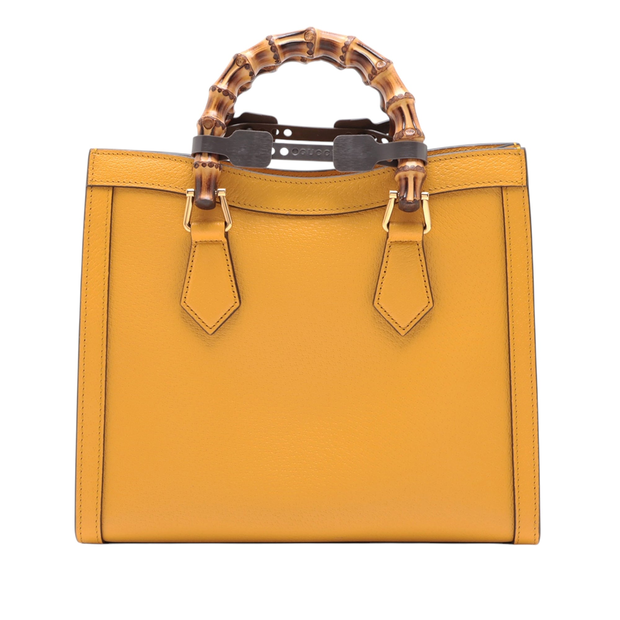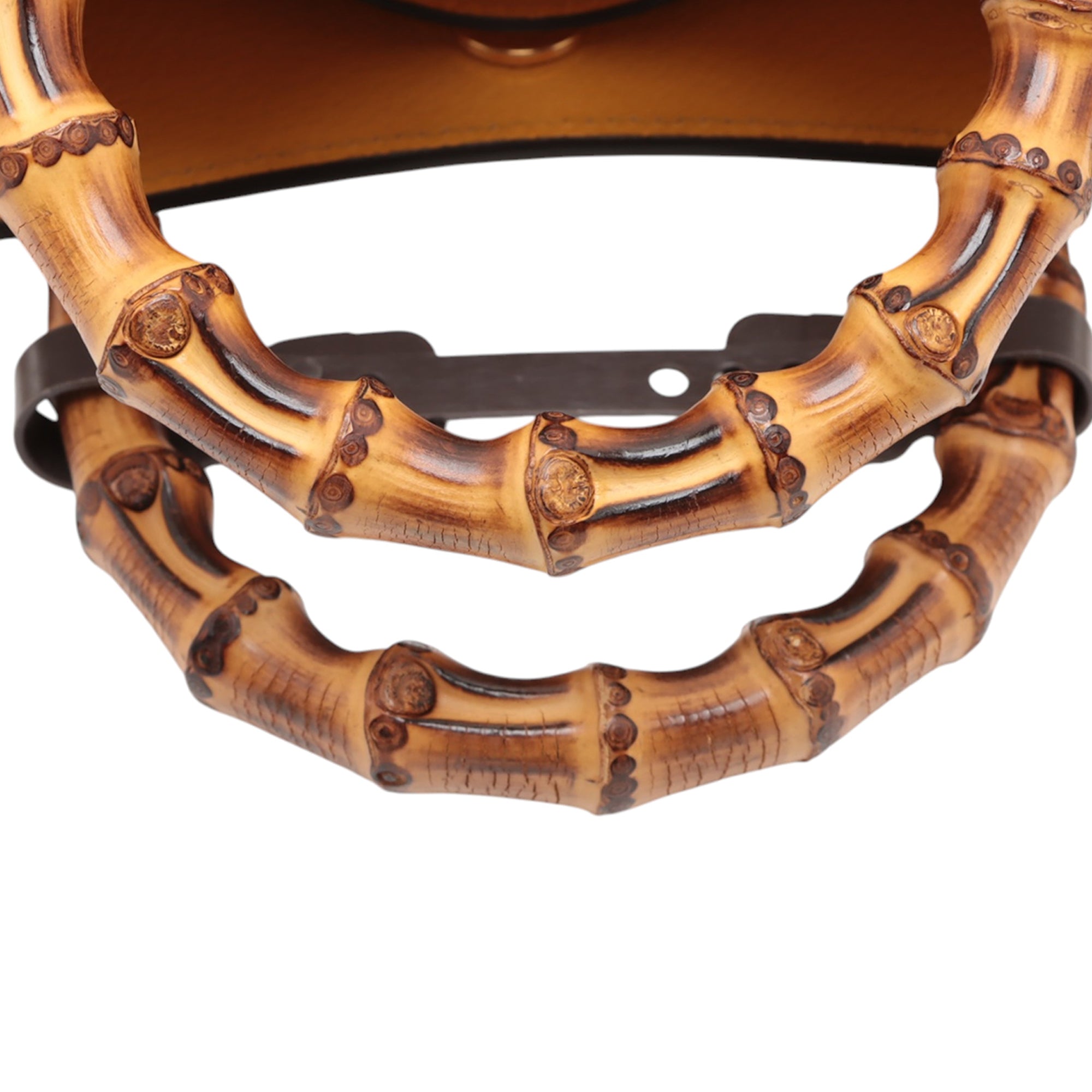 The Diana features a leather body, bamboo handles, a detachable canvas web strap, a fold in flap with magnetic snap button closure, and an interior slip pocket. Retail Price: 4490.00