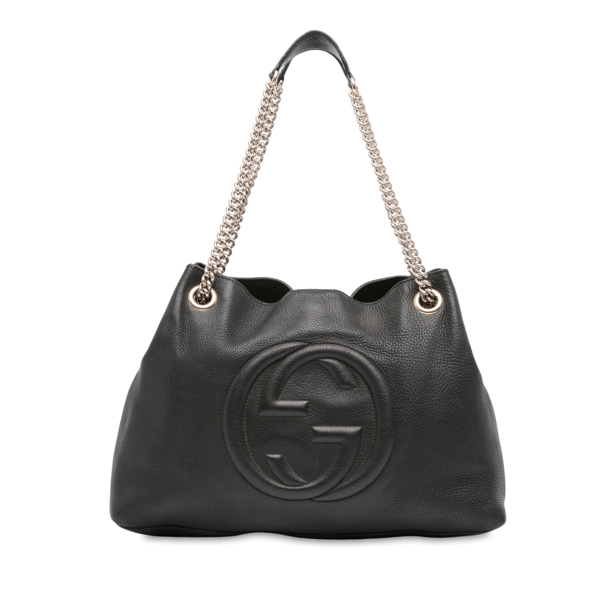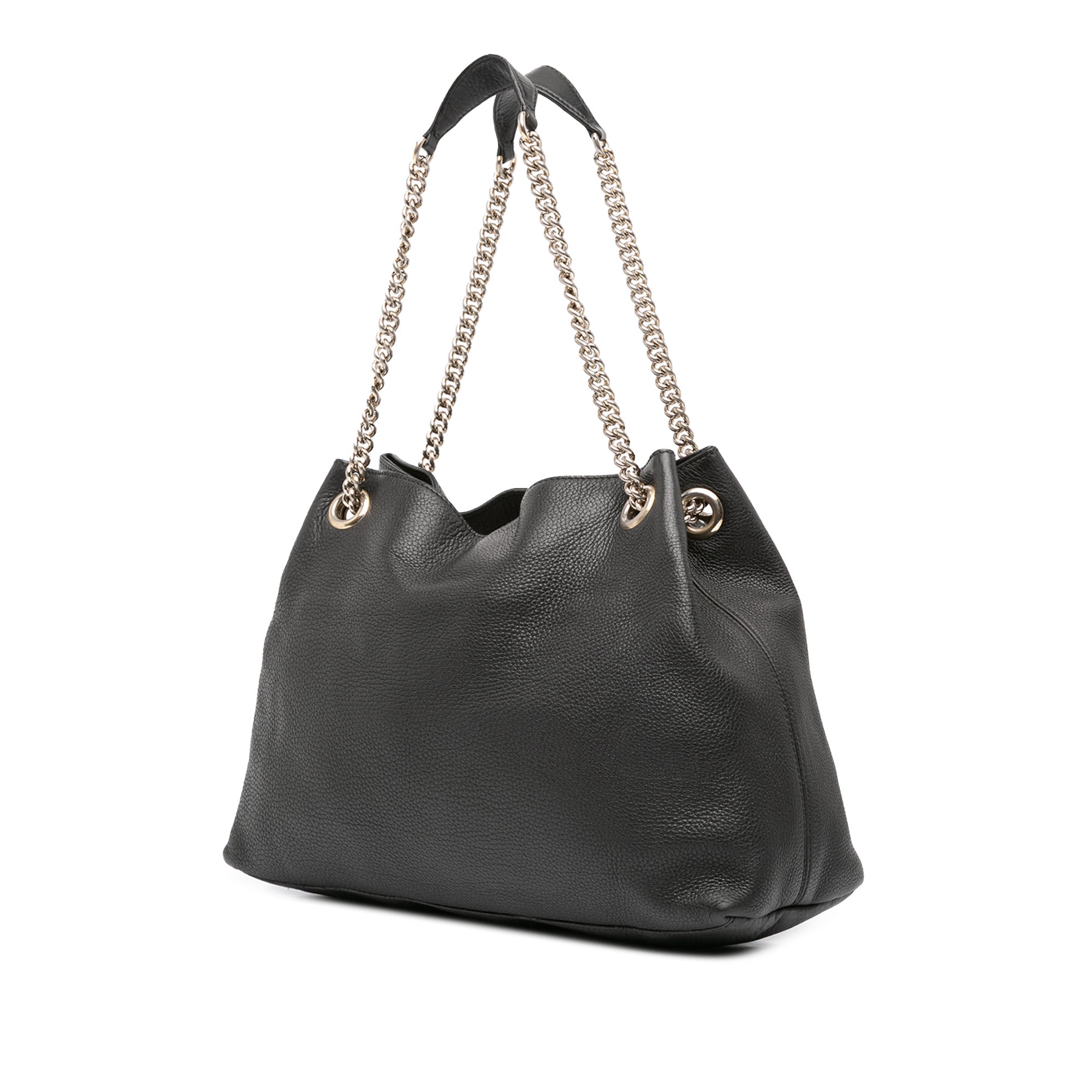 The Soho Chain features a leather body, curb chain straps, an open top with a lobster claw closure, and interior zip and slip pockets. Retail Price: 1425.00