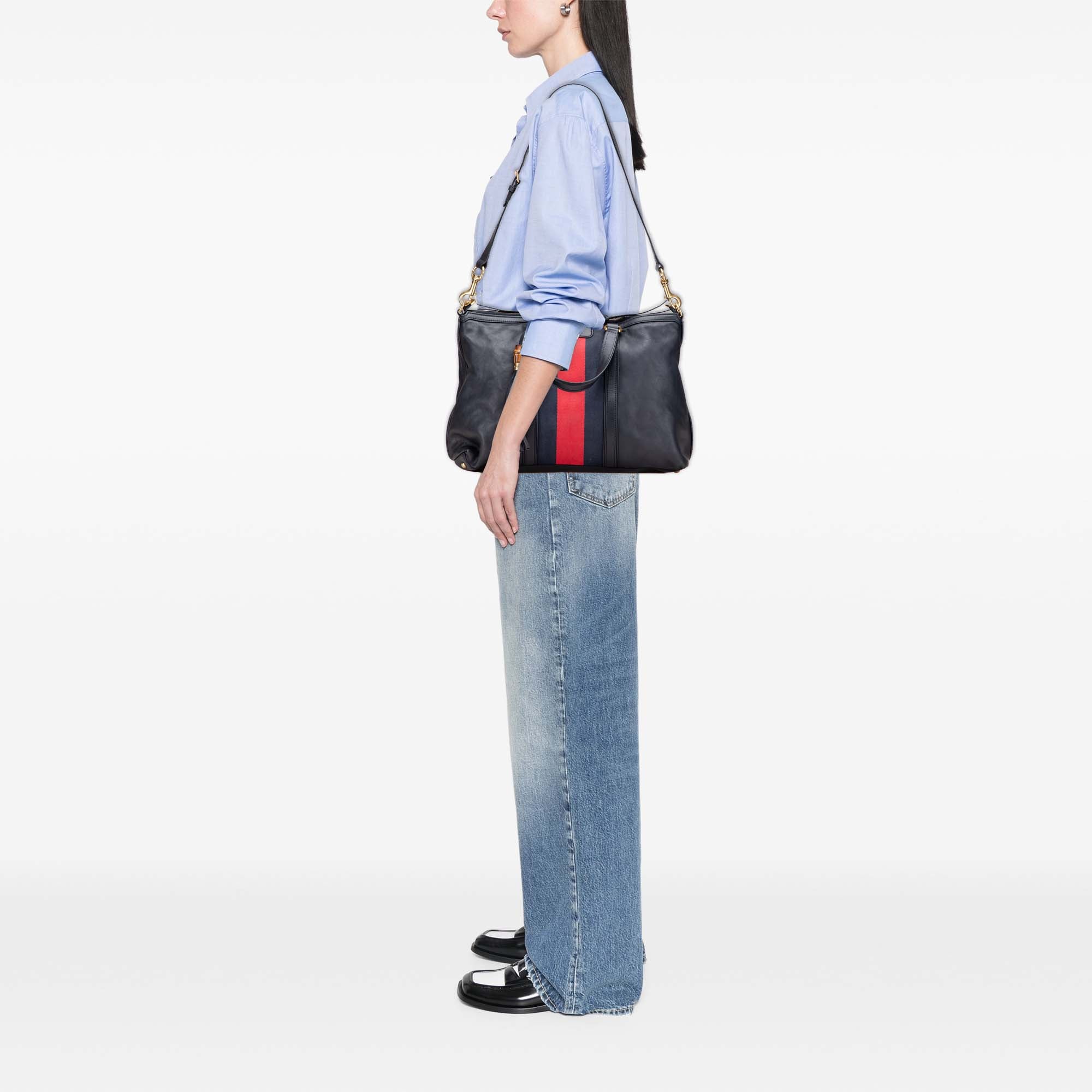 This satchel features a leather body with web canvas detail, flat leather handles, a detachable leather strap, a top zip closure, and interior zip and slip pockets. Retail Price: 1435.00