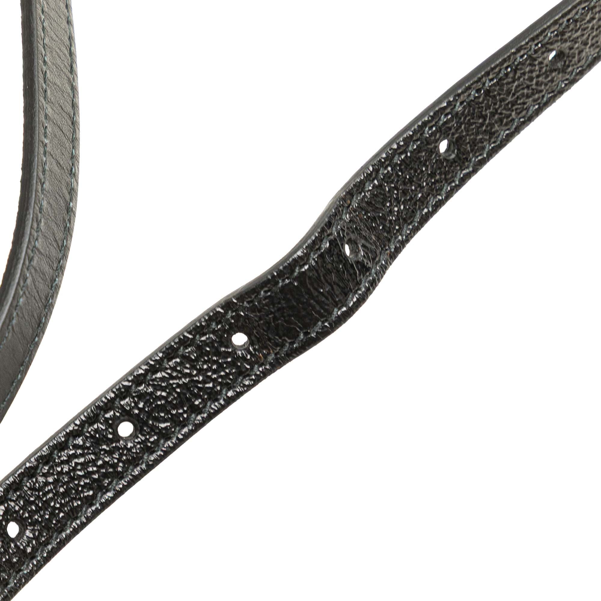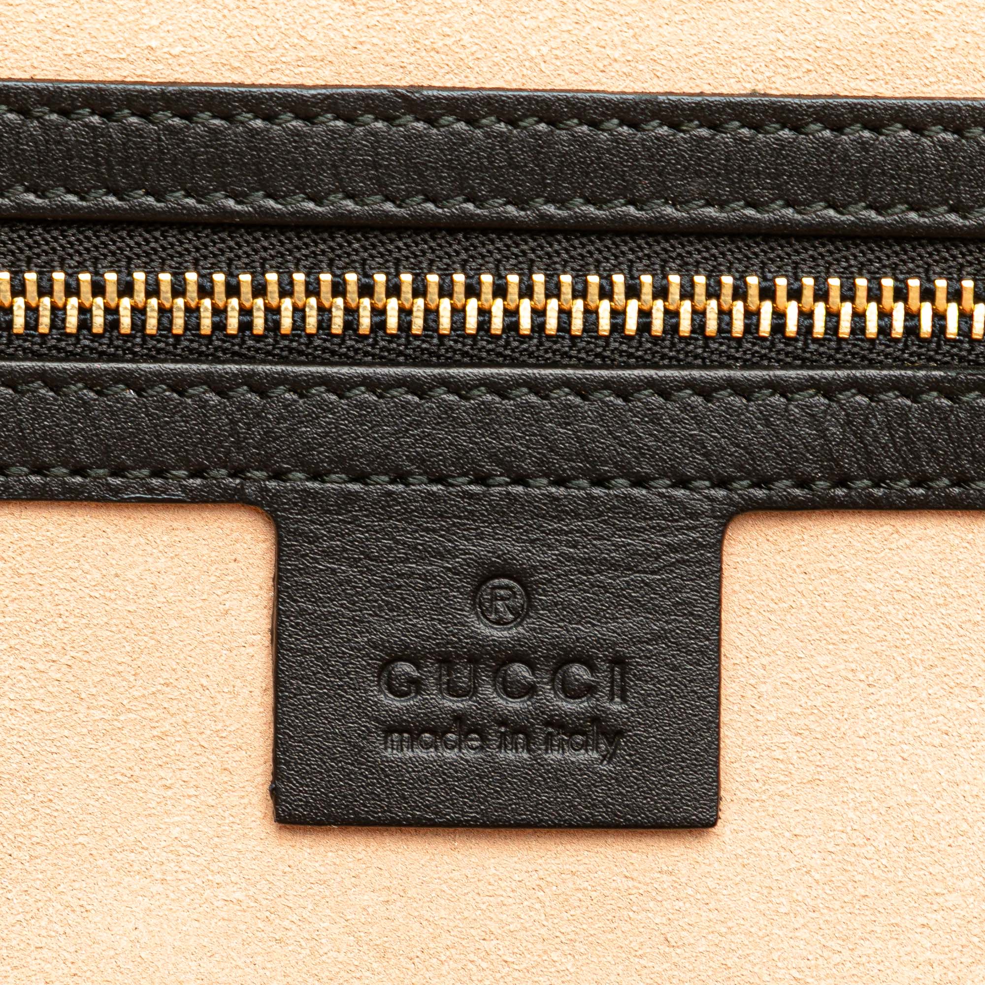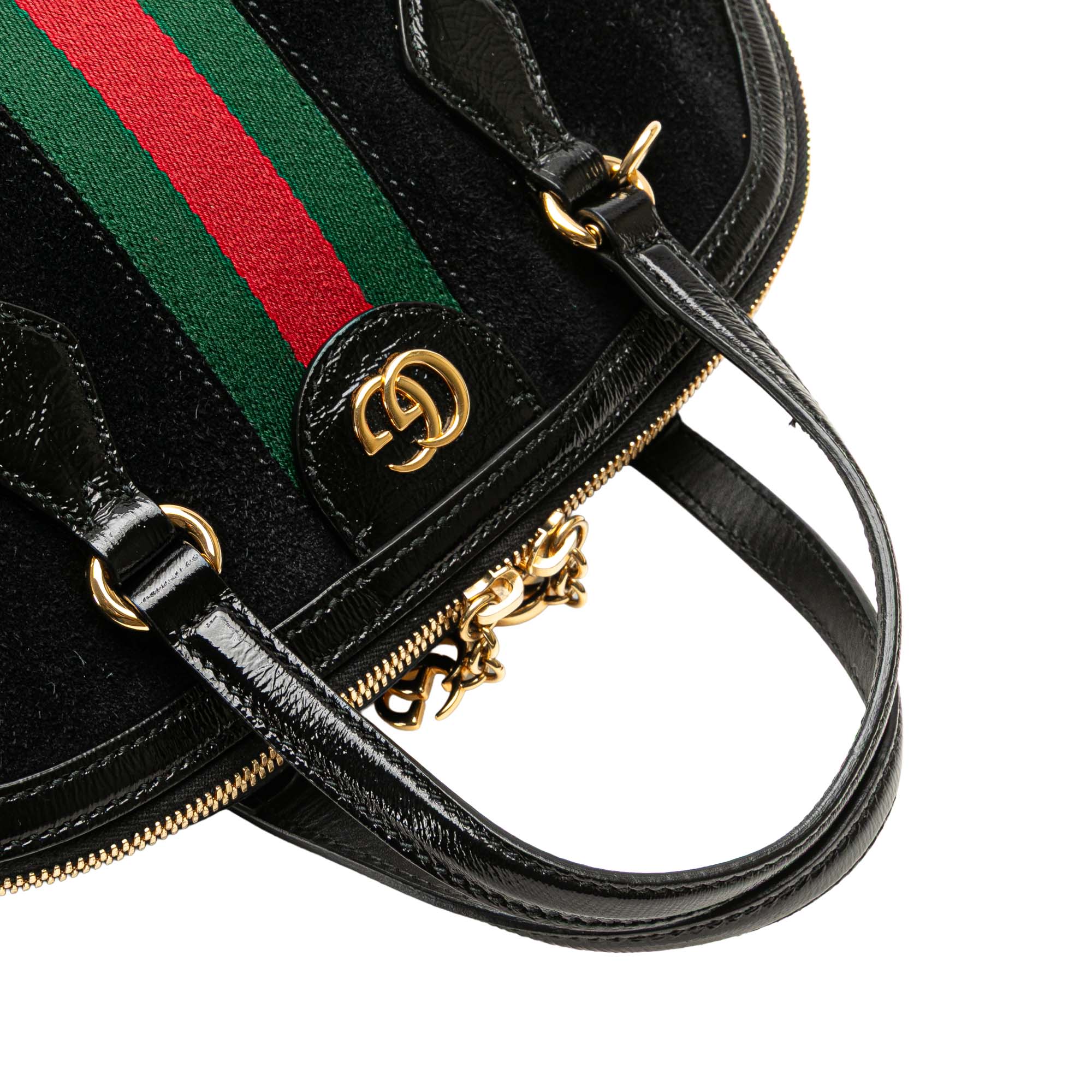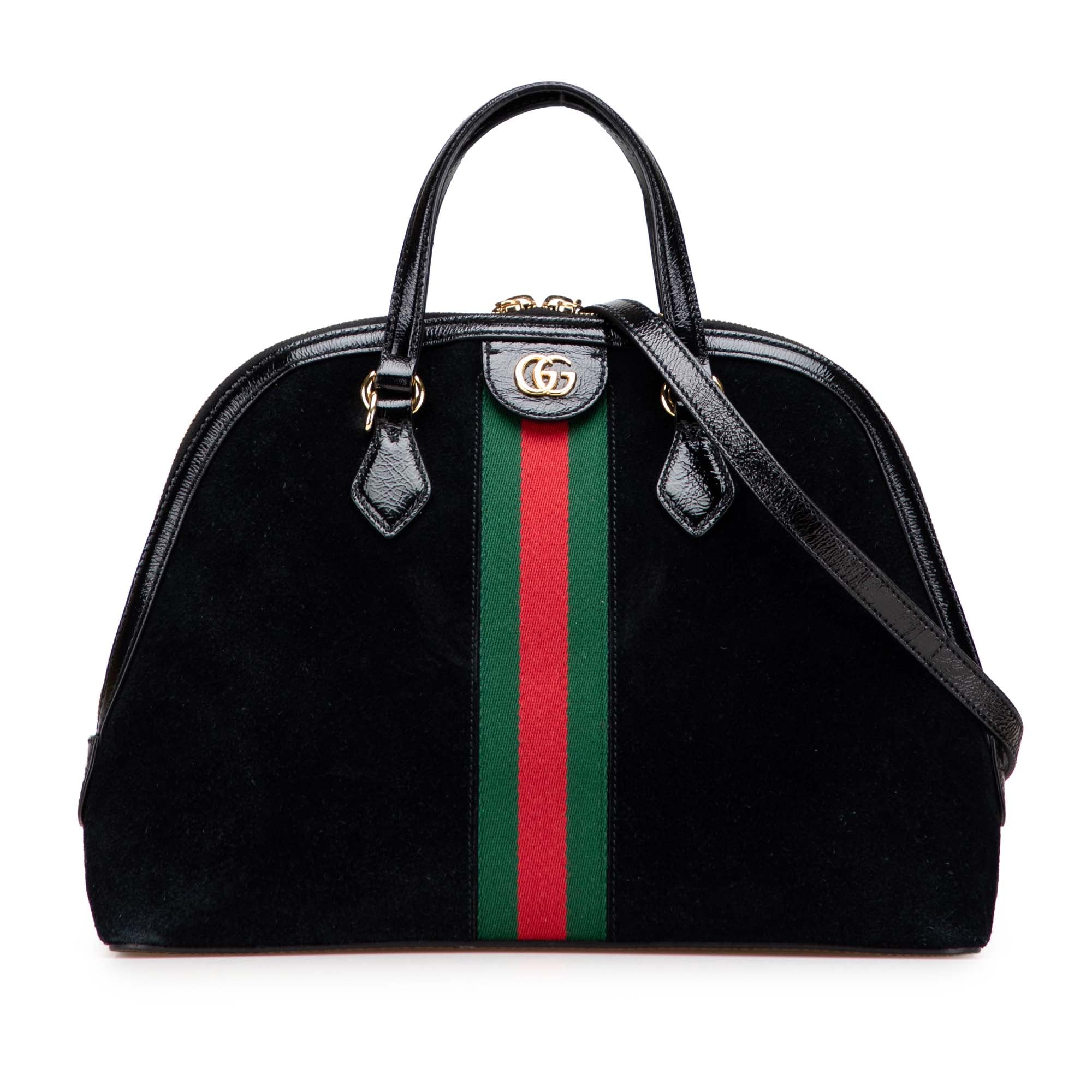 The Ophidia satchel features a suede body with patent leather trim, flat patent leather handles, a detachable flat leather strap, a two-way zip around closure, and interior zip and slip pockets. Retail Price: 2900.00