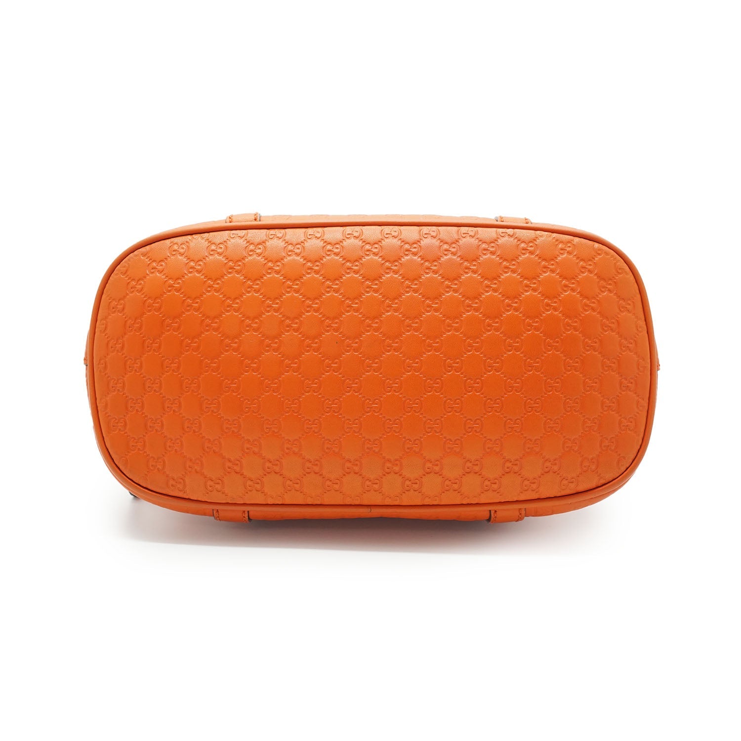 Microguccissima Dome 2way Handbag Orange LeatherDepth: 12.5cmHeight: 18cmWidth: 24cmShoulder Drop: 45cmHand Drop: 10cmOutside Rank: ABInside Rank: BStain: Some yellow stains on the inside fabric, small stain at the top near the zipperWorn: Minor signs of wear on the insideOdor: No odor presentInclude: Leather shoulder strapSerial code: 449654 498075SKU: 7030009