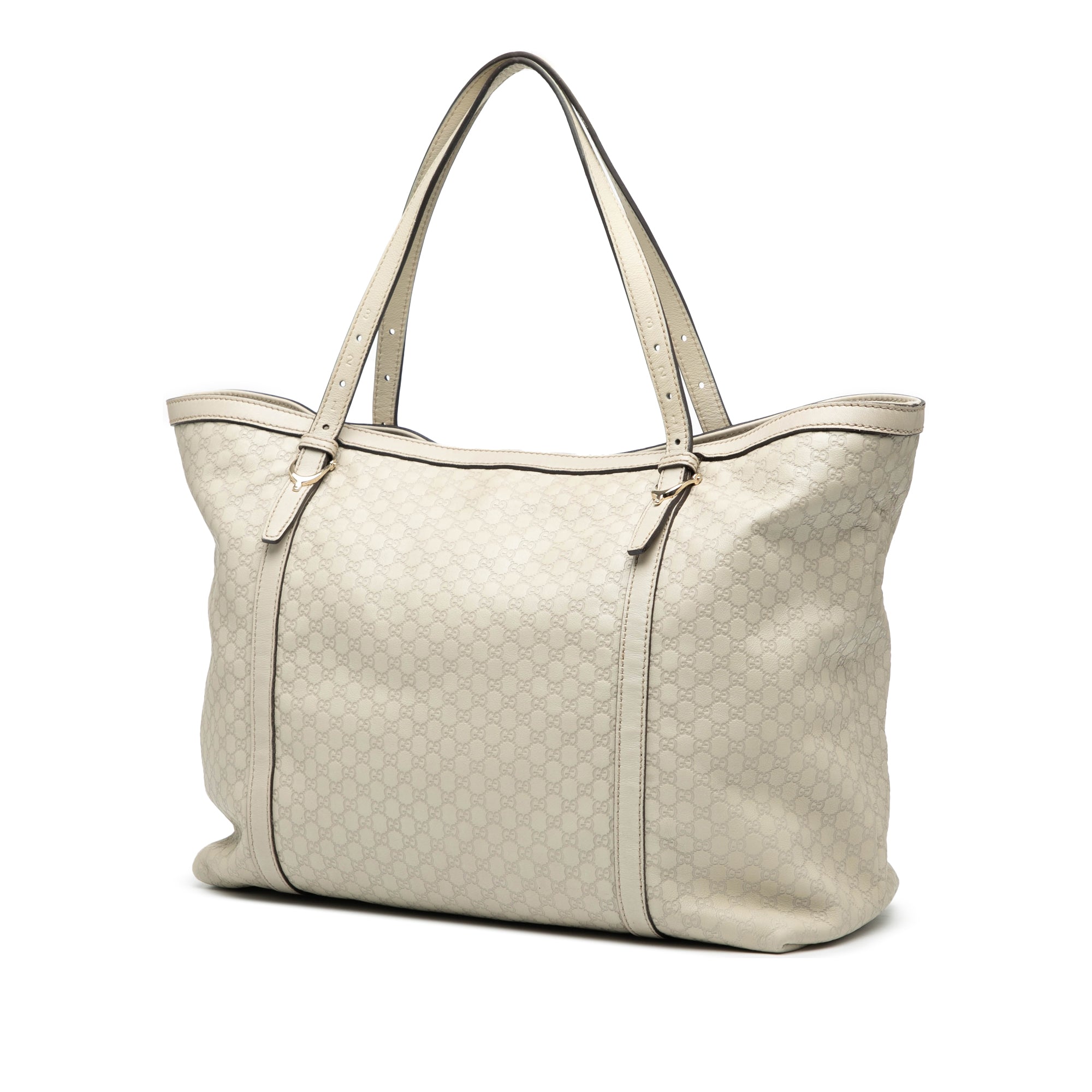 The Nice tote bag features an embossed leather body, flat leather straps, an open top with lobster clasp closure, and interior zip and slip pockets. Retail Price: 1270.00