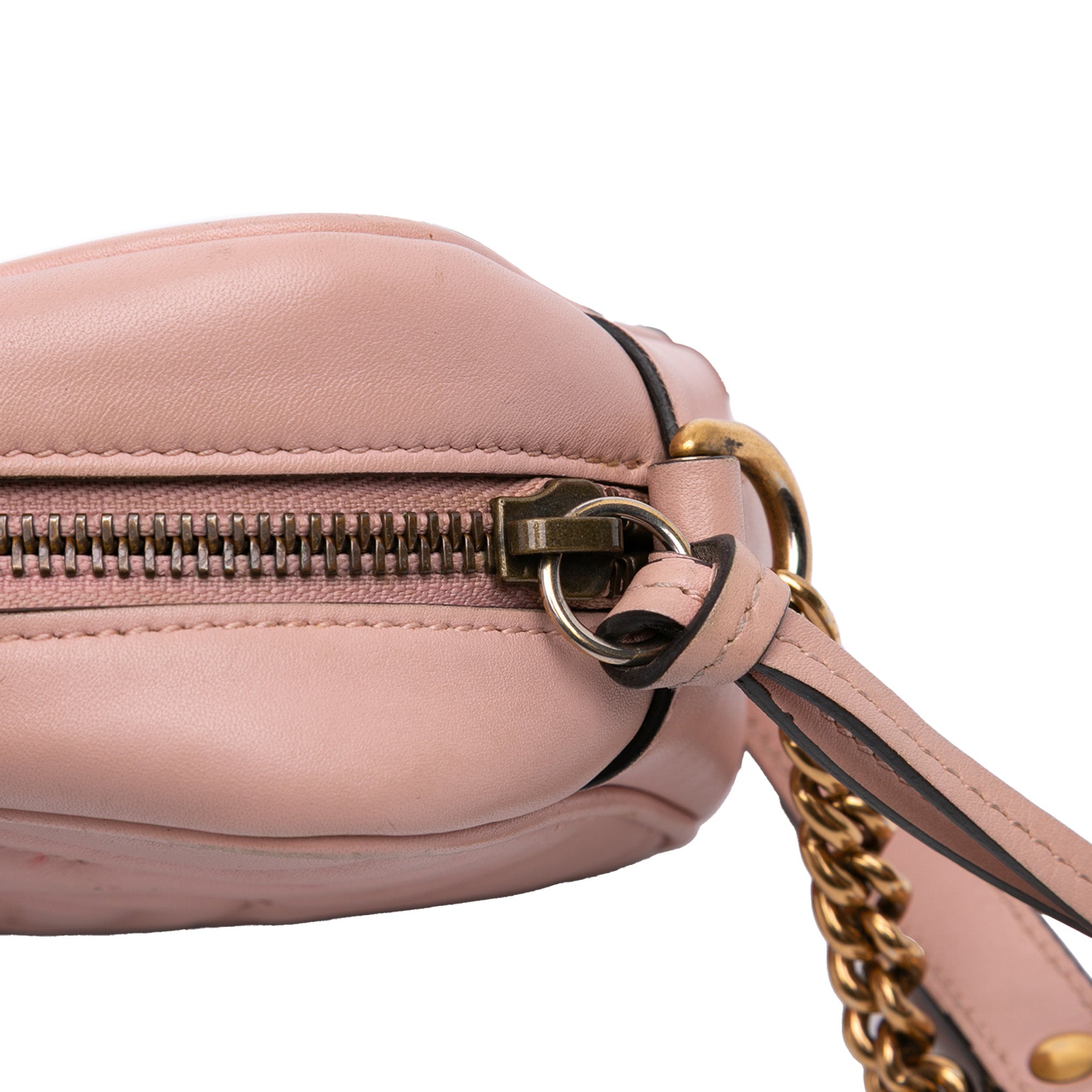 The Mini Marmont Crossbody bag features a quilted leather body, a curb chain strap with leather guard, a top zip closure, and an interior slip pocket. Retail Price: 2550.00