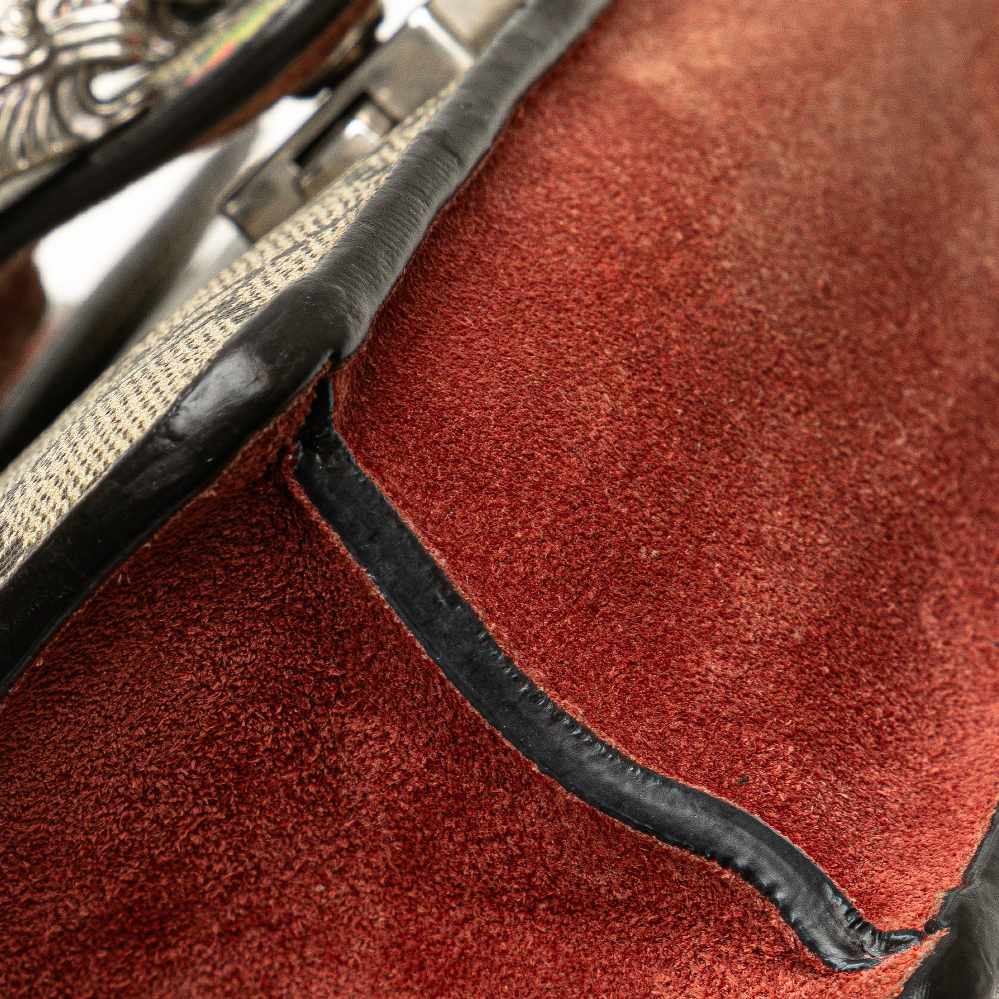 This crossbody bag features a printed coated canvas body with suede leather trim, a chain link strap, and a top flap with push lock closure. Retail Price: 2400.00