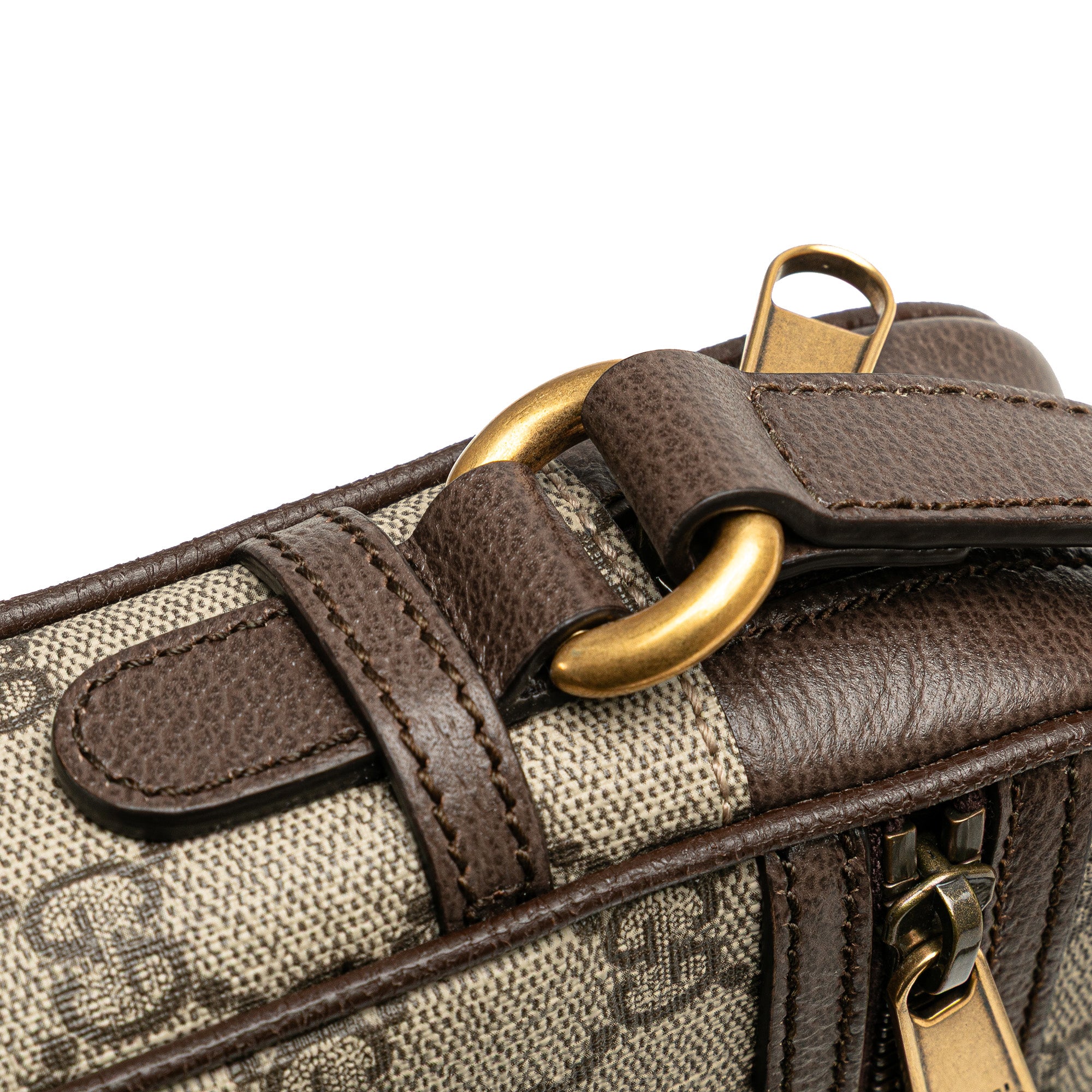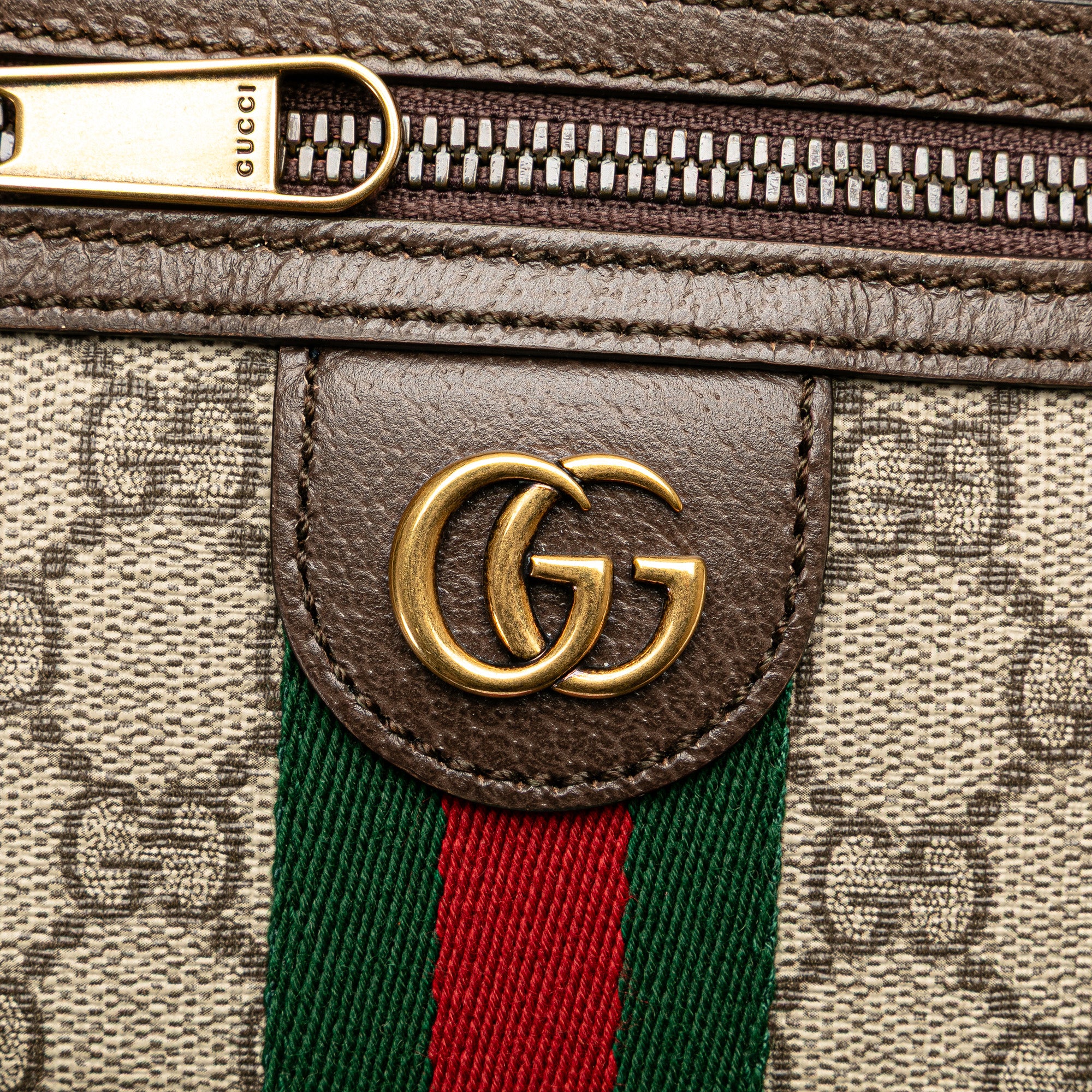 The Ophidia crossbody features a coated canvas body with leather trim, a flat leather strap, a top zip closure, and an exterior front zip pocket. Retail Price: 1250.00