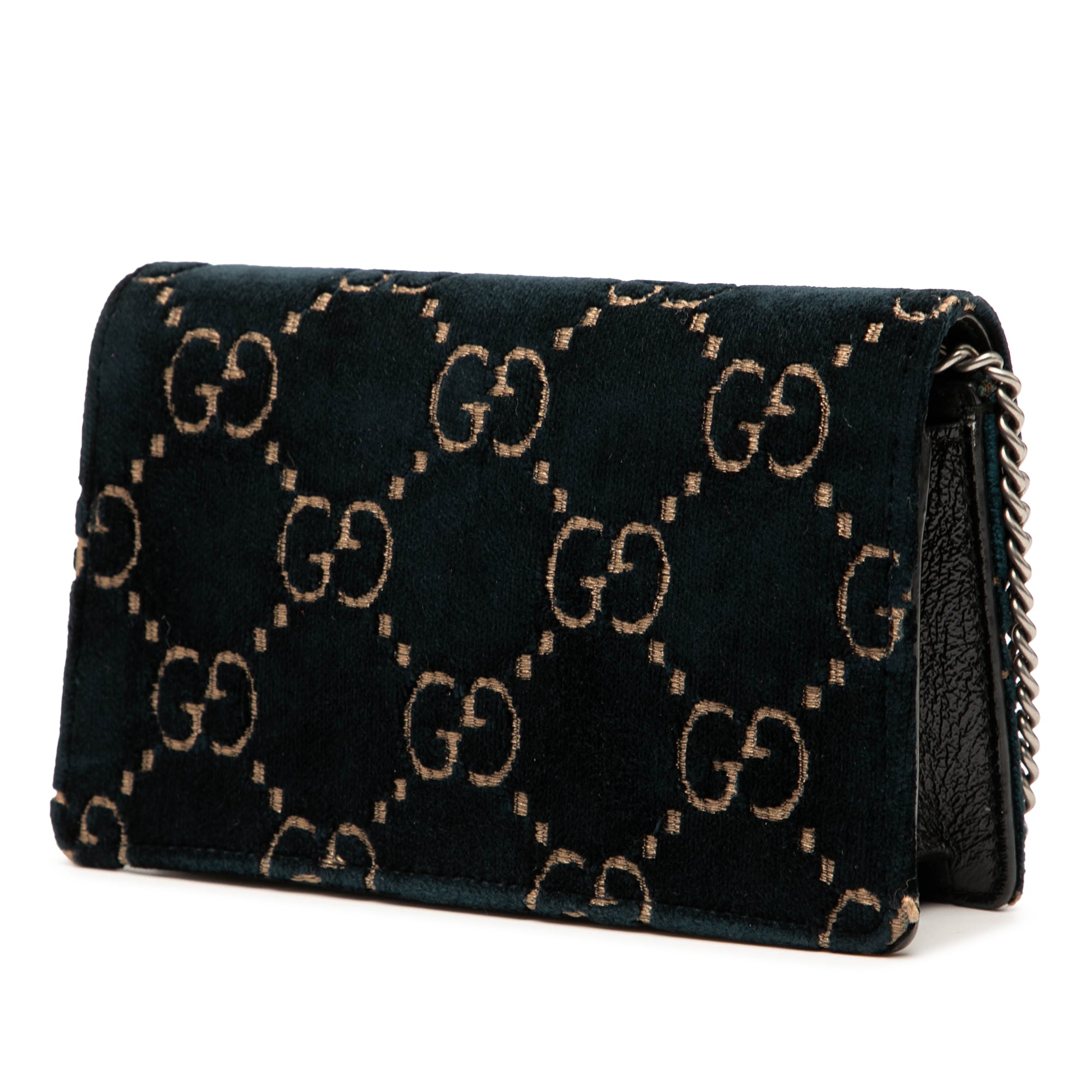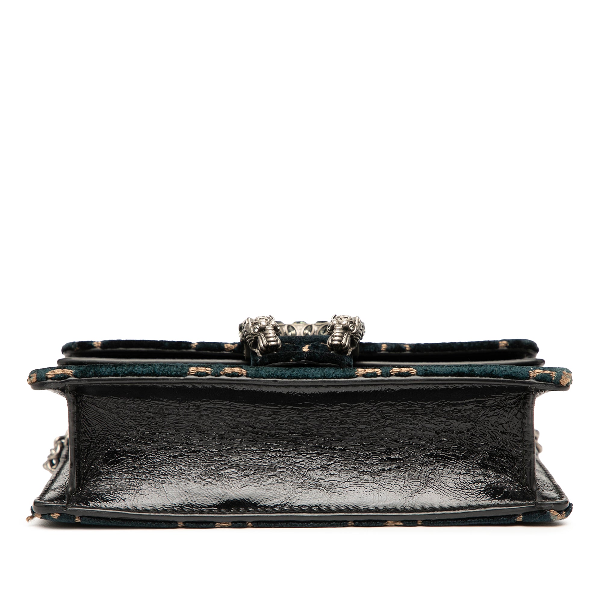 The Dionysus features a velvet body with leather trim, a silver-tone curb chain strap, and a top flap with snap closure. Retail Price: 875.00