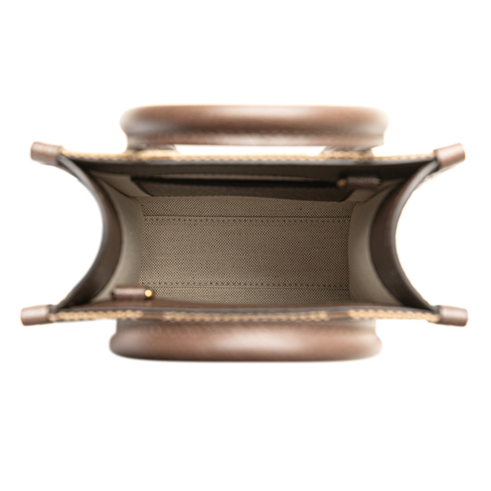 This satchel features a canvas body with leather trim, rolled leather handles, a detachable web canvas strap, an open top, and an interior slip pocket. Inclusion: Dust bag. Retail Price: 1650.00