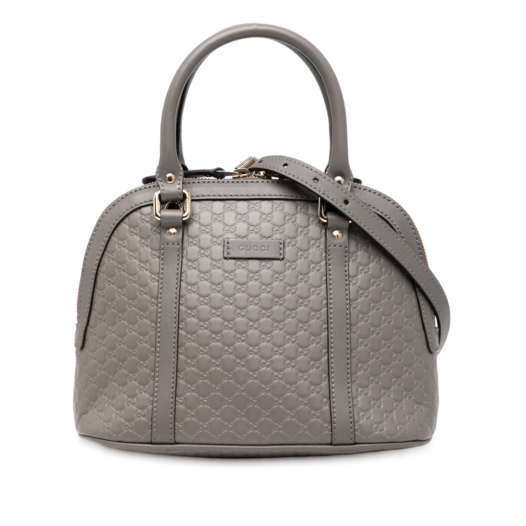 The Mini Dome satchel features an embossed leather body, rolled leather handles, a detachable flat strap, a top zip closure, and an interior slip pocket. Retail Price: 1895.00